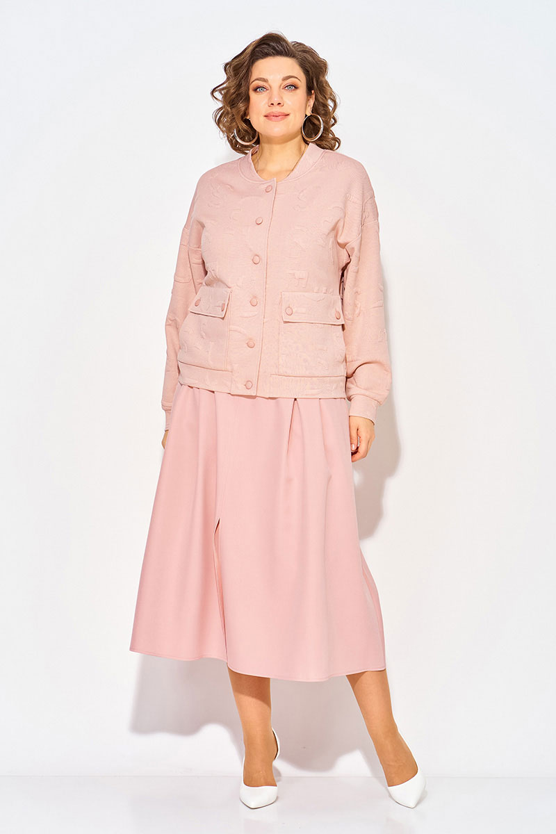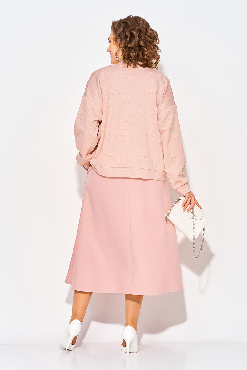 В комплект входит юбка длиной миди А-силуэта на притачном поясе с резинкой. По переду заложены складки, имеются боковые карманы. Пикантность образу придает разрез по центру юбки. Застежка – юбочная тесьма-молния по центральному шву спинки. Идеален для женщин, девушек и подростков, которые ценят комфорт, свободу движений и универсальность. Такой модный костюм  станет отличным выбором как для повседневных образов, так и для встреч, прогулок и мероприятий.