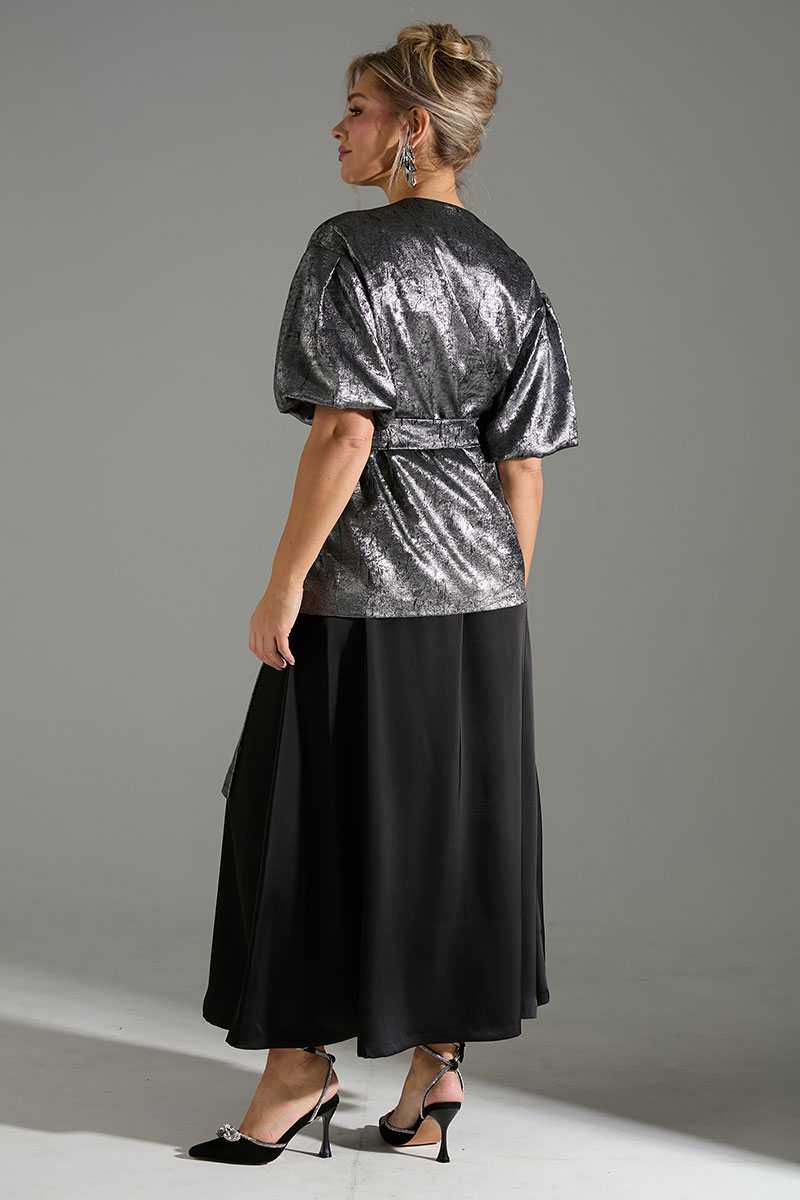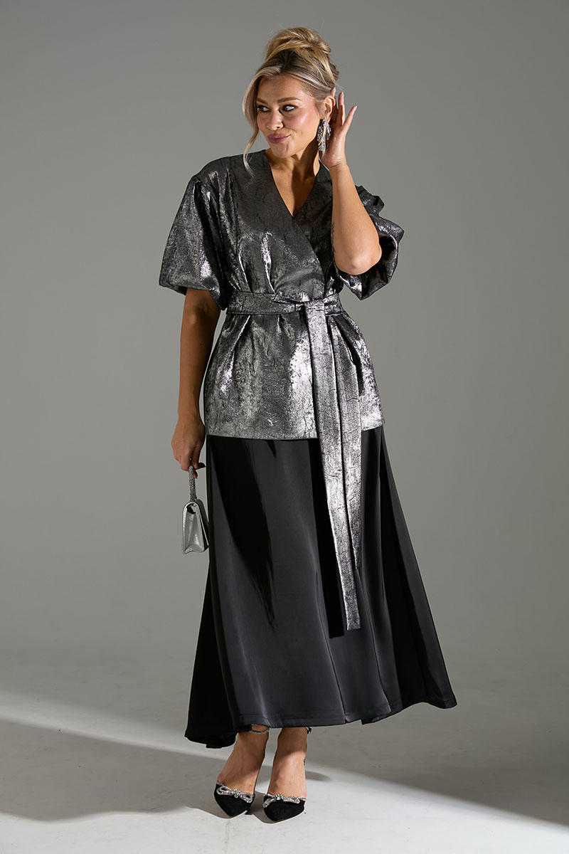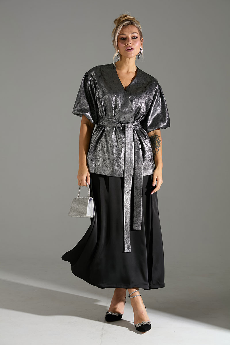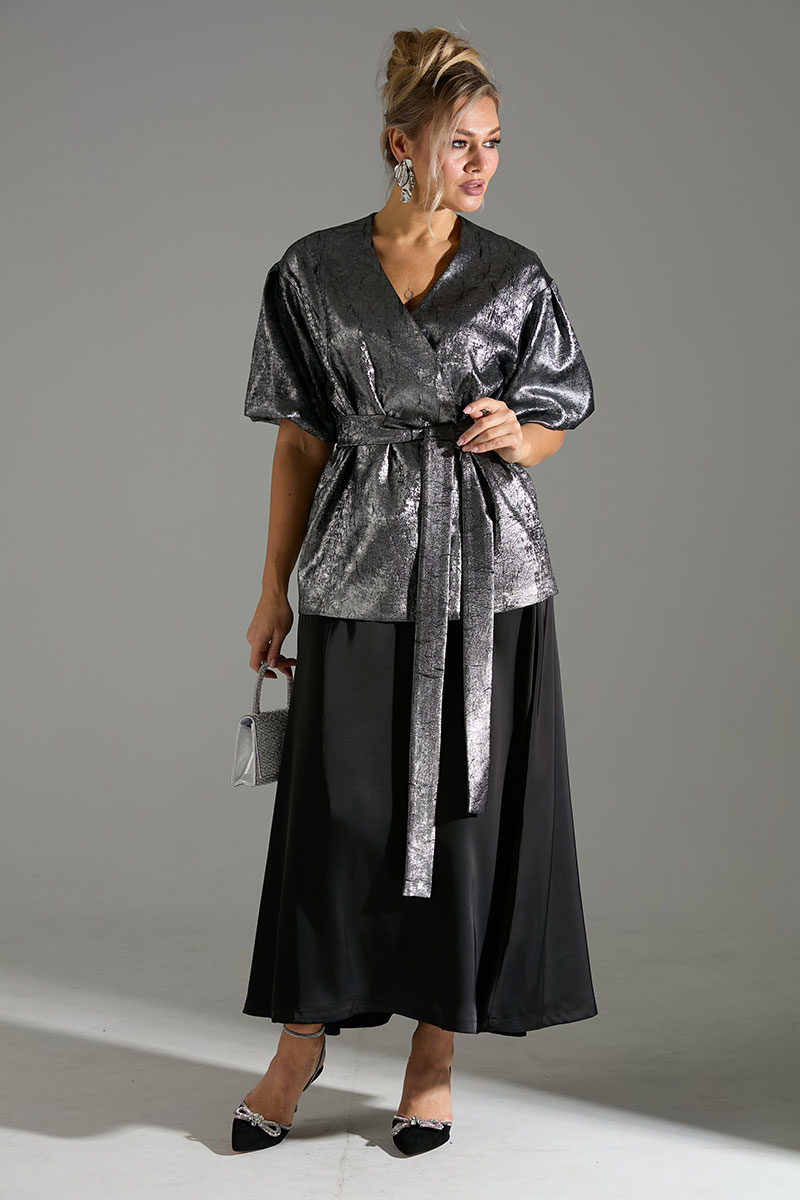 Комплект 2-ка, состоящий из жакета и юбки. Легкий жакет на подкладке с объёмными рукавами. Перед на запах с застежкой на кнопки, под пояс по талии. Юбка кроя трапеция, длина макси.