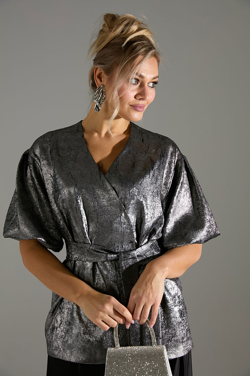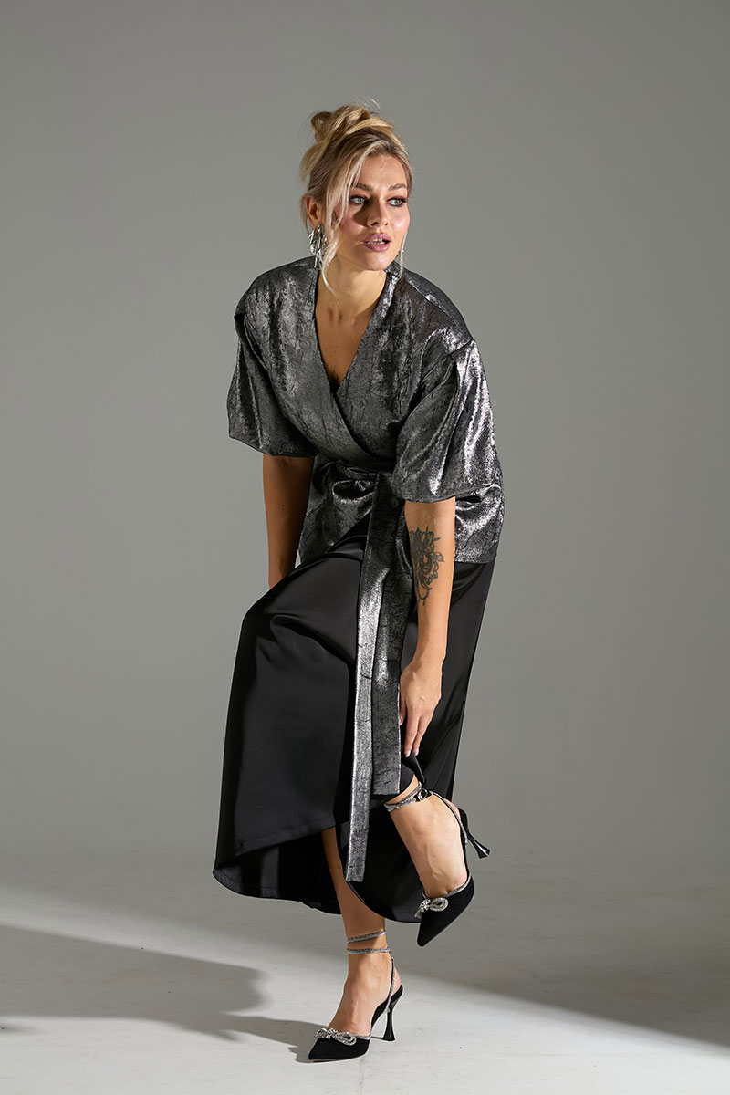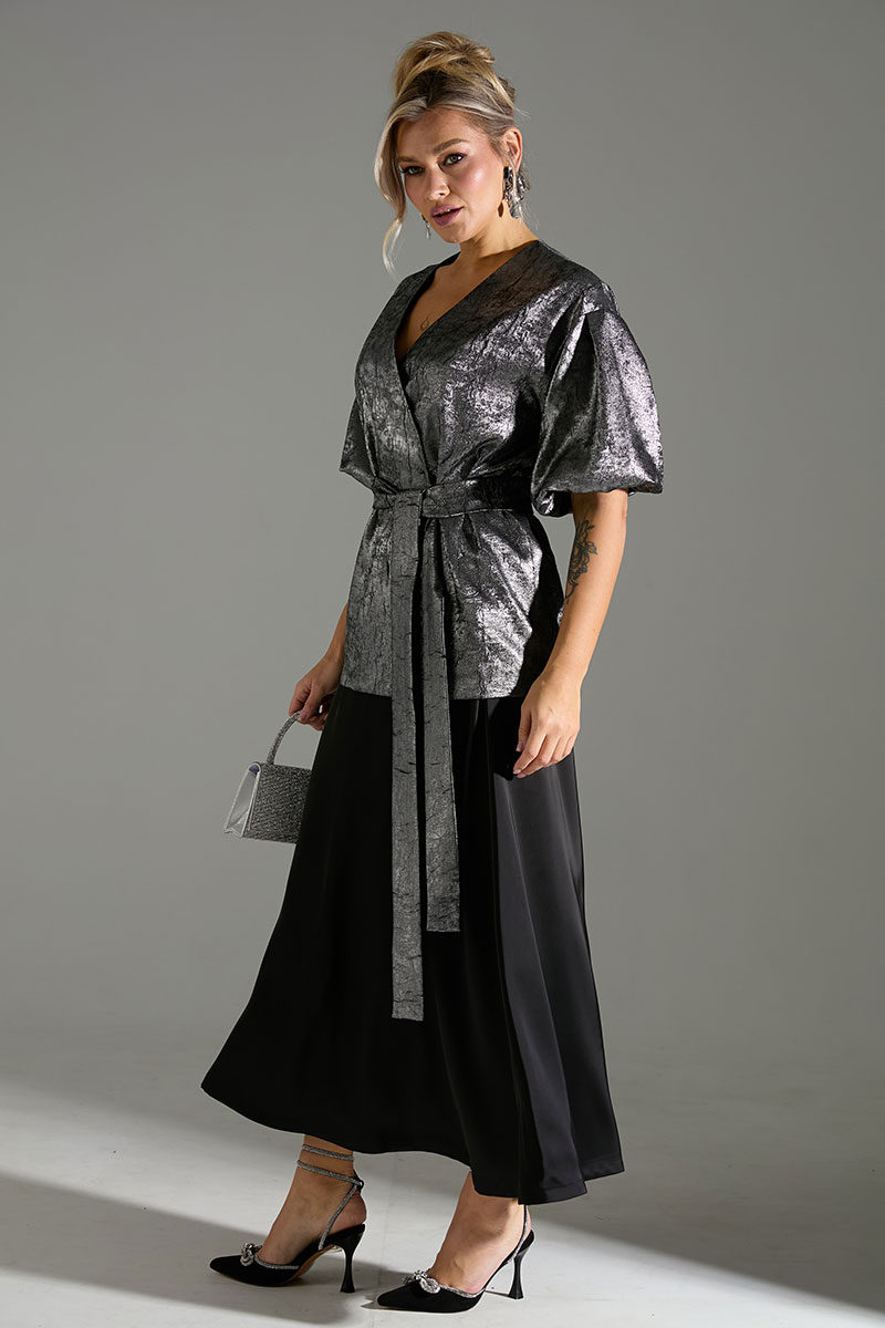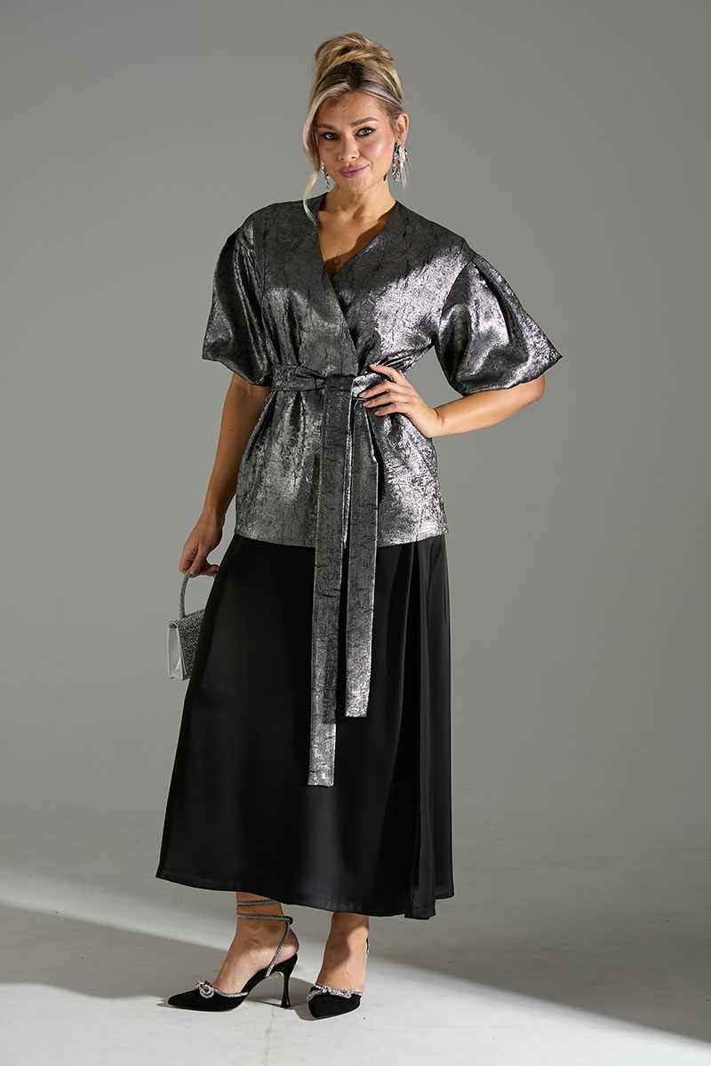 Комплект 2-ка, состоящий из жакета и юбки. Легкий жакет на подкладке с объёмными рукавами. Перед на запах с застежкой на кнопки, под пояс по талии. Юбка кроя трапеция, длина макси.