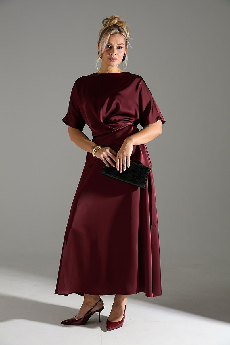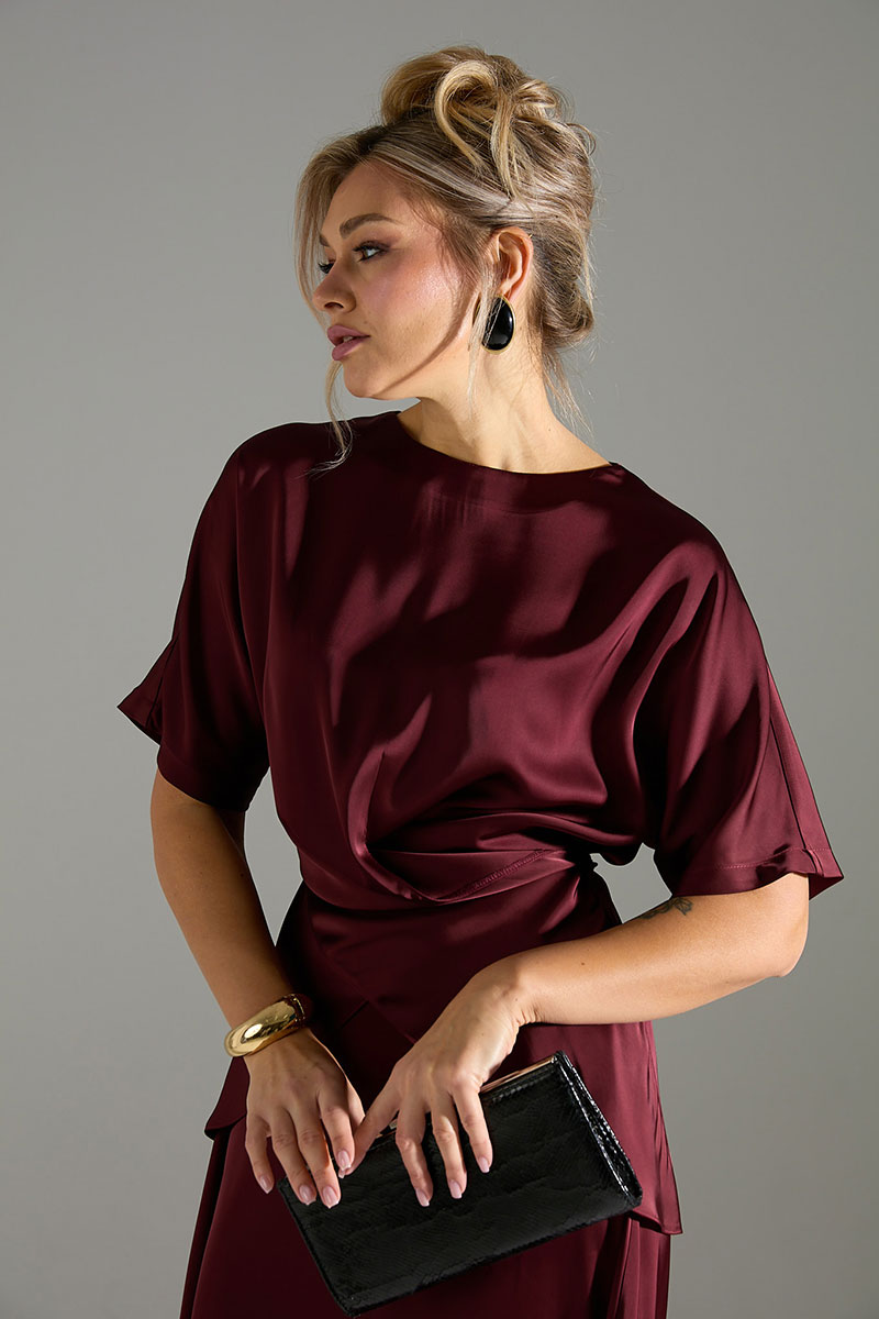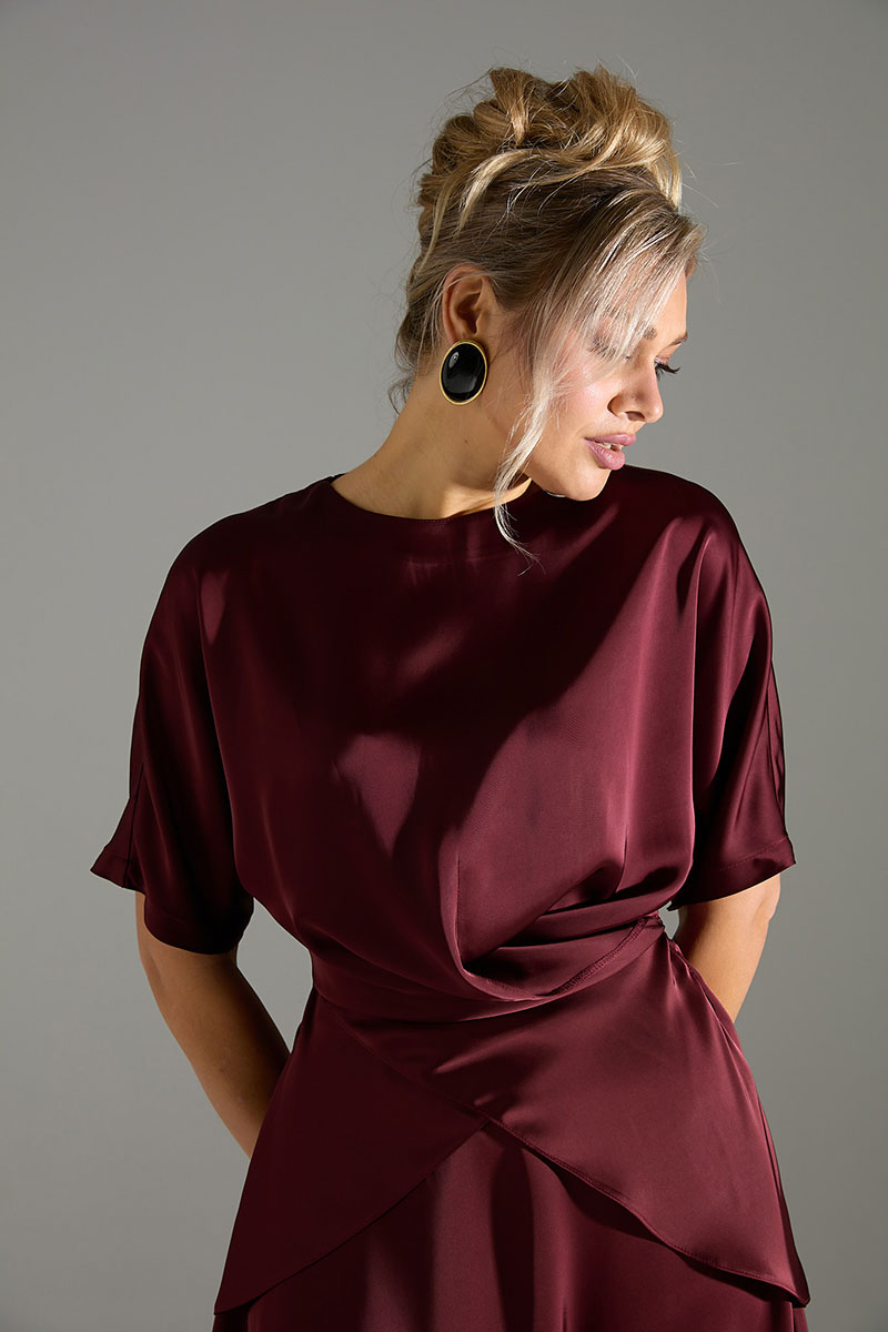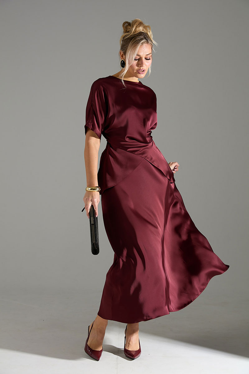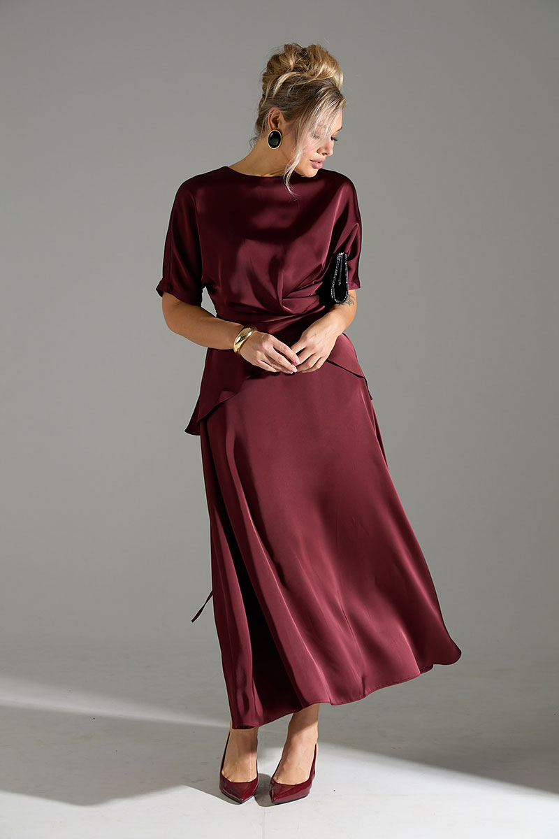 Костюм 2ка из лёгкой струящейся ткани с атласным благородным блеском, состоящий из блузки и юбки. Блузка свободного объёма, по переду имитация застежки на запАх. В комплекте шнур из основной ткани, которым можно приталить блузу, обвязав по кругу, или продеть через боковые швы и завязать по спинке. Юбка широкого объёма, длины "миди".