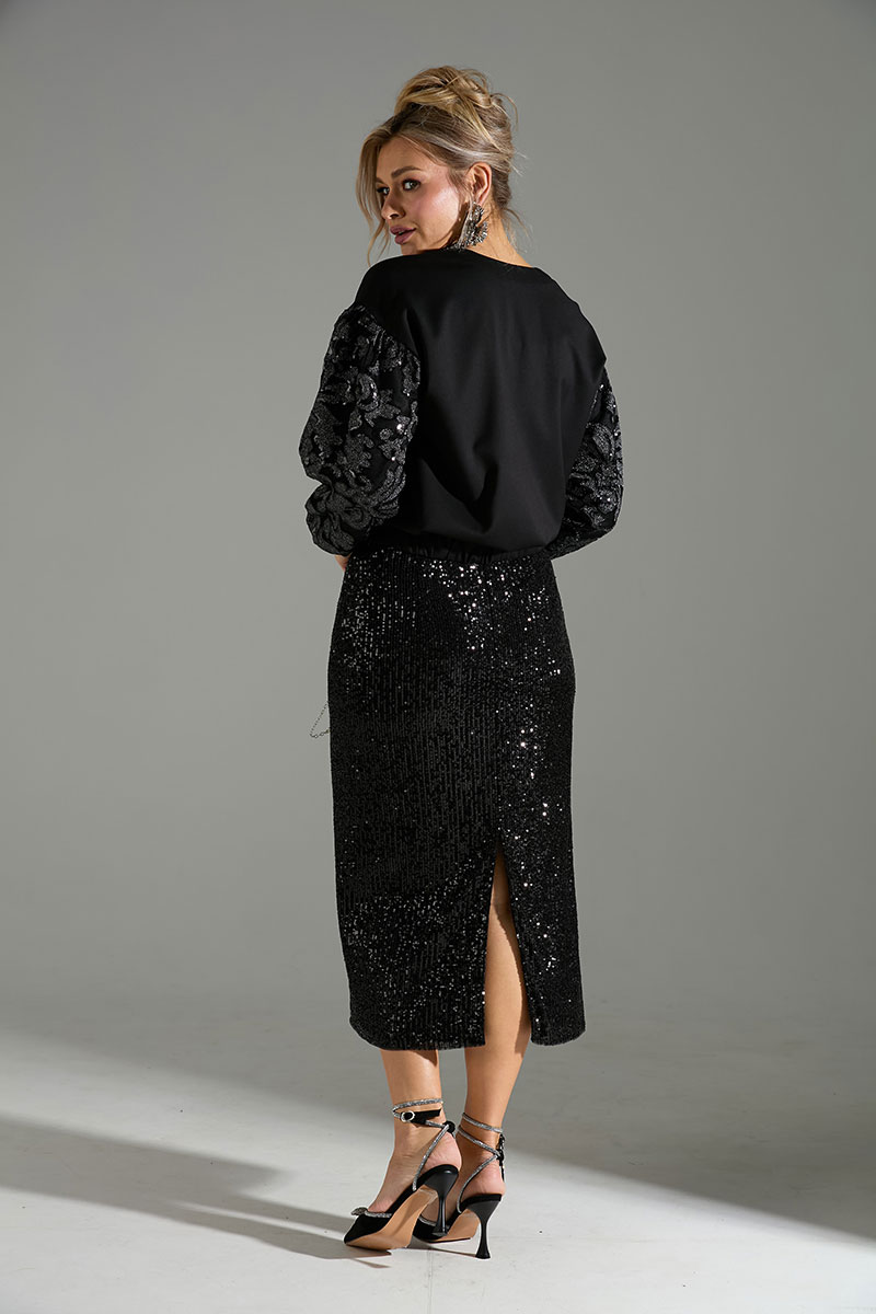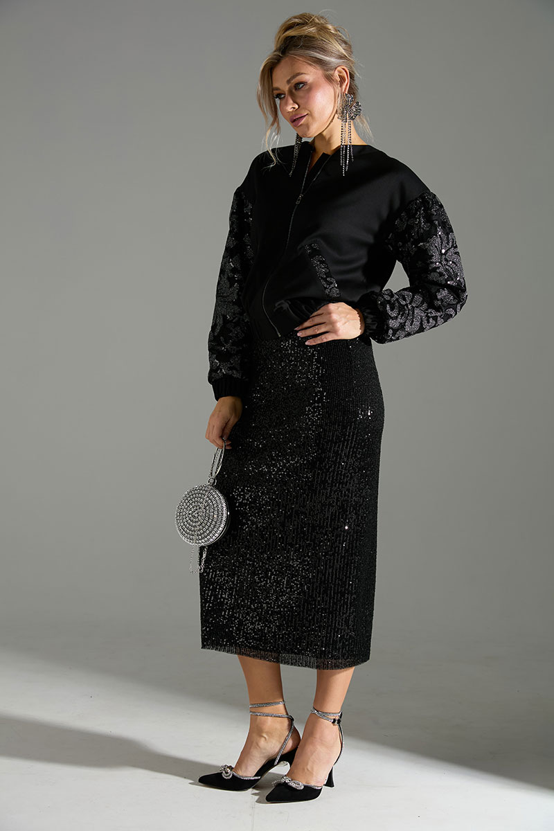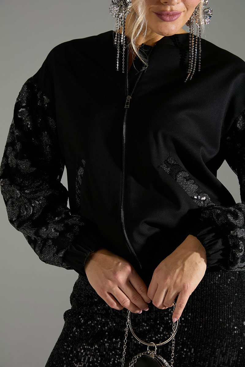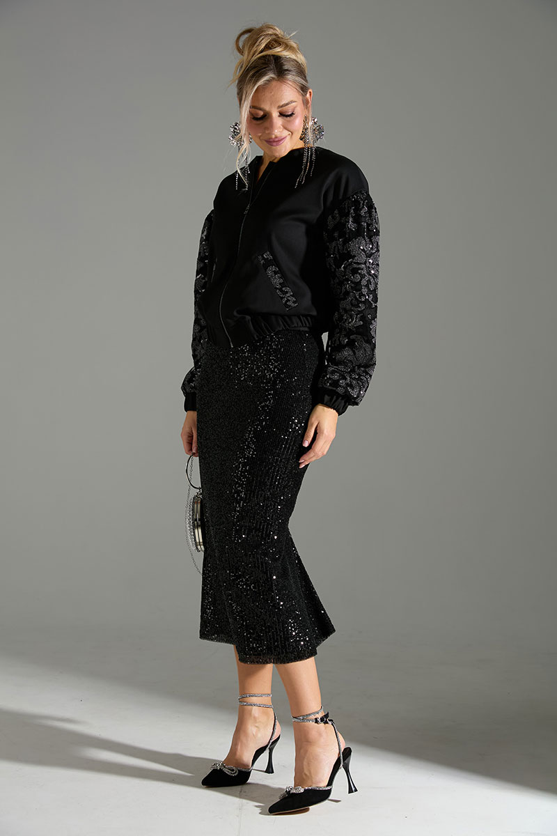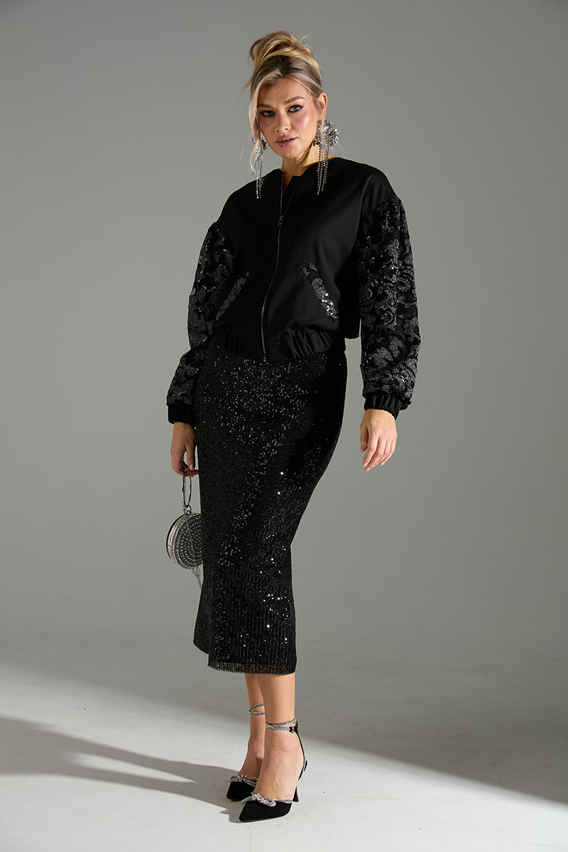 Комплект 2ка, состоящий из бомбера и юбки. Бомбер свободного силуэта с объёмными рукавами и застёжкой на молнию. Манжеты и низ бомбера на резинке. Карманы и рукава бомбера декорированы кружевной тканью расшитой пайетками. Юбка- карандаш длиной ниже колена прямого силуэта. Пояс юбки и подкладка выполнены из эластичного трикотажа. Верхний слой юбки из лёгкой ткани расшитой пайетками. Застёжка на потайную молнию в среднем шве по спинке, разрез расположен внизу среднего шва.
