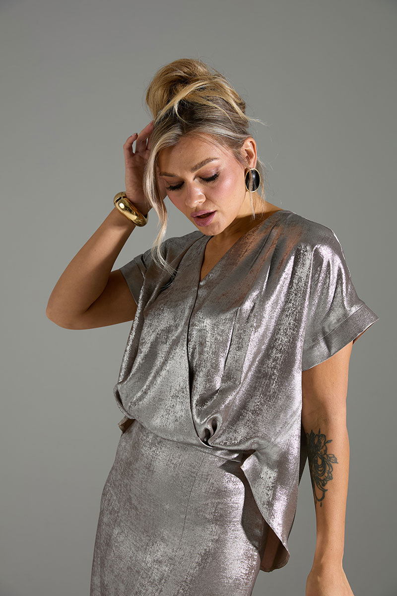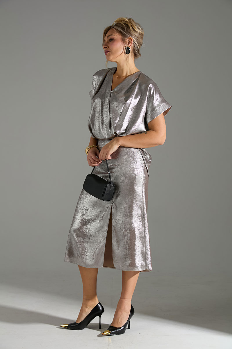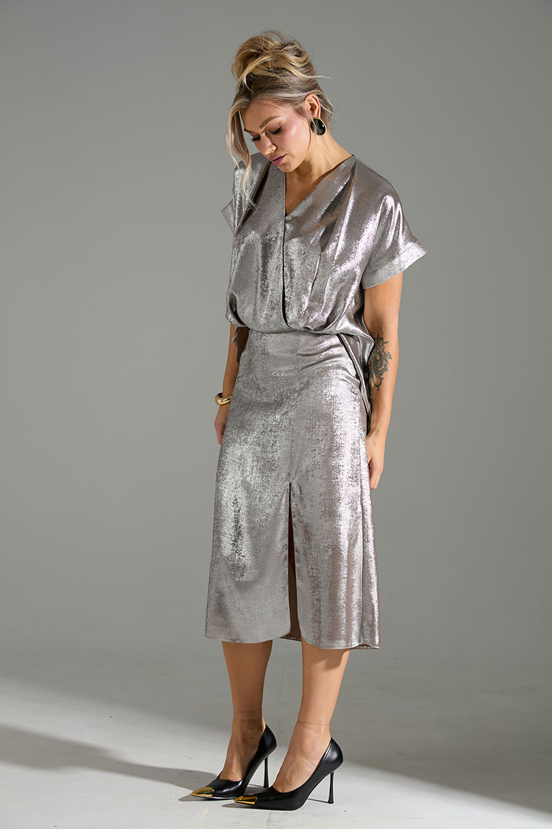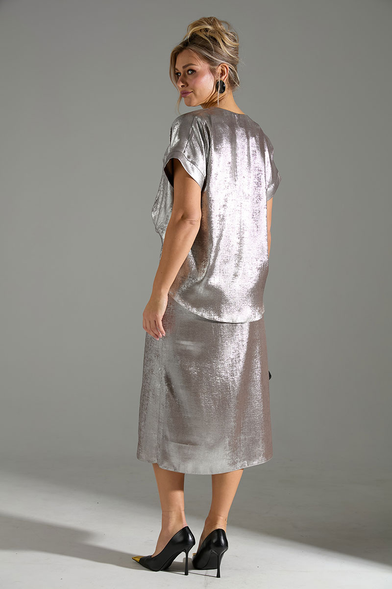 Комплект 2ка, состоящий из блузки и юбки. Блузка свободного силуэта с короткими рукавами. Горловина V-образная. Низ блузки разноуровневый: спереди короче, сзади длиннее. Блузка по талии может соединяться с юбкой с помощью молнии , создавая имитацию платья.