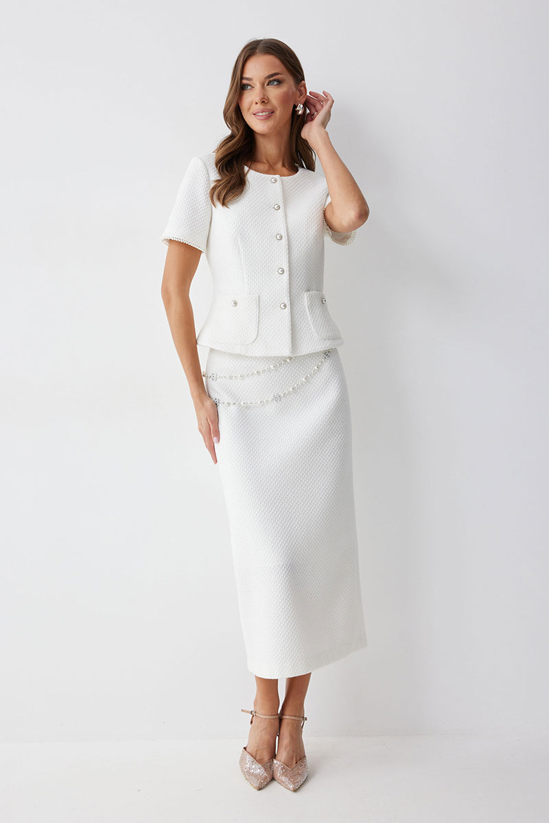 Жакет полуприлегающего силуэта из трикотажного полотна. Горловина округлая по центру застежка на петли и пуговицы. Рукав втачной короткий. По переду талиевые вытачки и накладные карманы, на спинке – талиевые вытачки. Жакет на подкладке. Обращаем ваше внимание, что фурнитура может отличаться от фото.