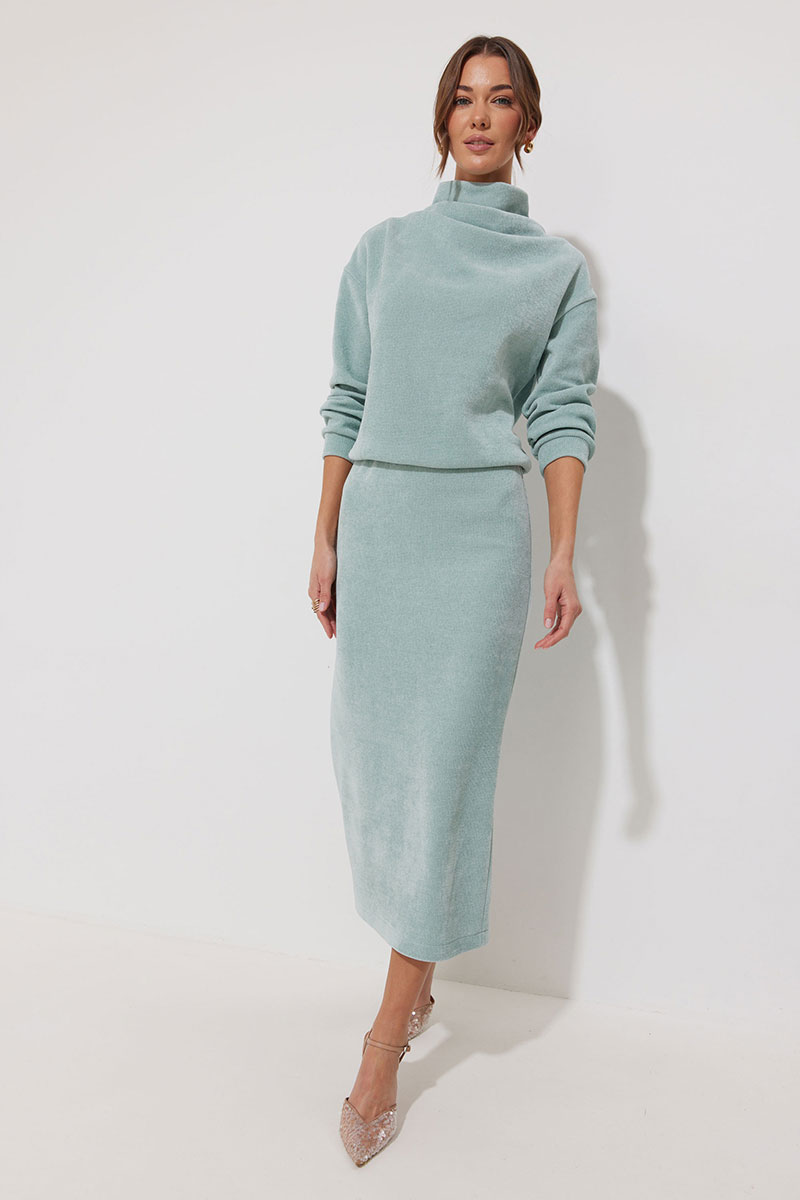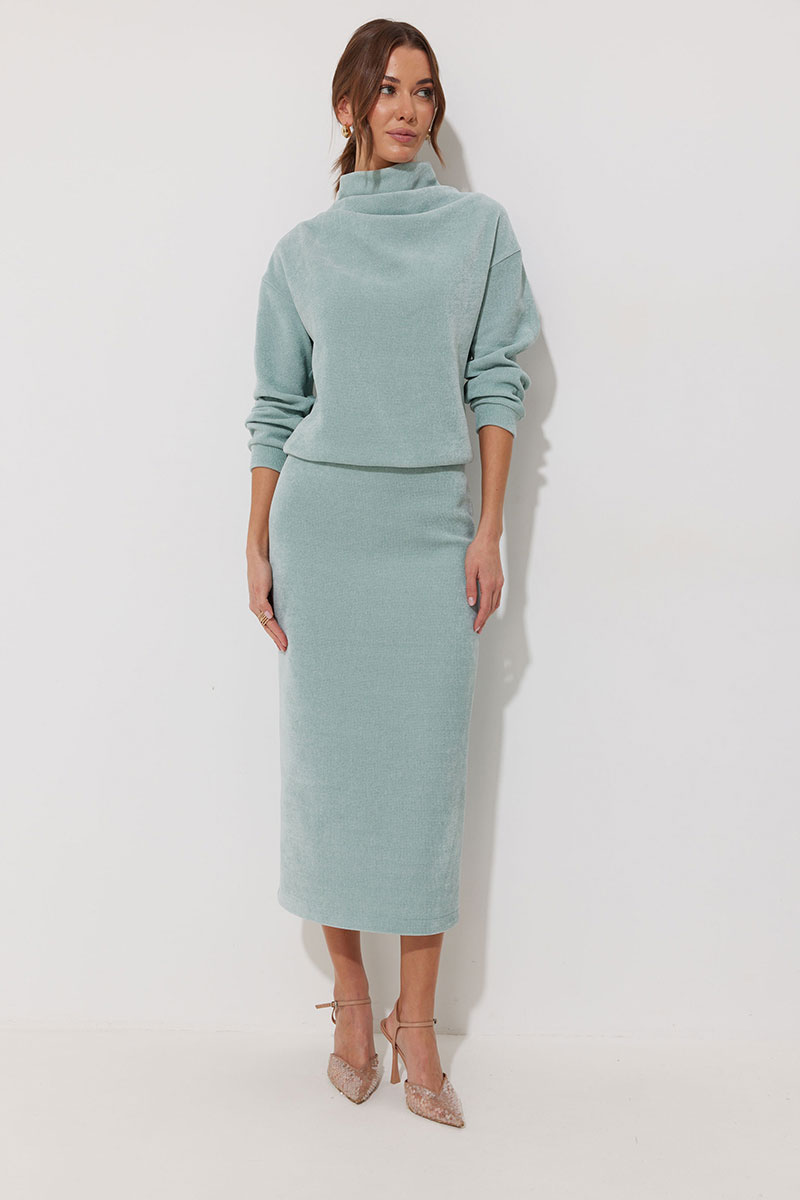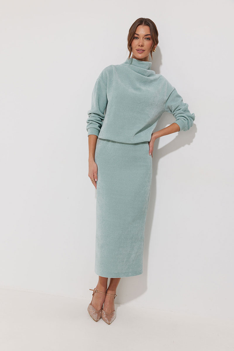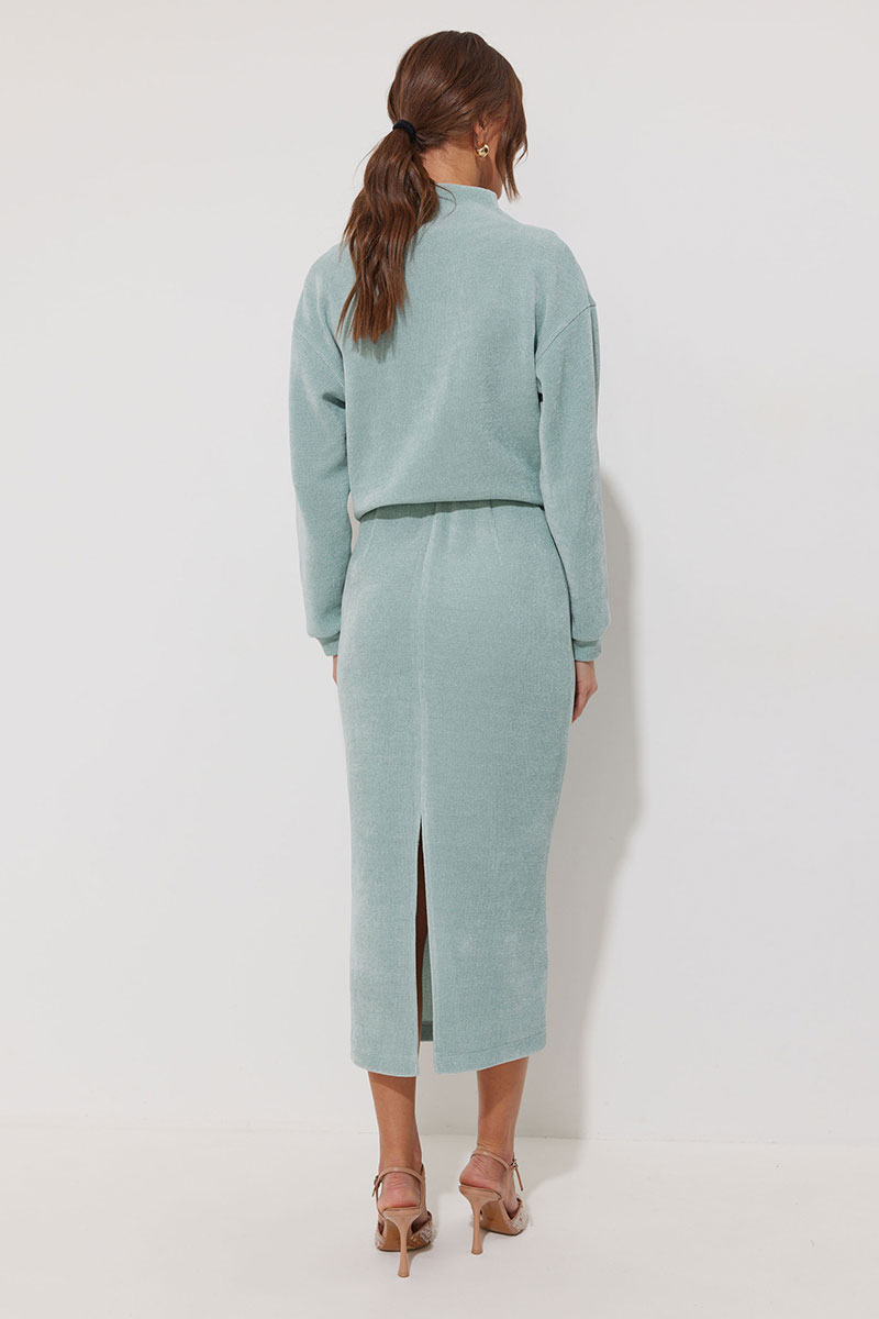 Юбка из трикотажного полотна, длина миди. Прямого силуэта. По верхнему срезу резинка. По среднему шву заднего полотнища разрез. Юбка на трикотажной подкладке.