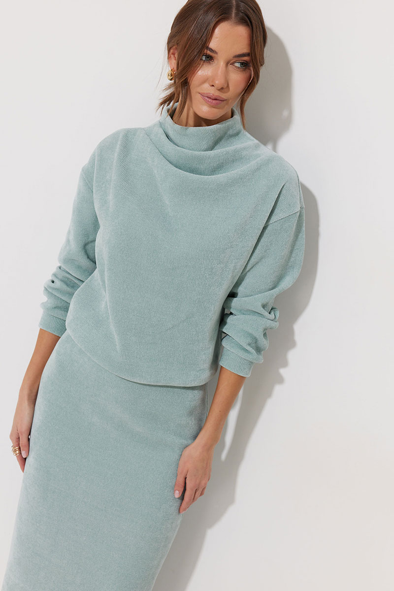 Джемпер из трикотажного полотна, прямого, слегка расширенного силуэта, со спущенной линией плеча. По горловине цельнокроеная стойка. На стойке и плече две складки. Рукав длинный с манжетой. По низу джемпера пояс.
