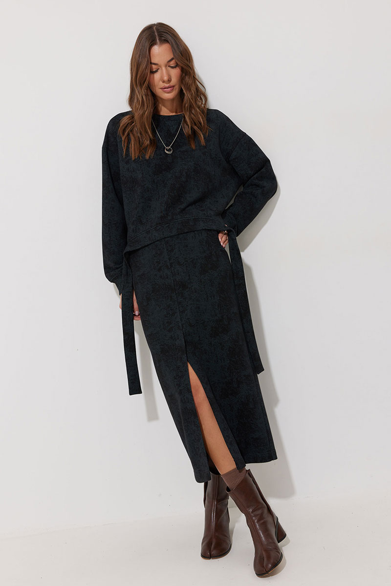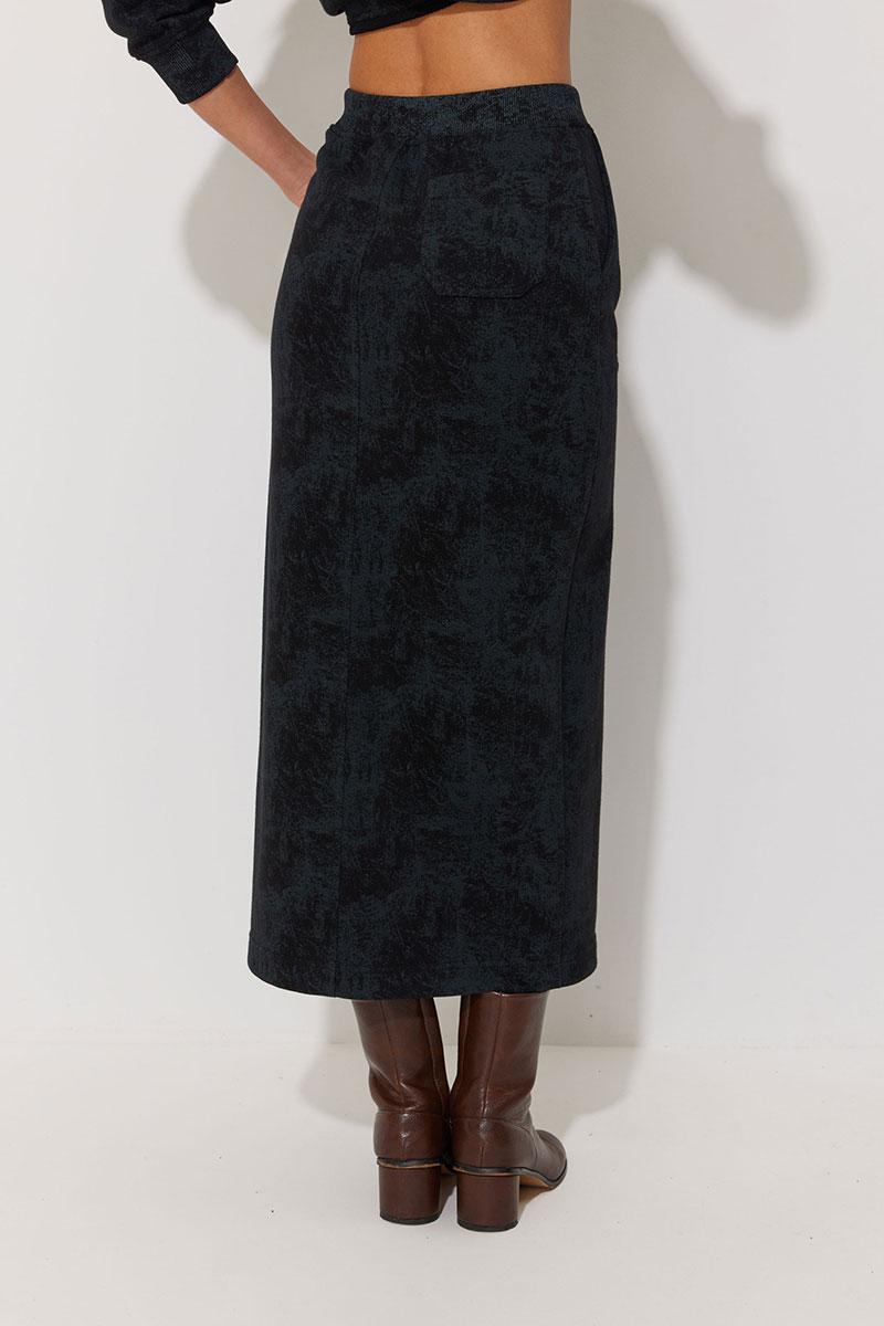 Юбка полуприлегающего силуэта из трикотажного полотна. По верху юбки притачной пояс с резинкой. По переду средний шов со шлицей и карманы. На заднем полотнище юбки накладные карманы.