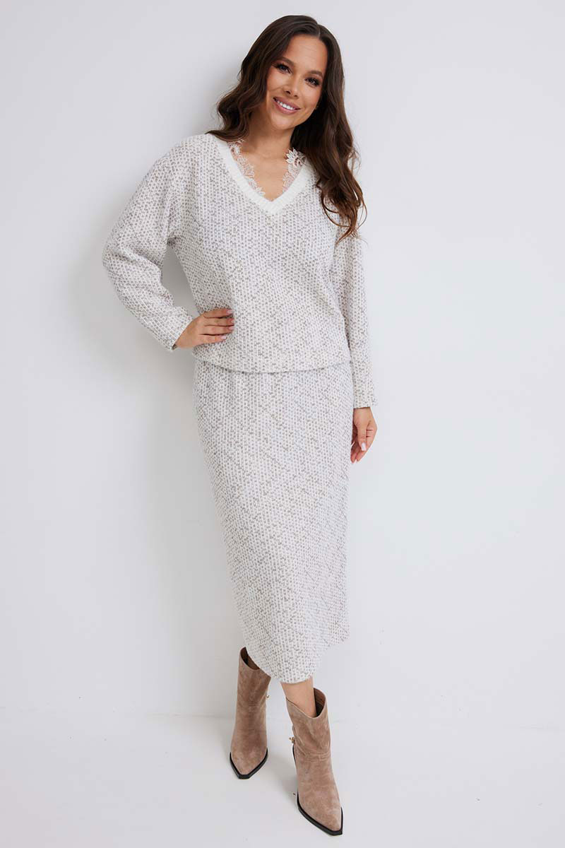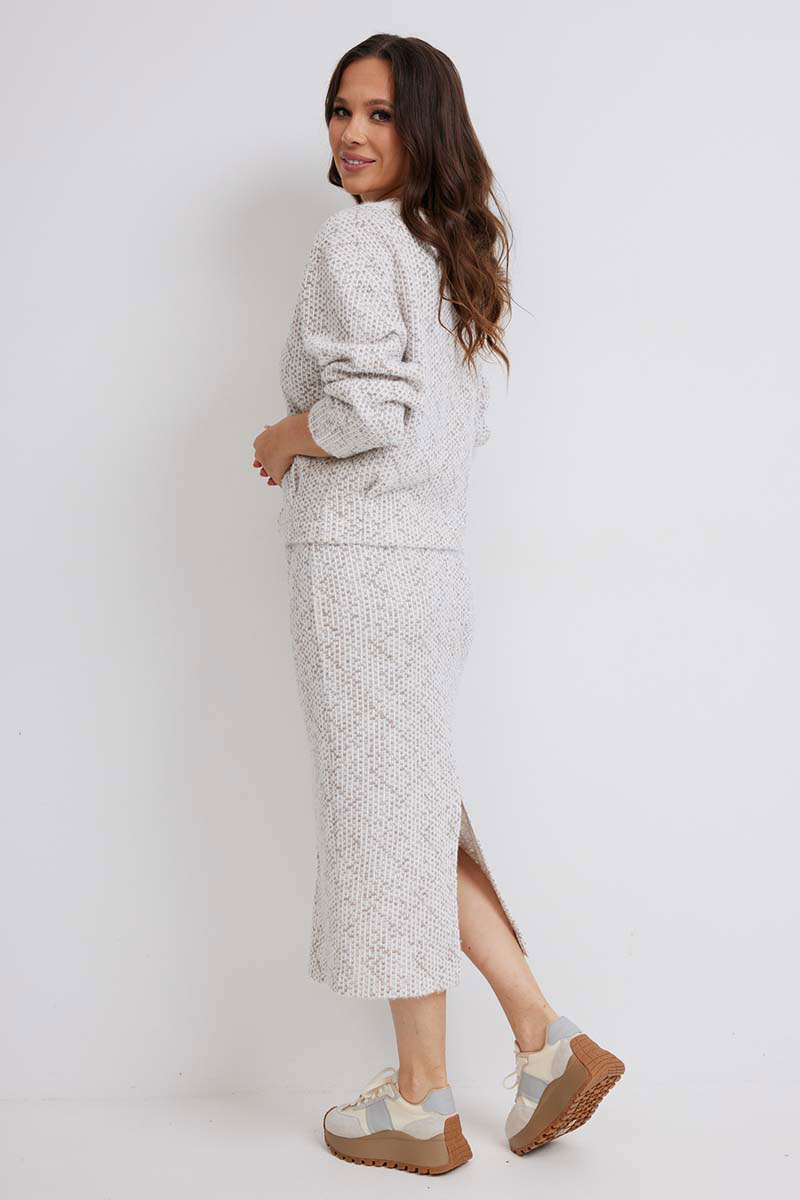 Элегантный и нежный комплект из джемпера и юбки, выполненных из вязаного, слегка пушистого трикотажного полотна с россыпью мелких, слегка мерцающих пришивных пайеток.