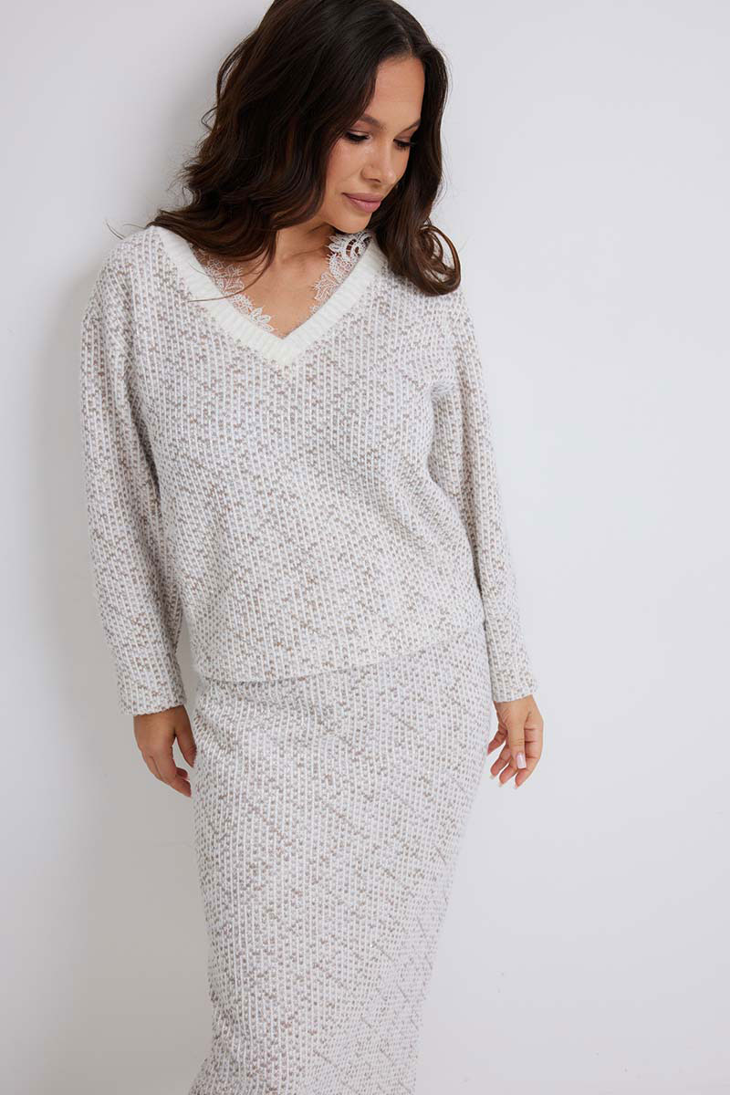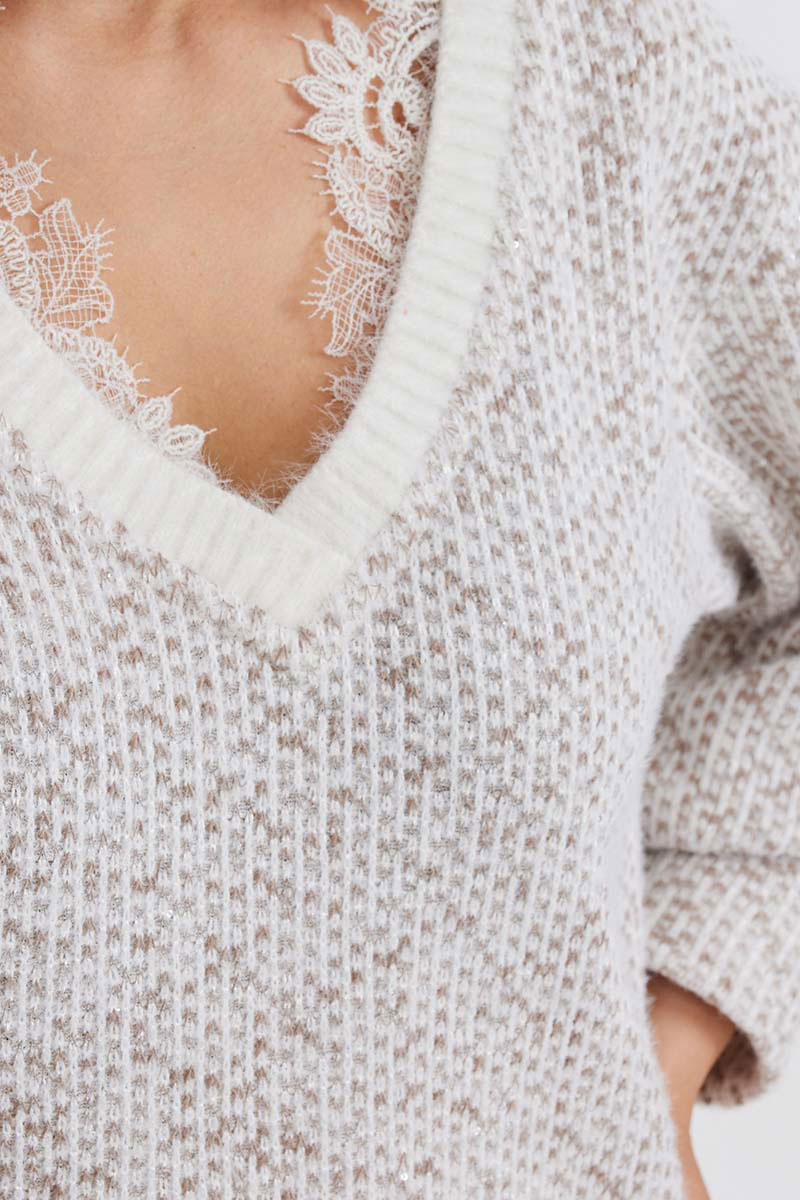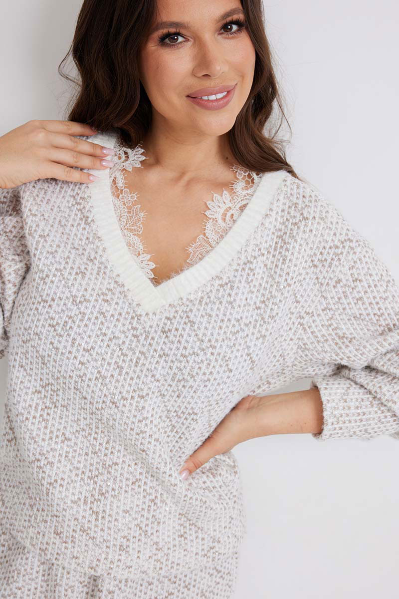 Джемпер свободного кроя со спущенной линией плеча. Горловина с V- образным вырезом, дополненным нежным кружевом.