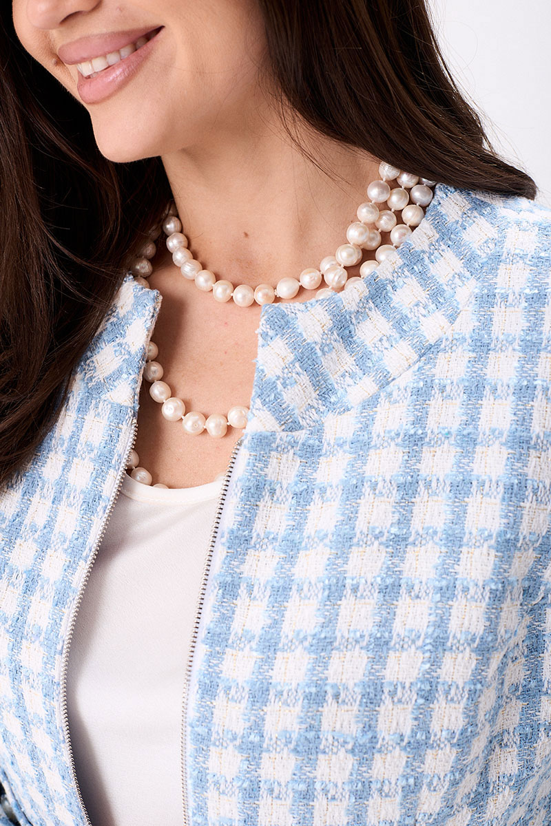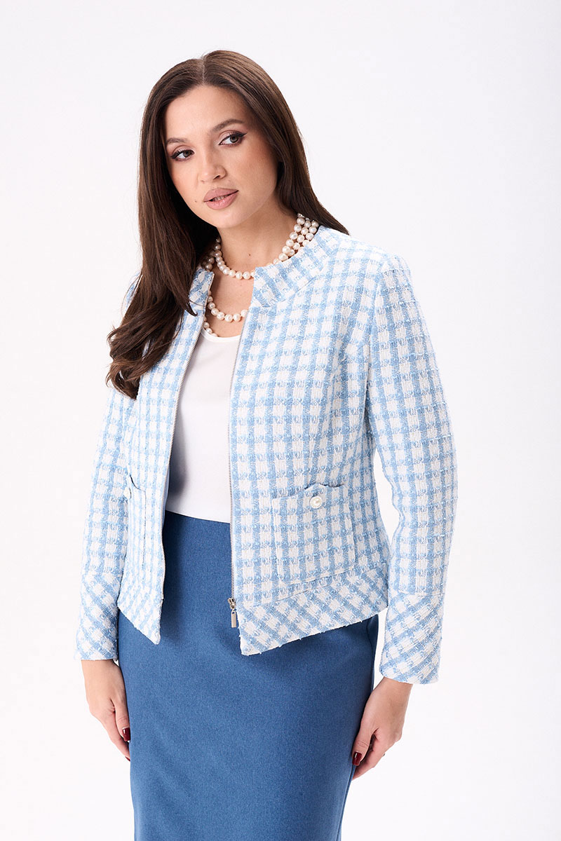 Жакет на подкладке. По переду нагрудные вытачки, накладные фигурные карманы, застёжка на тесьму молния. Спинка с талевыми вытачками и центральным швом. По горловине и низу жакета притачная планка. Горловина круглая. Рукава двухшовные втачные на широкой манжете.