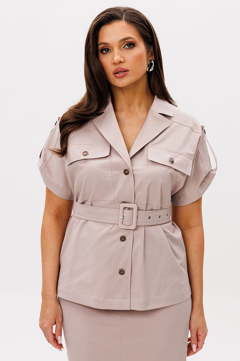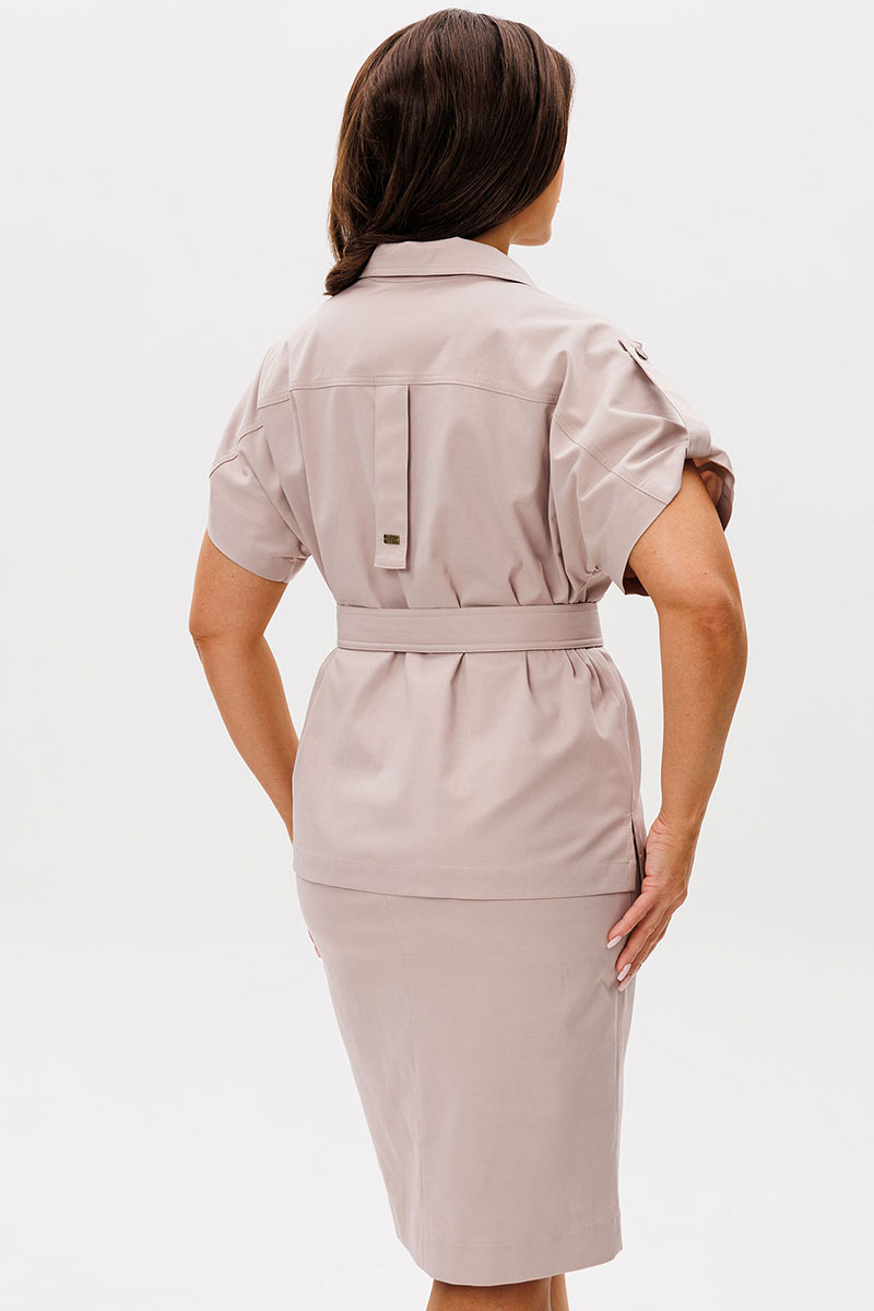 Жакет со спущенными рукавами и патами. Перёд жакета с кокетками, накладными карманами с клапанами на застёжках металлических пуговицах. Воротник отложной на стойке с лацканами классической формы. По спинке кокетка и приточная пата с декоративной нашивкой.