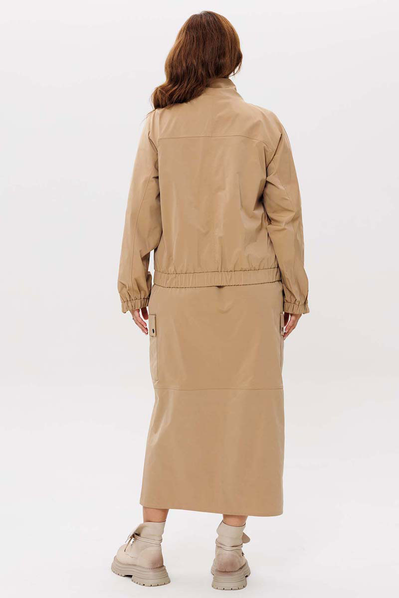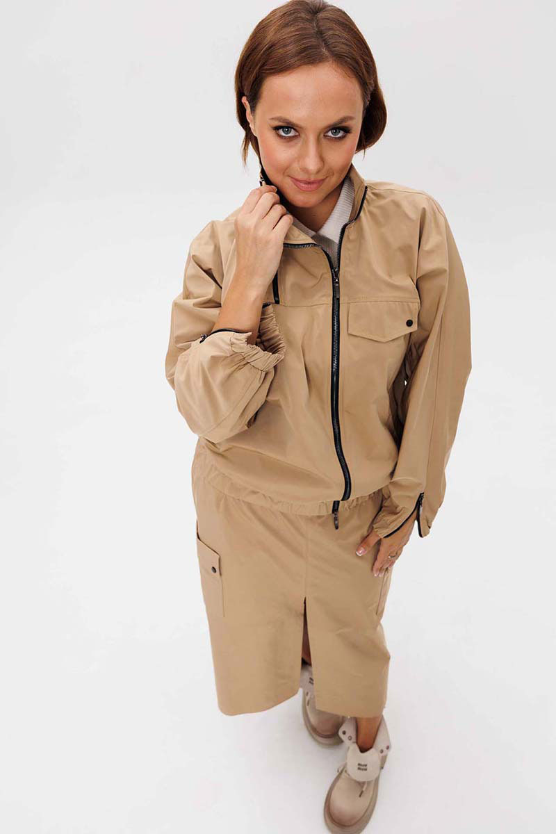 Костюм женский состоит из жакета и юбки выполнены из плащевой ткани. Жакет свободный с цельнокроеными рукавами, без подкладки, по низу притачная планка, в которую продета резинка. По переду горизонтальный подрез, прорезные карманы с листочкой , клапан с кнопкой, молния и застёжка на тесьму молния. Воротник стойка. По низу рукава резинка и застёжка небольшая молния. Юбка прямого силуэта на притачном поясе на резинке с фиксирующей затяжкой. По переду центральный шов заканчивается разрезом. Горизонтальный подрез по переду и спинке. По бокам большие накладные карманы с клапанами на кнопках. Юбка на подкладке.