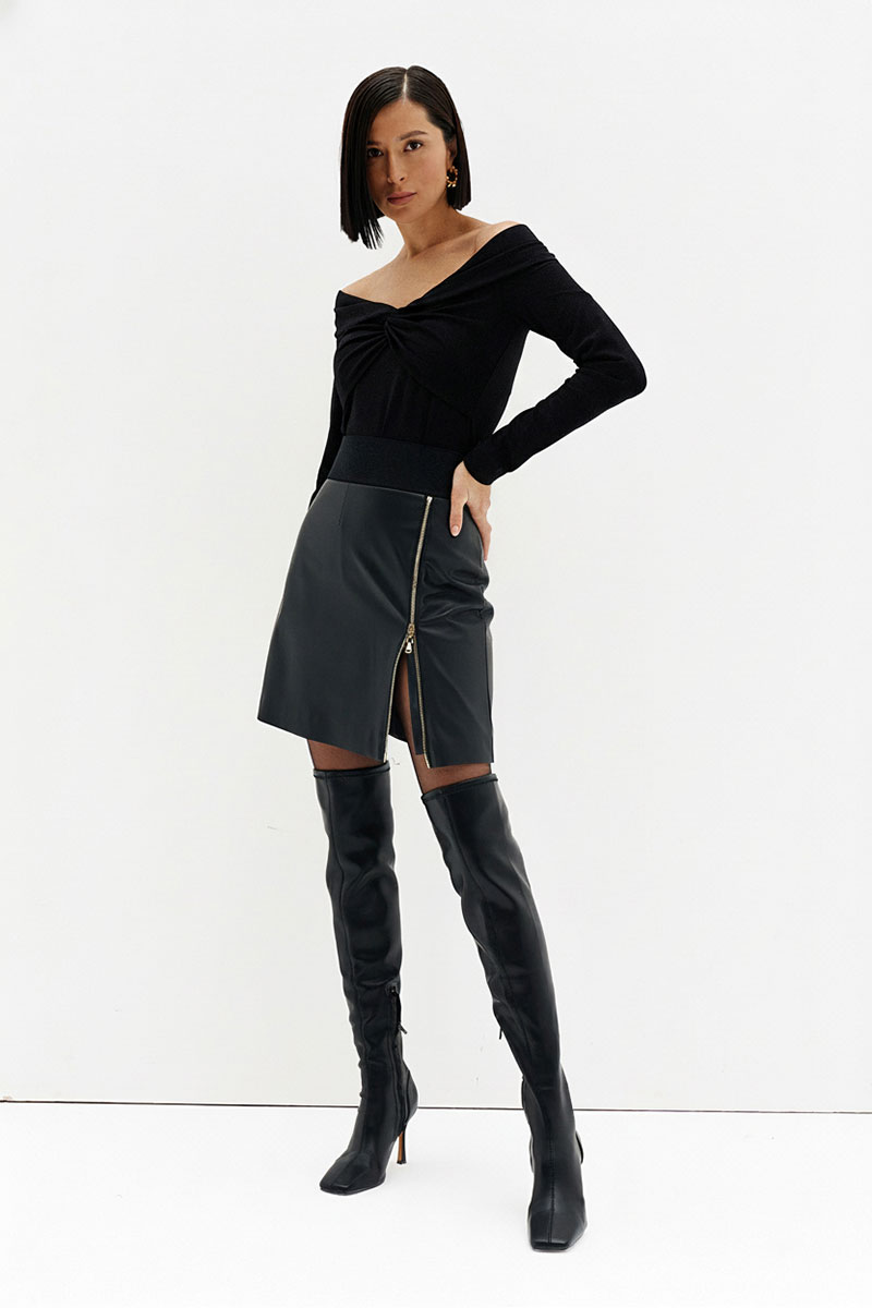 Блузка прилегающего силуэта в комплекте с ультрамодной юбкой мини для разнообразия повседневных и выходных образов.