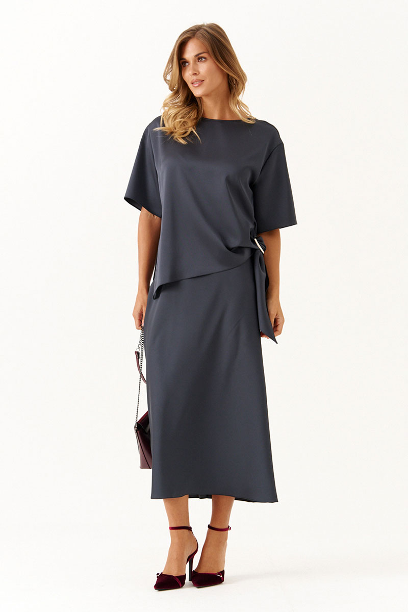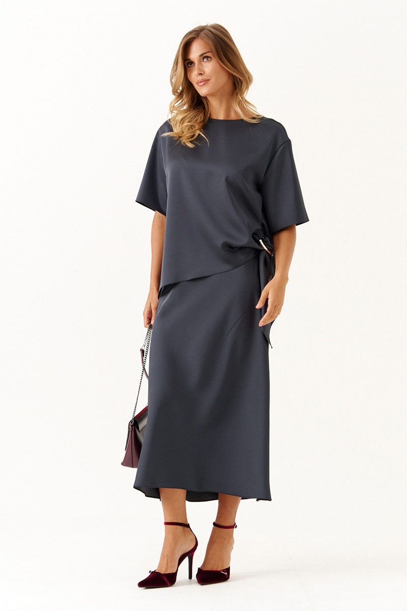 Этот графитовый костюм сочетает в себе изящество атласа и удобство, прекрасно подходя как для повседневных образов, так и для более официальных мероприятий.