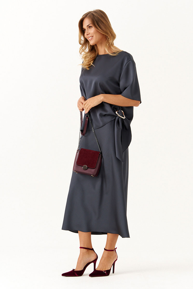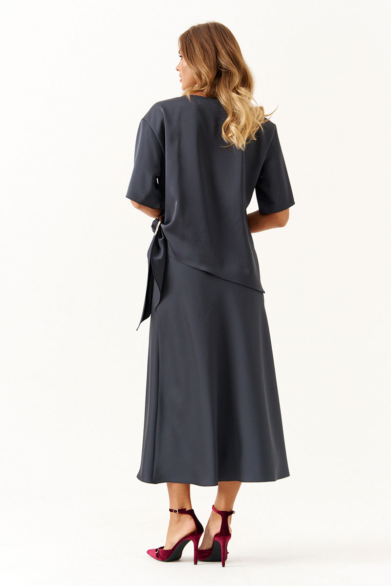 Блузка имеет прямой силуэт с расширенной горловиной, втачными рукавами длиной чуть ниже локтя и аккуратными боковыми разрезами, украшенными декоративным узлом с серебряной пряжкой, что придает образу изысканность.