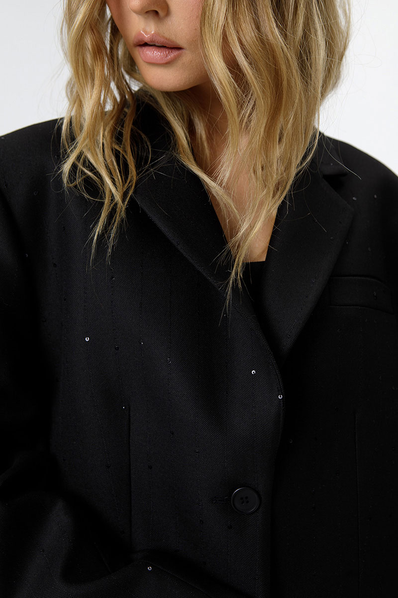 Костюм-двойка из оверсайз жакета и мини-юбки из костюмной ткани с пайетками.