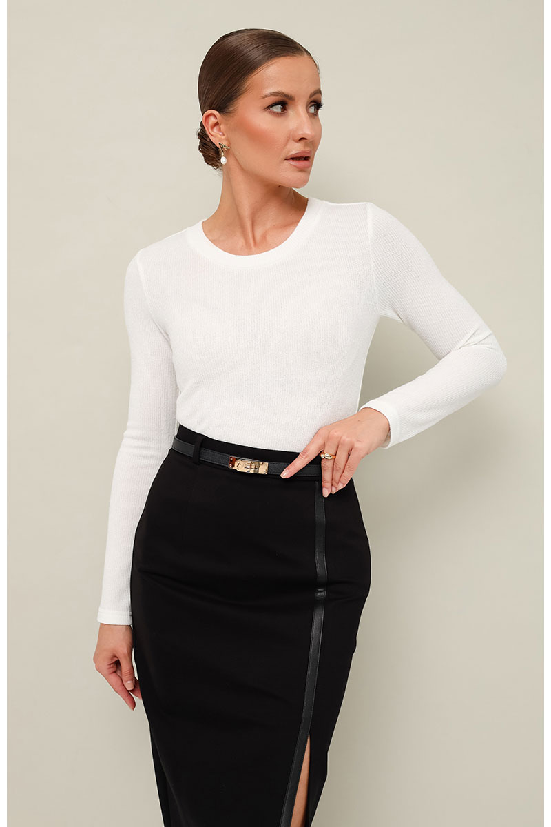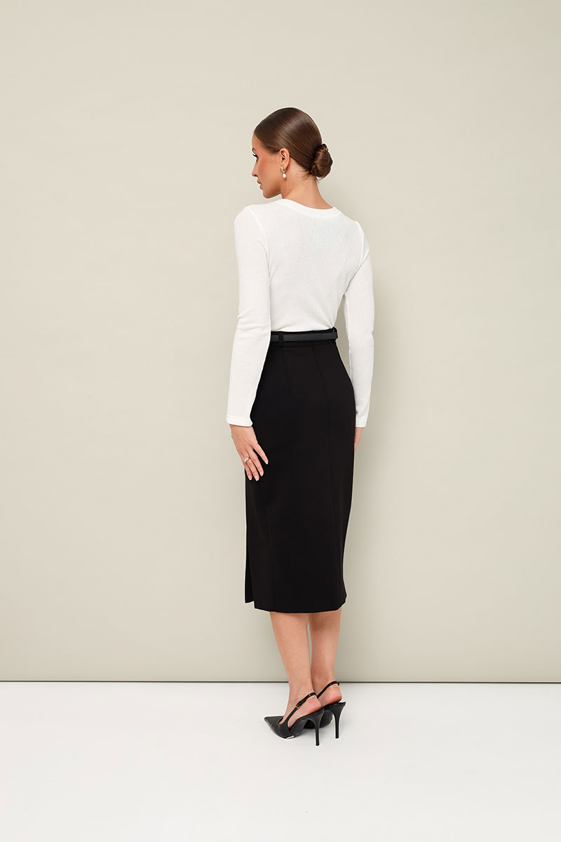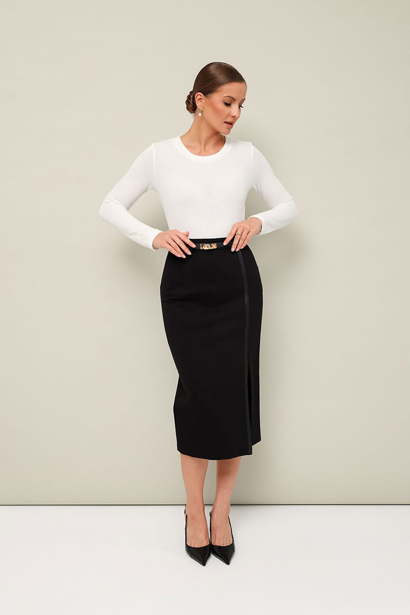 Юбка-карандаш, с притачным поясом со шлевками. По переду высокий разрез, который обработан планкой из экокожи. Застежка сзади, в среднем шве на потайную молнию.