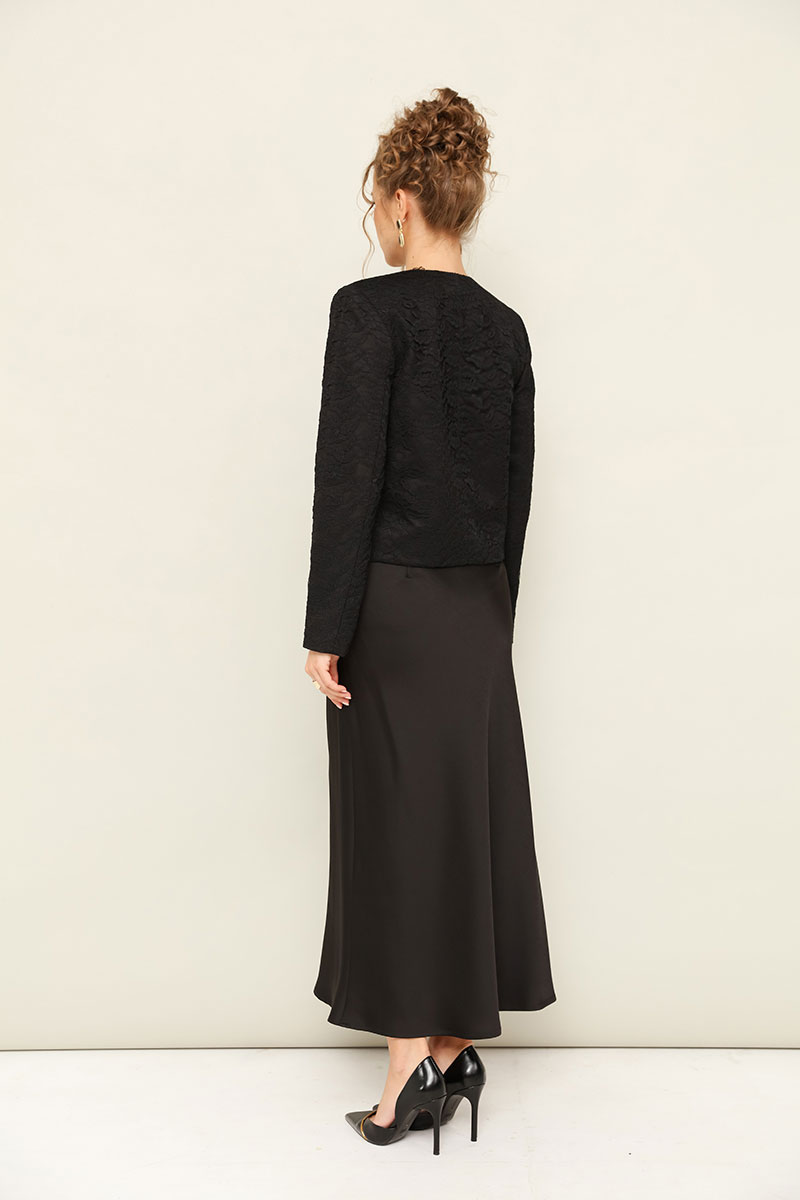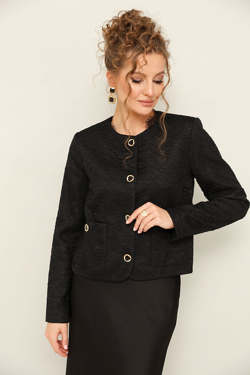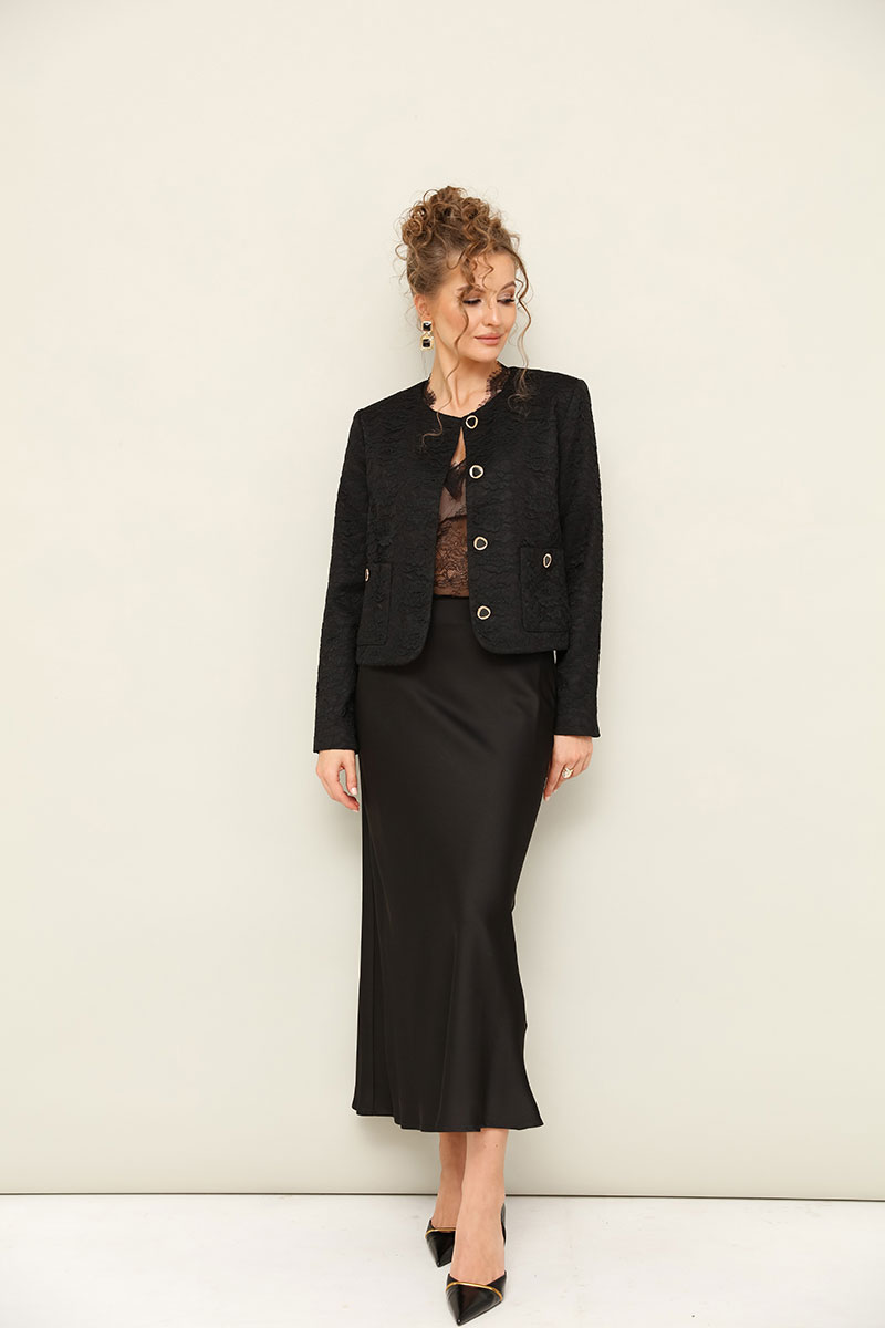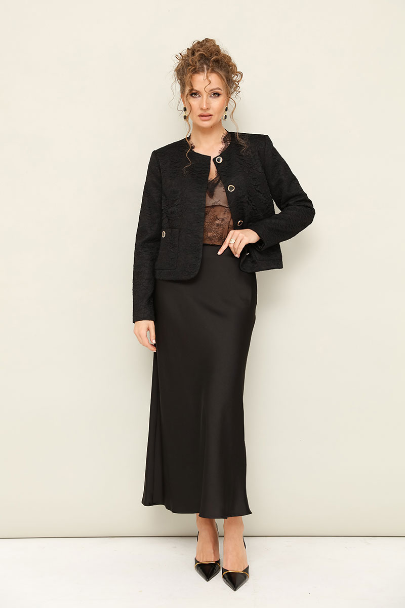 Жакет укороченный,застегивается на пуговицы, выполнен из двух тканей: ажурное кружево и сатин.
