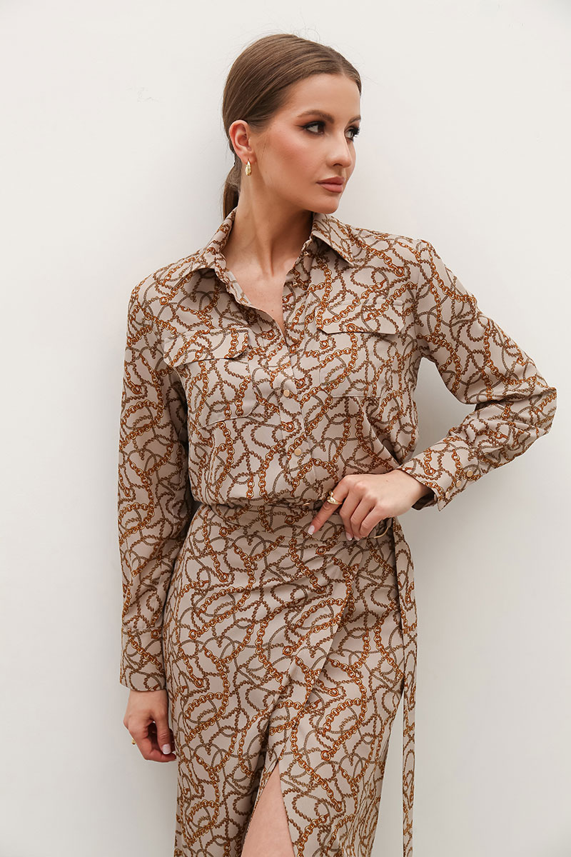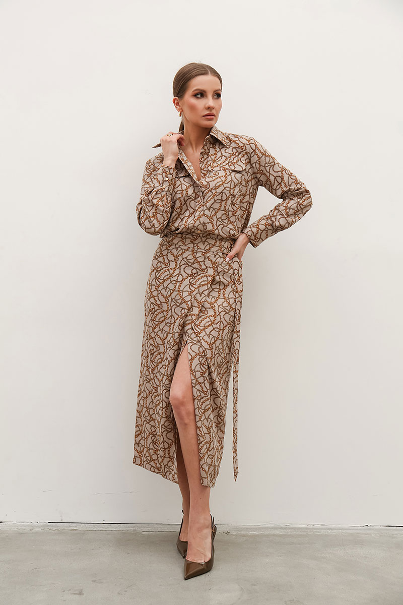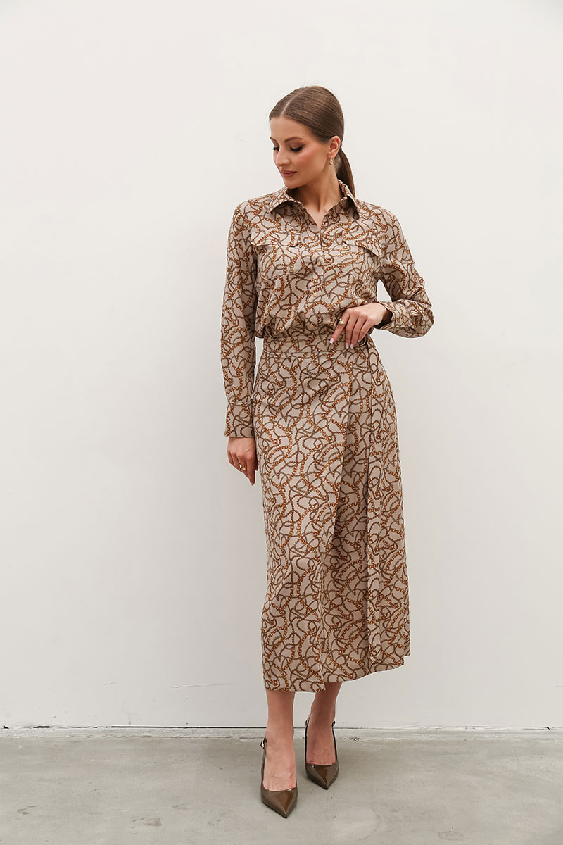 Комплект 2-предметный, состоящий из блузки и юбки на запах.