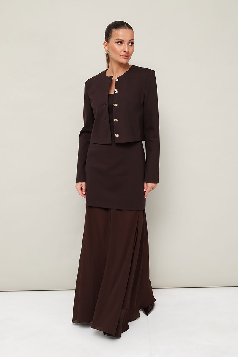 Жакет полуприлегающего силуэта, с центральной застёжкой на петли и акцентные пуговицы. Длинные втачные рукава. Спинка со средним швом.