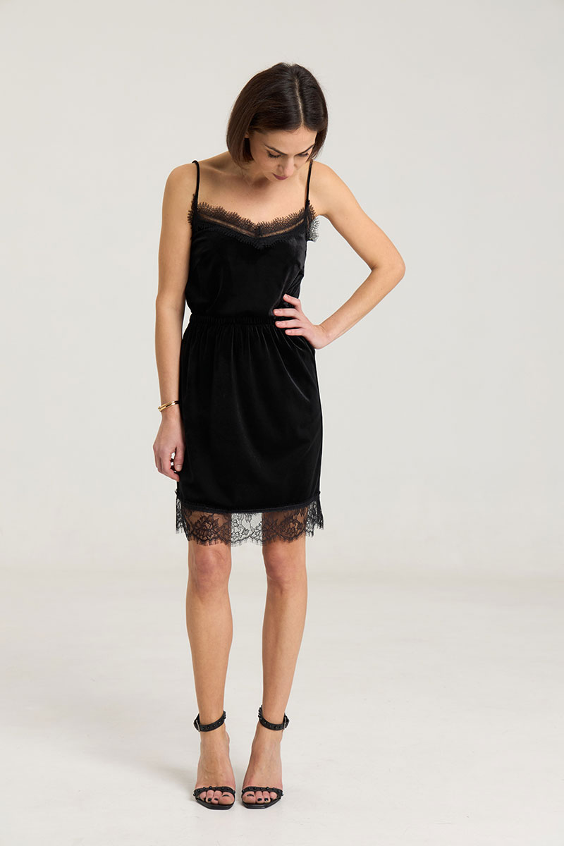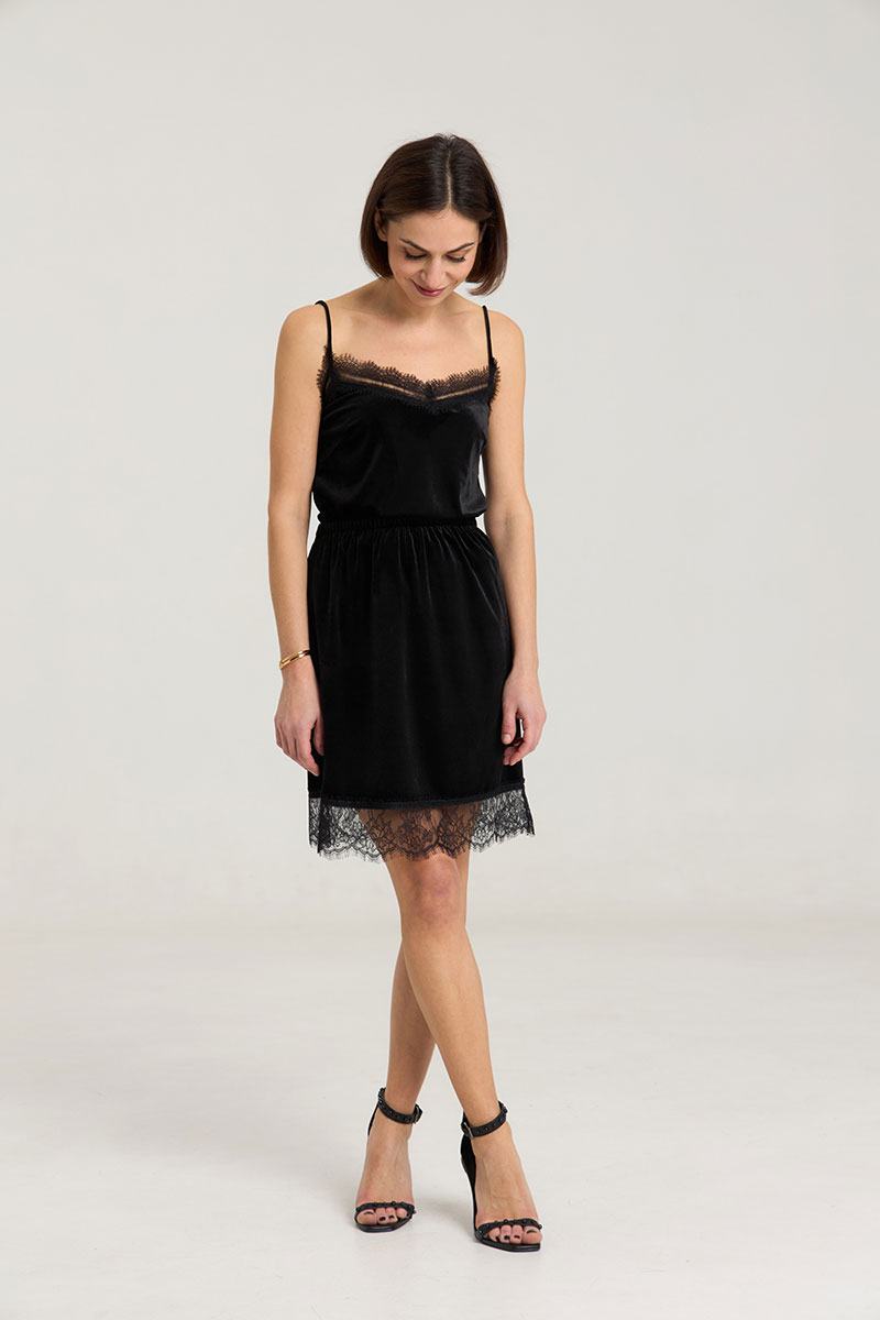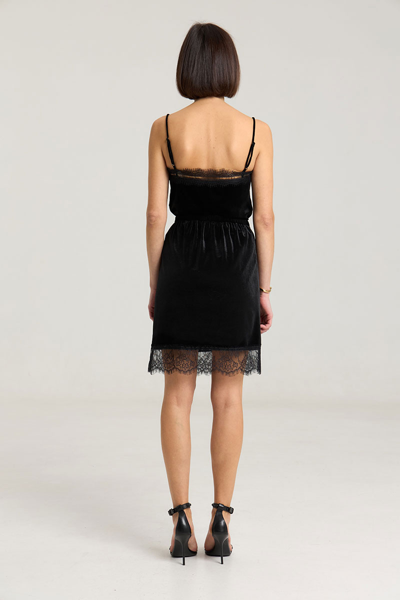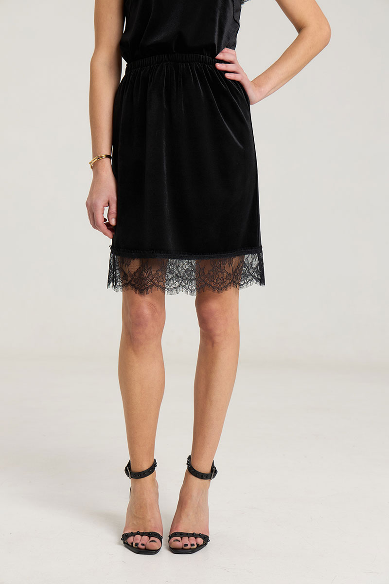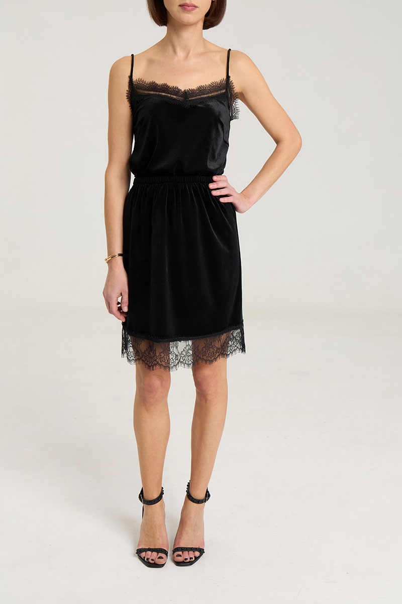 Комплект двухпредметный из топа и юбки, выполнен из мягкой велюровой ткани. Топ полуприлегающего силуэта, по переду и спинке отстрочено кружевом. Юбка в длине миди выполнена из мягкой велюровой ткани черного цвета. Юбка на резинке, прямого силуэта, по низу отстрочено французким широким кружевом. Юбка без подлкадки.