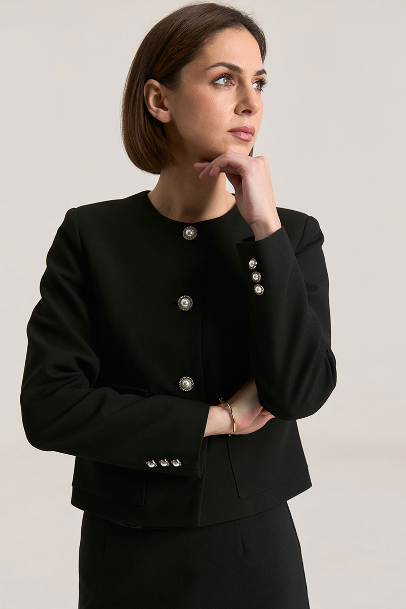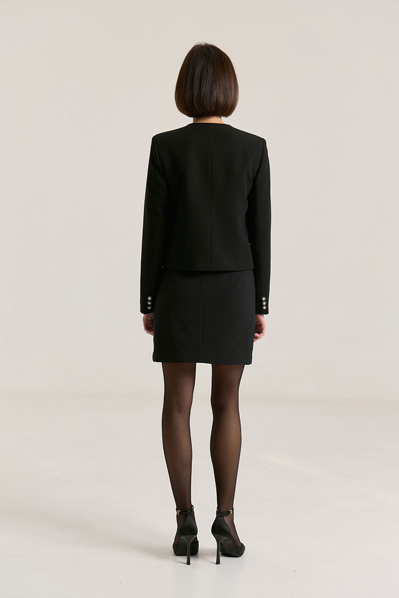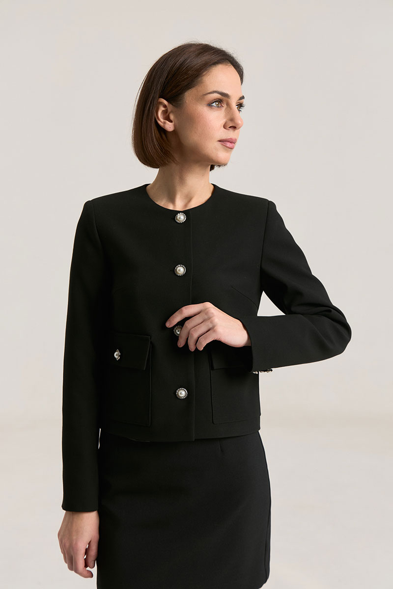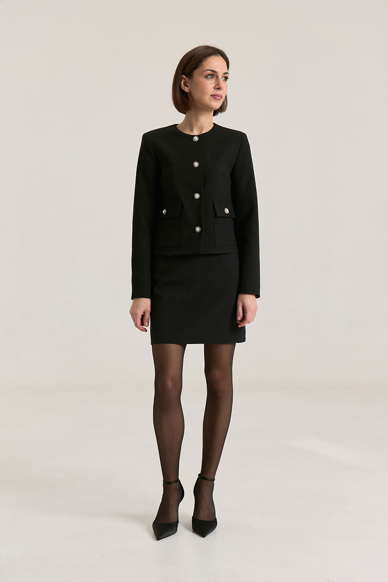 Комплект двухпредметный, состоящий из жакета и юбки.Жакет из мягкой костюмной ткани укороченный, прямого силуэта, с втачными рукавами , горловина округлой формы, без воротника. Детали переда - нагрудными выточки, с настрочными листочками выше линии груди и на уровне талии. По бокам накладные функциональные карманы с застежкой на петлю-пуговицу. Застёжка жакета центральная однабортная на петли и пуговицы. спинка со средним швом и рельефами без шлиц и пуговиц. Жакет на подкладке. Юбка прилегающего силуэта на притачном поясе, посадка высокая , юбка на подкладке.В среднем шве застежка на потайную молнию,