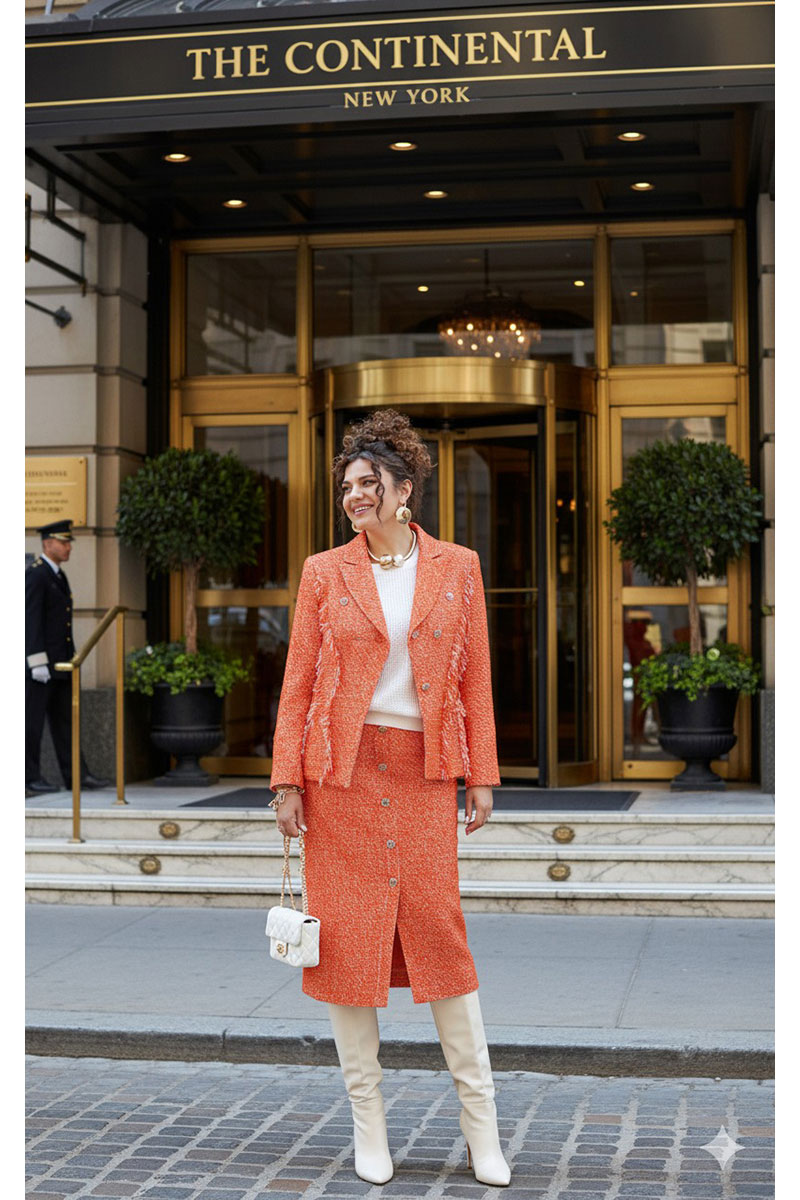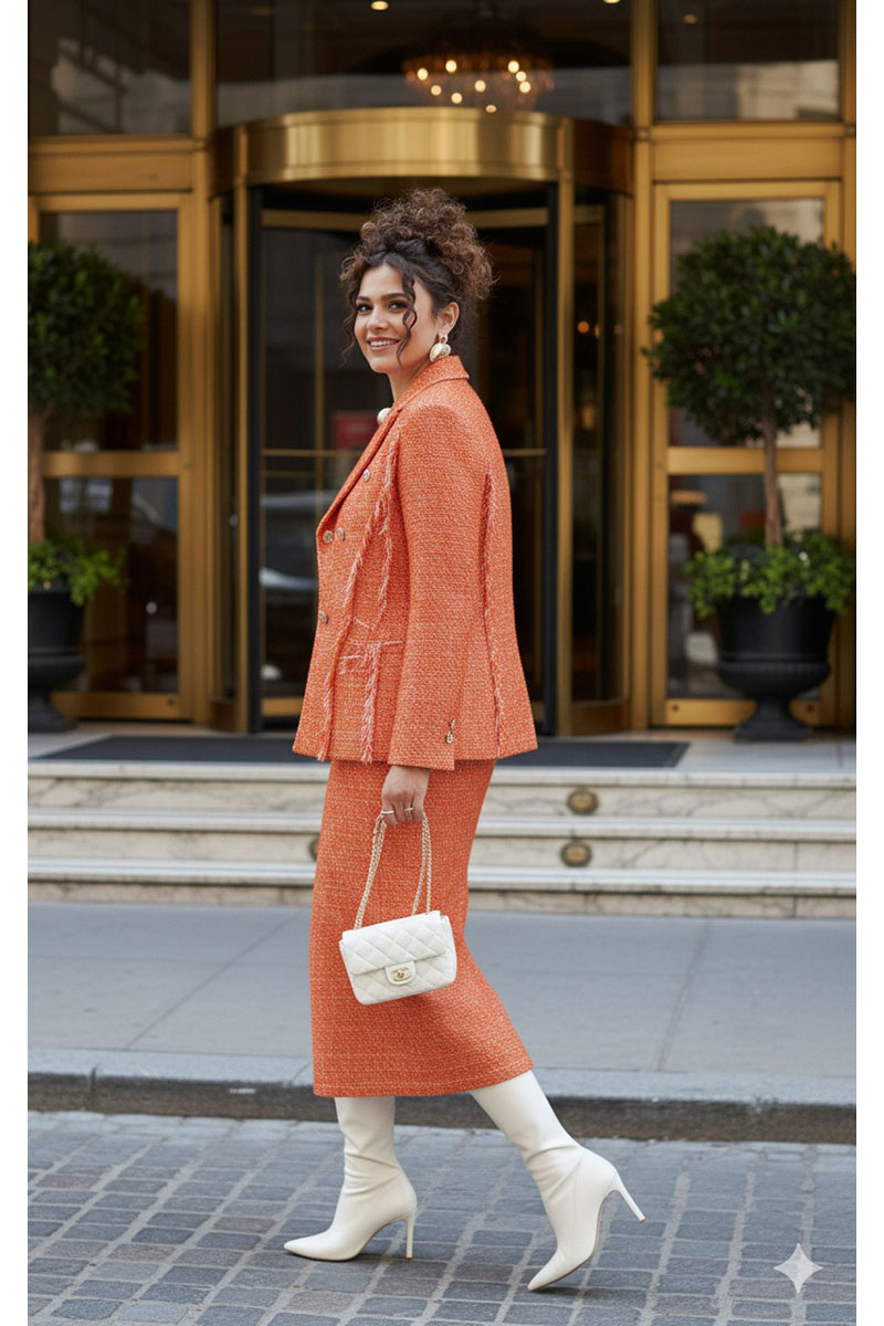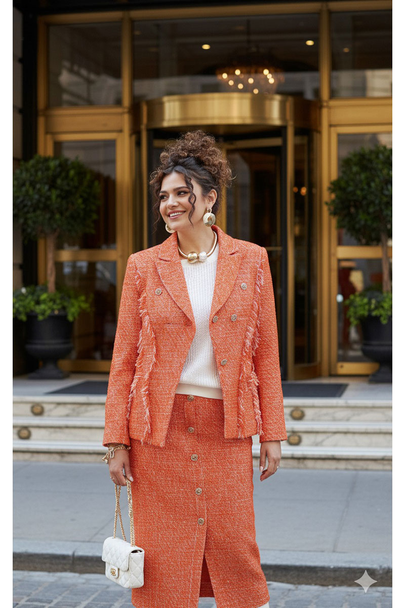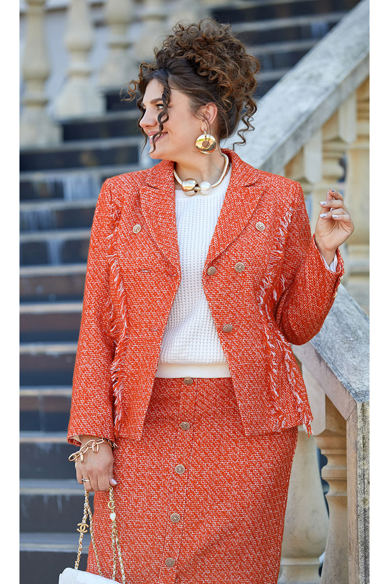 Жакет полуприлегающего силуэта на подкладке, с двубортной застёжкой на петли пуговицы по краю борта. Воротник пиджачного типа с лацканами. По переду жакета рельефы со вставками декоративной бахромы из основной ткани. Спинка с средним швом и декоративными рельефами. Рукав втачной, длинный, двухшовный.