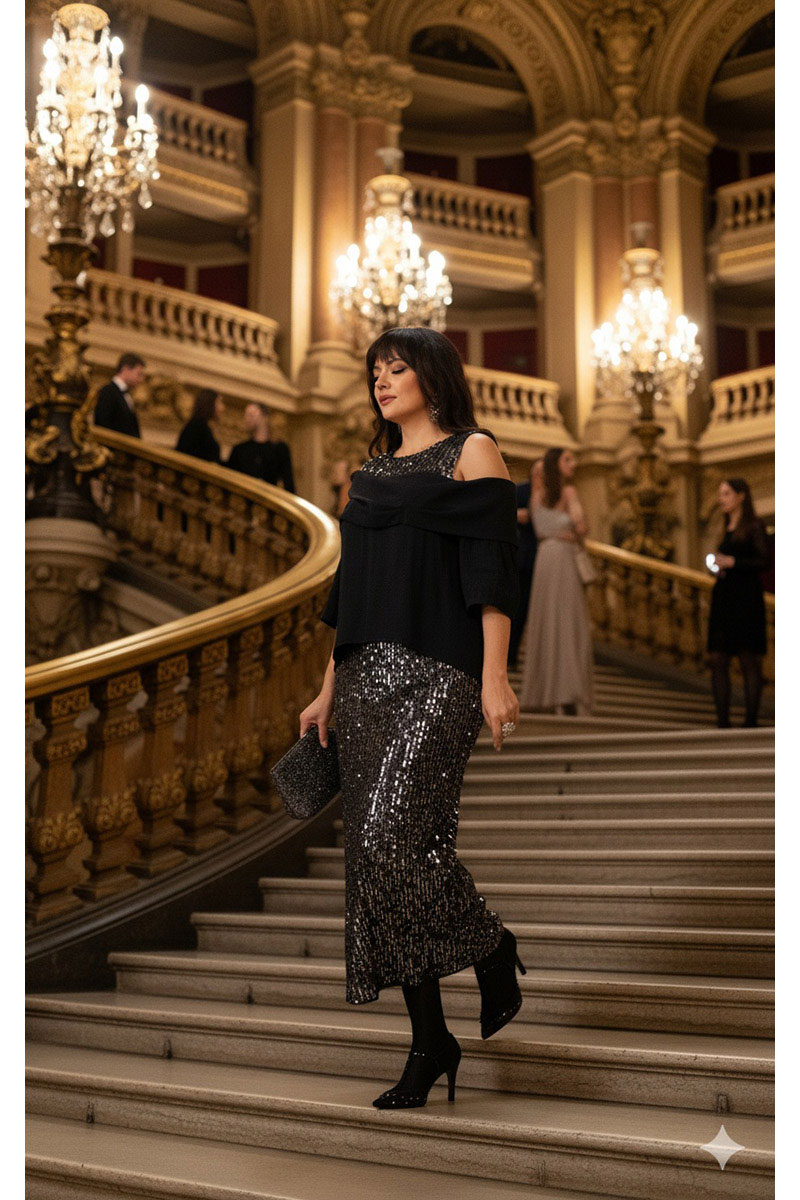 Юбка длины « миди», прямого силуэта немного расширяется к низу. Пояс в юбке цельнокроеный с эластичной тесьмой-резинкой. Длина миди придаёт образу неустаревающую классику и грацию. Плотное полотно, сплошь усыпанное мелкими пайетками графитового и серебристого оттенков, не просто отражает свет, а мягко излучает собственное, приглушённое свечение. Юбка на подкладке.