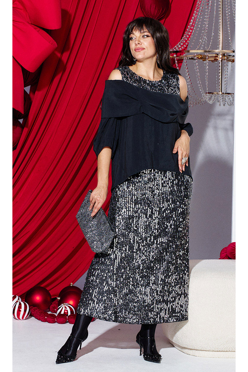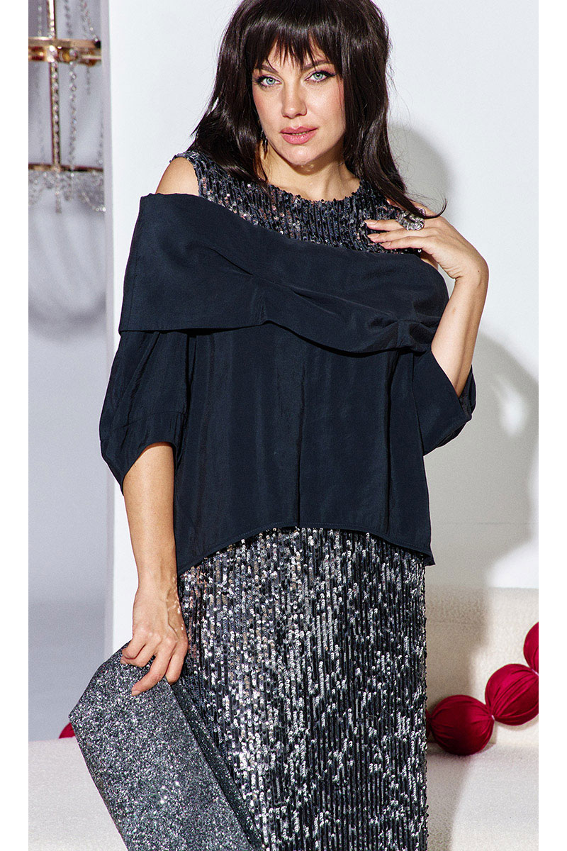 Блузон — это настоящая скульптурная форма. Он начинается с откровенной игры линий: мягко ниспадая с плеч, он обнажает изящные ключицы и линию декольте. Блузон свободной формы с ассиметричным вырезом декольте, отложным воротником с декоративными защипами. По переду и спинке блузона отрезная кокетка из отделочной ткани — пайетки. Низ в платье ассиметричный, боковой шов в блузоне переходит на перёд. Рукав втачной, фигурной формы с декоративным подрезом, длиной ¾.