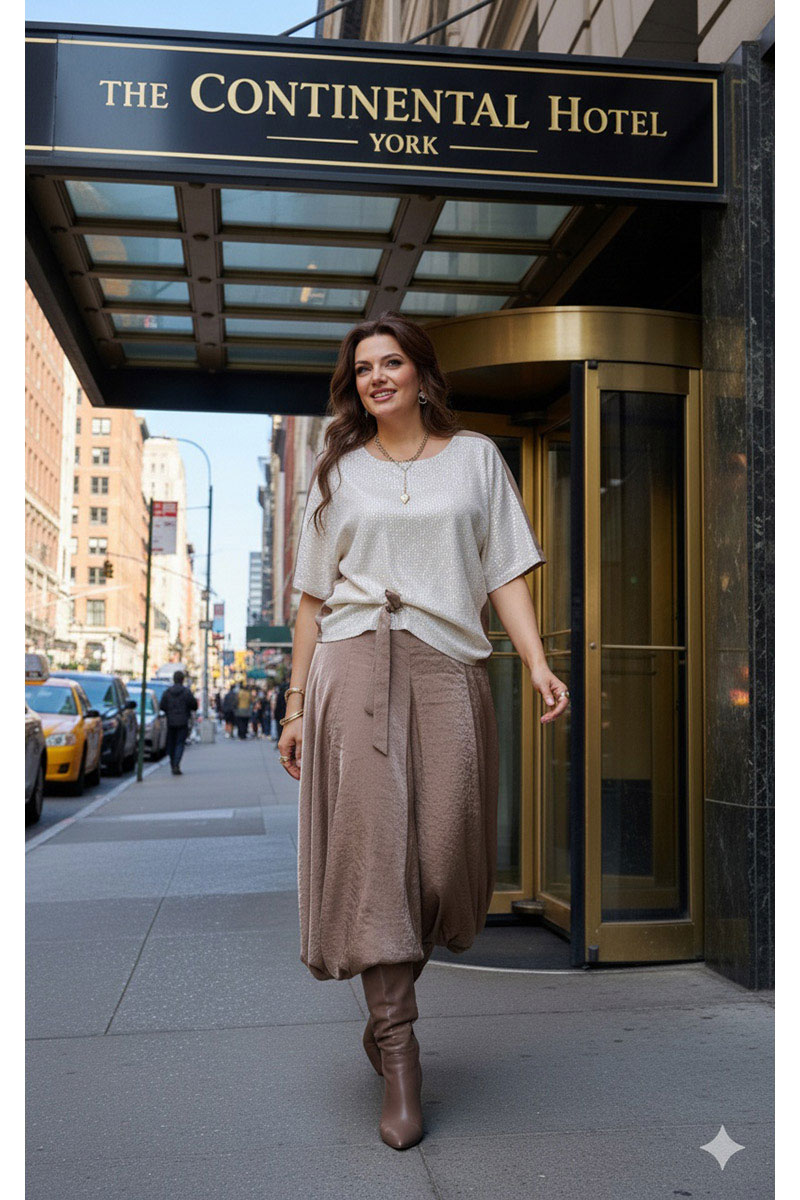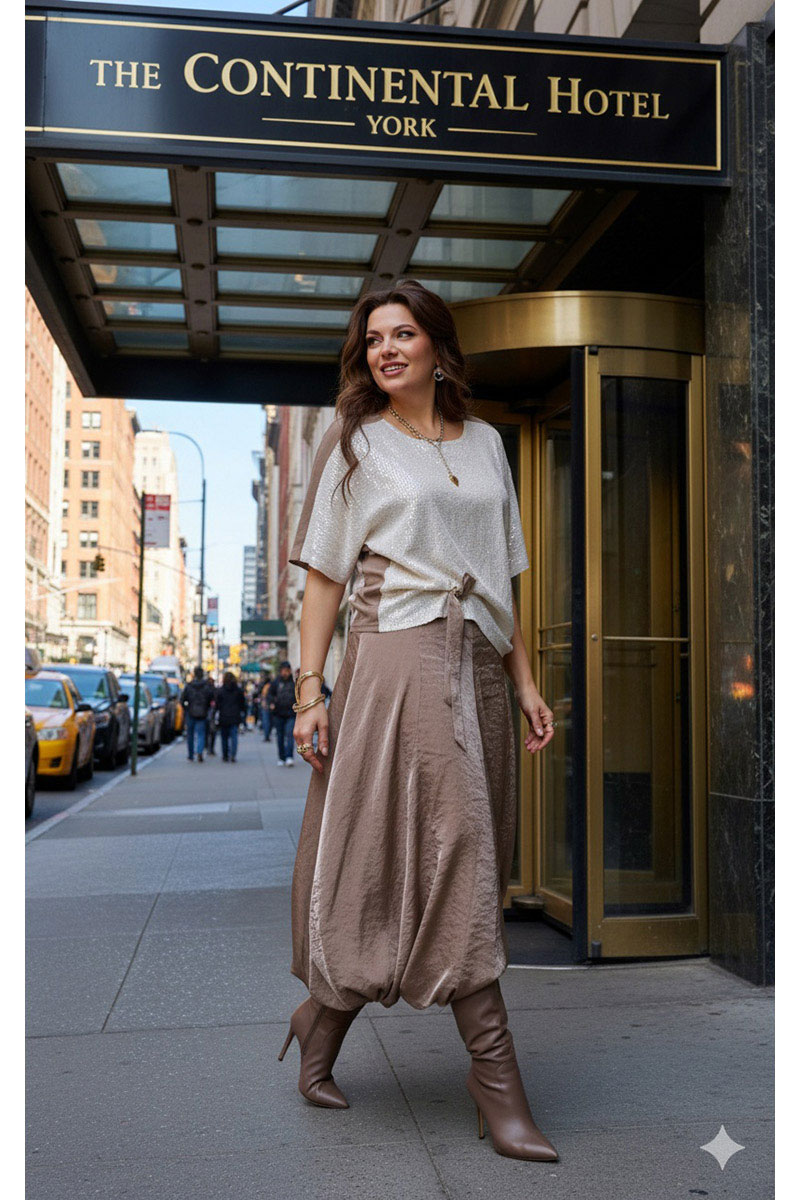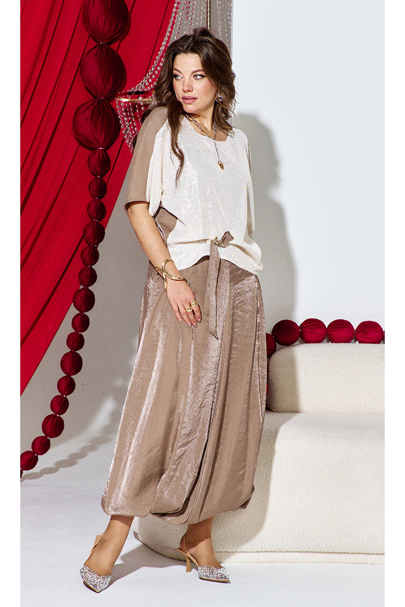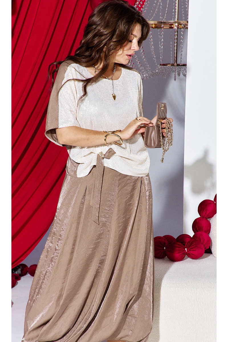 Комплект женский юбочный, двух-предметный, состоящий из блузы и юбки-балон. Комплект держится в гармонии за счёт контраста фактур: гладкая блуза с акцентной вставкой из отделочной ткани- светлой пайетки по переду и фактурным балоном юбки за счёт лёгкого перекрута по низу. Общий силуэт создаёт ощущение движения даже в статичном кадре. Этот наряд идеально подходит для торжественных мероприятий: он подчеркивает женственность, оставаясь при этом светлым и уверенным.