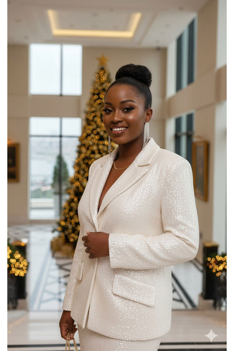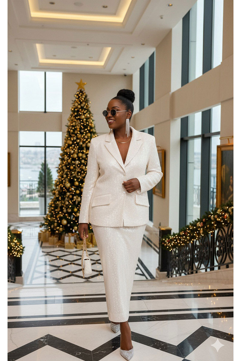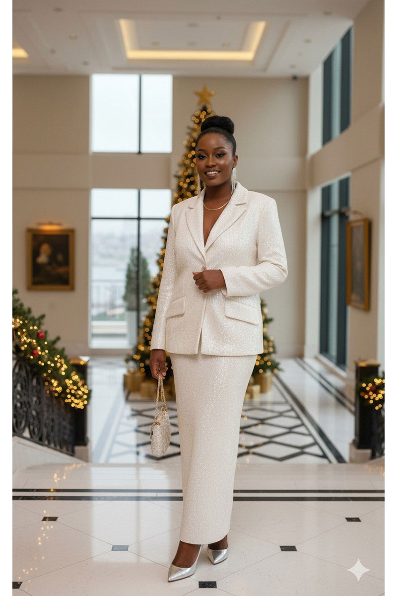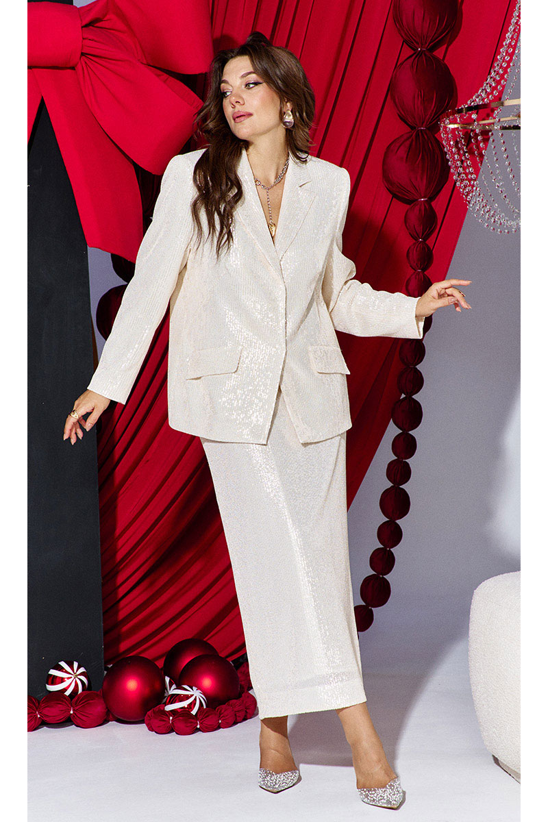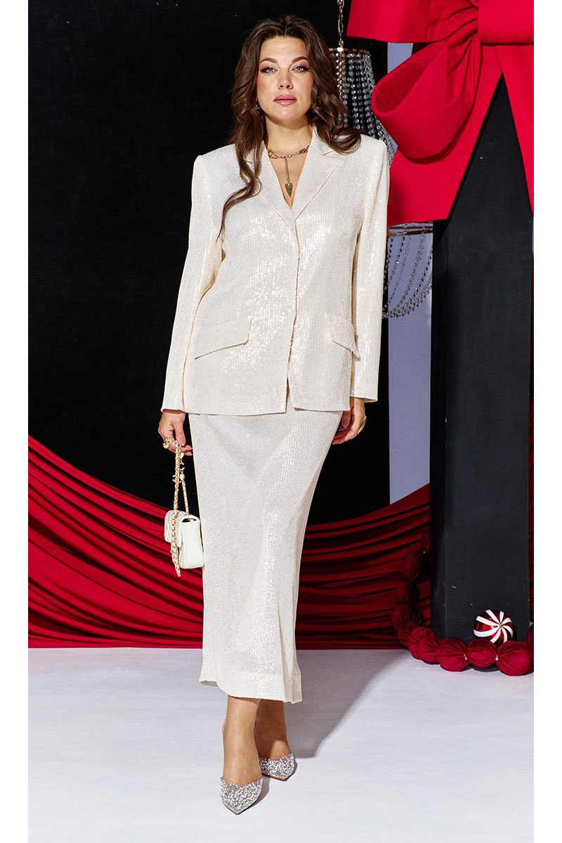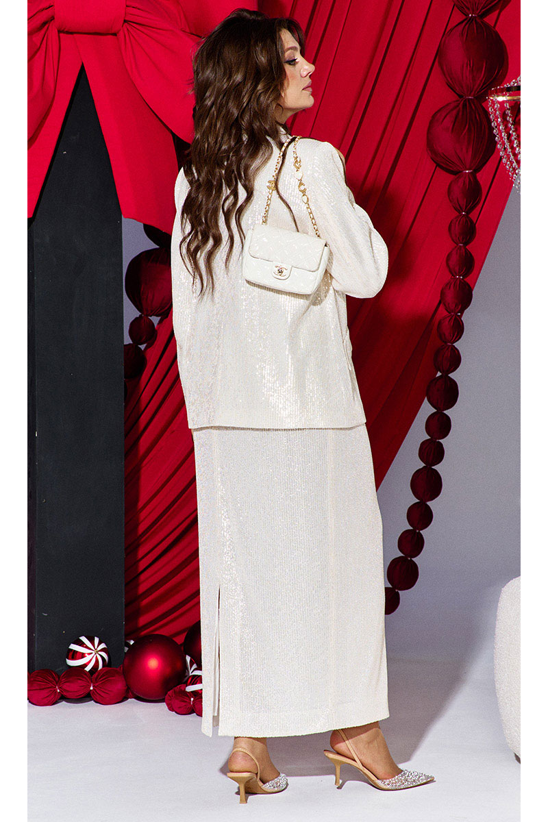 Это не просто женский юбочный костюм — это будто вторая кожа, сотканная из ночных огней и лунной пыли. Пайетки, бесчисленные и плотно прилегающие друг к другу, словно чешуя диковинной рыбы, не просто сверкали. Они жили своей собственной, мерцающей жизнью, рождая на своей поверхности целую вселенную из бликов. Костюм женский, двухпредметный, состоящий из жакета и юбки.