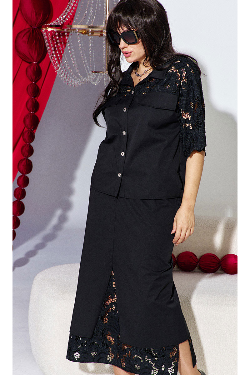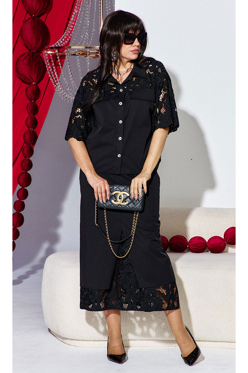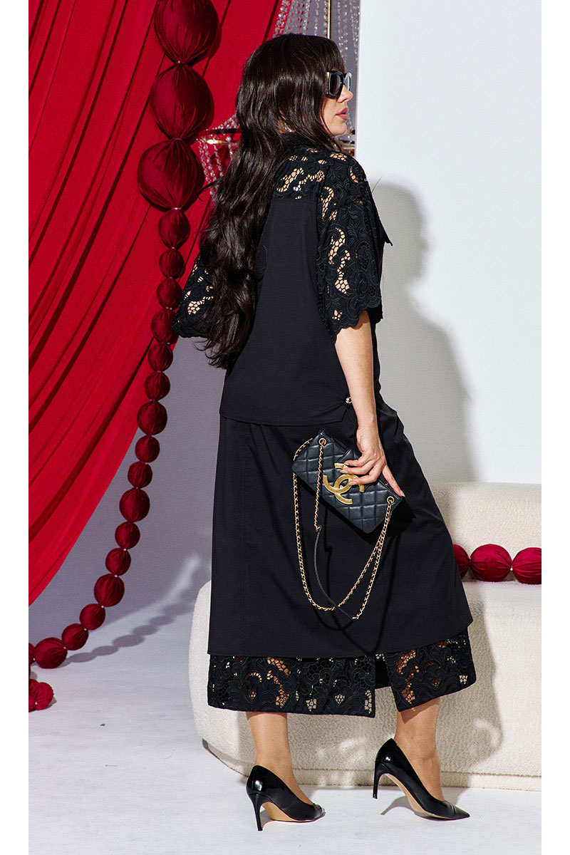 Комбинация однотонного хлопка и вышитого гипюра в тон создаёт ощущение монолитности и изысканности. Верх и низ костюма образуют единое целое: простая, сдержанная геометрия блузы подается как холст для элегантности юбки, превращая костюм в идеальный выбор для событий, где важна сдержанность и сила стиля.