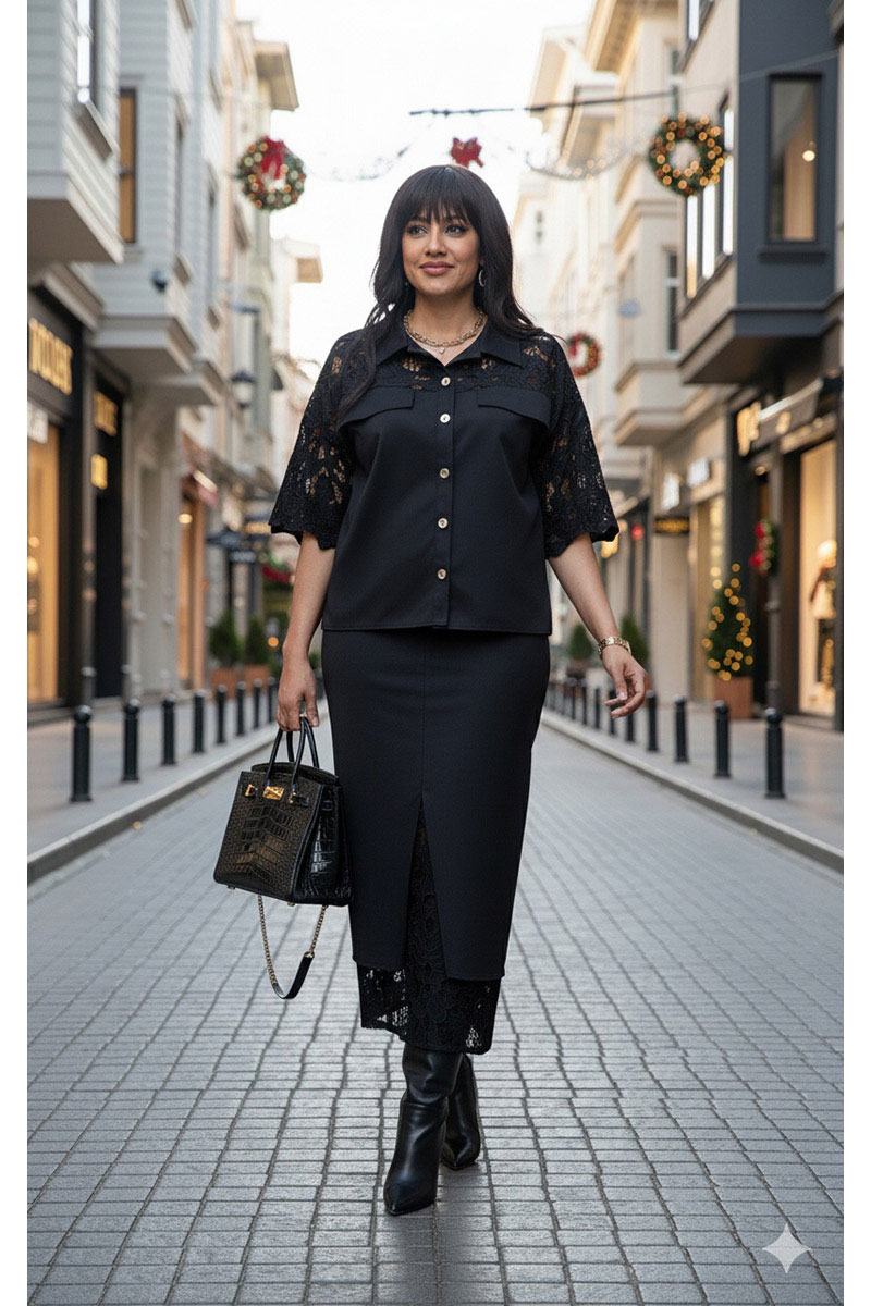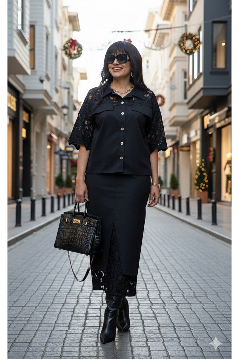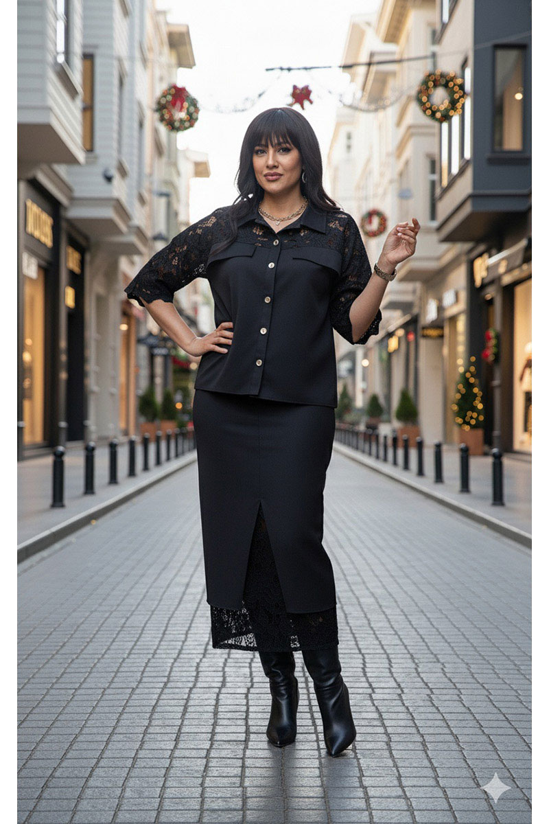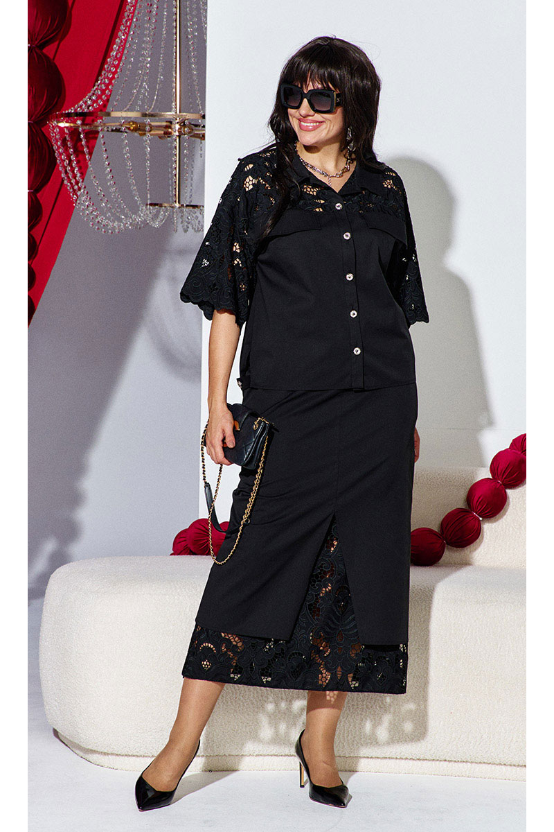 Комбинация однотонного хлопка и вышитого гипюра в тон создаёт ощущение монолитности и изысканности. Верх и низ костюма образуют единое целое: простая, сдержанная геометрия блузы подается как холст для элегантности юбки, превращая костюм в идеальный выбор для событий, где важна сдержанность и сила стиля.
