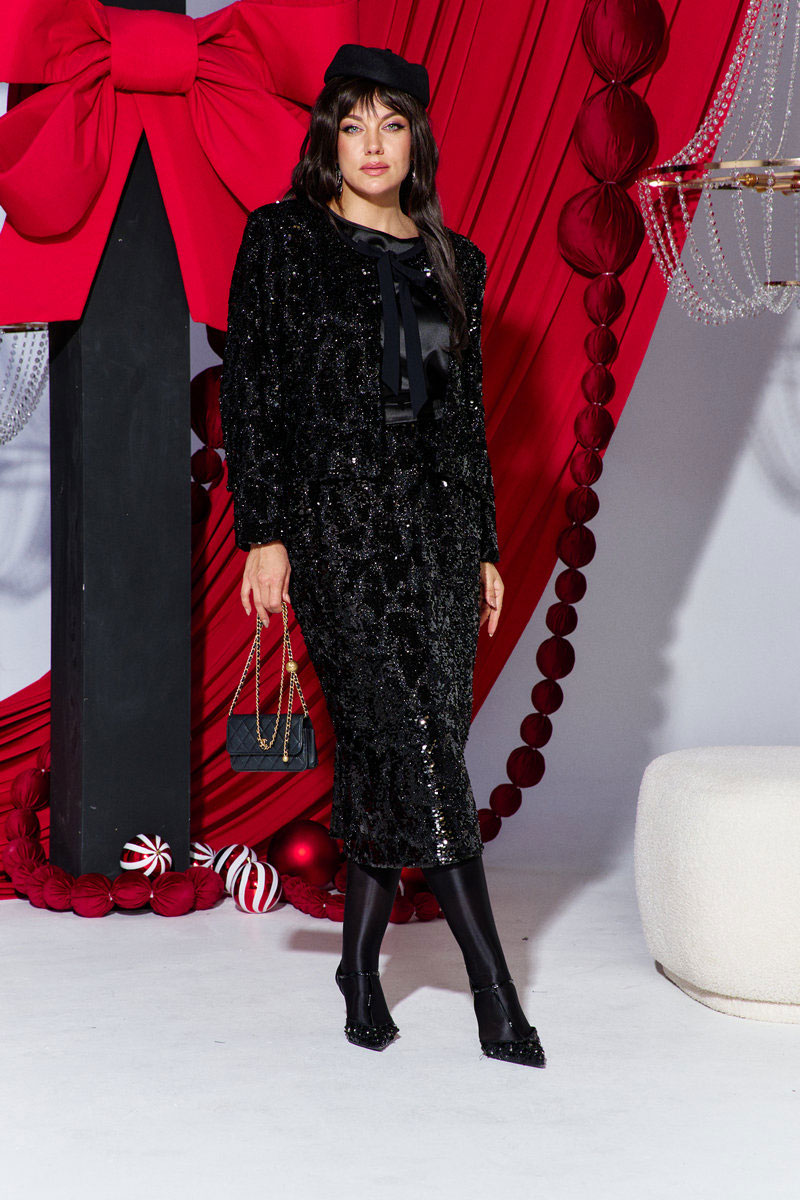 Блуза в классическом чёрном оттенке, который гармонично сочетается с насыщенным чёрным цветом комплекта. Блуза прямого силуэта с округлой формой горловины и нагрудными вытачками по полочке. Спинка без особенностей. Низ в блузе фигурной формы.Юбка длиной миди держит внимание за счет ткани, украшеной в густую, слегка крупную фактурную пайетку. Юбка прямого силуэта с притачным поясом со вставкой эластичной тесьмы-резинки в бочках. В среднем шве заднего полотнища юбки застёжка на молнию и пуговицу в поясе.