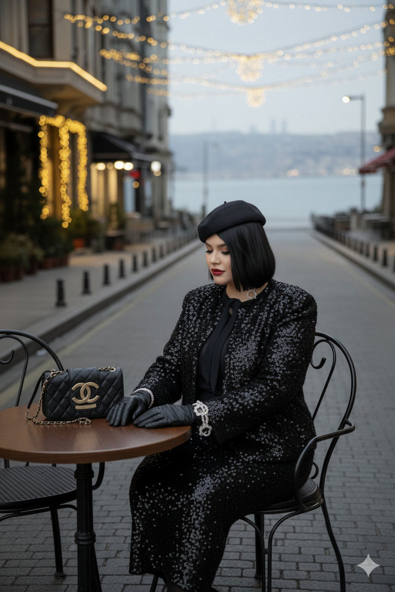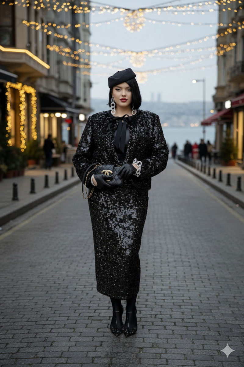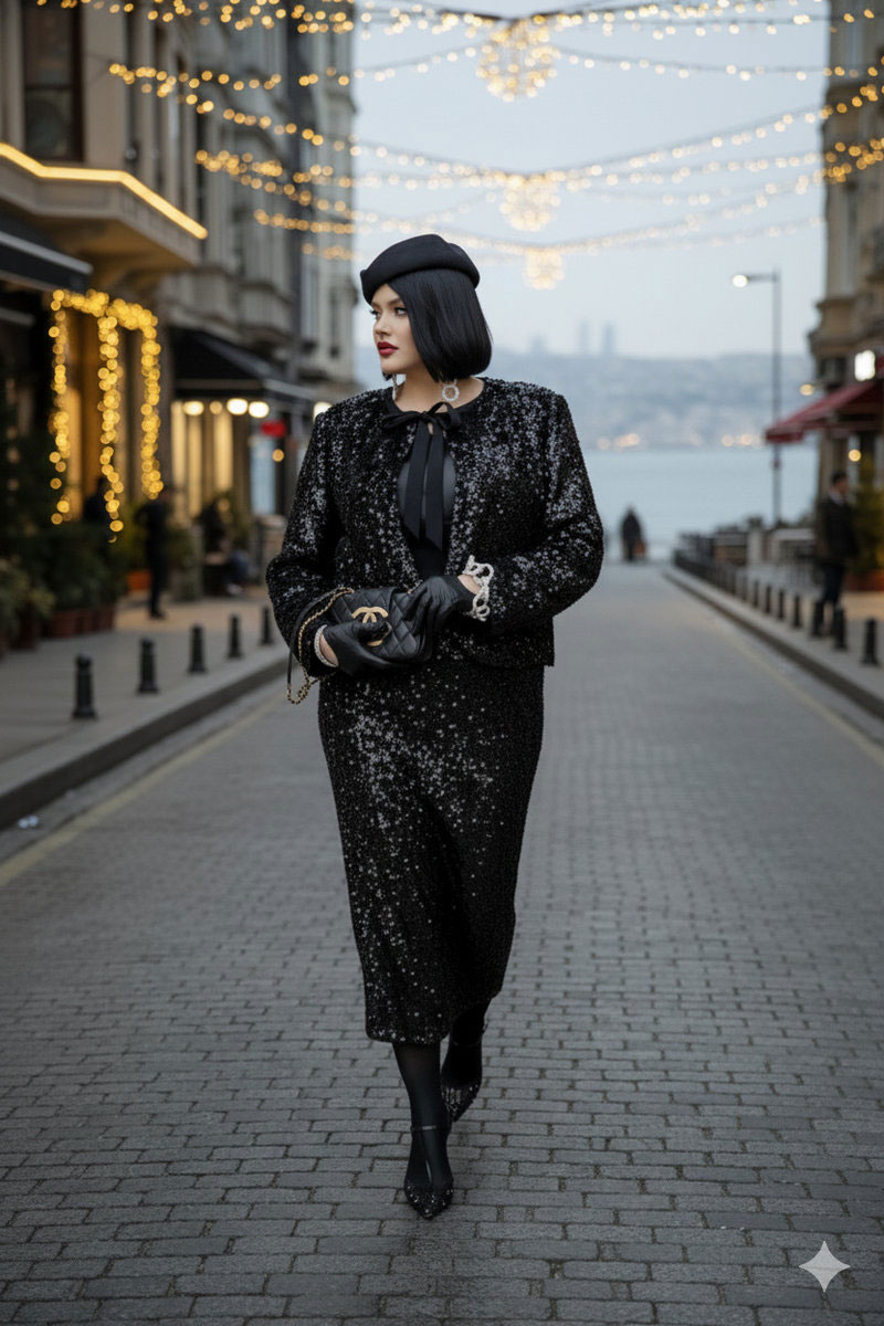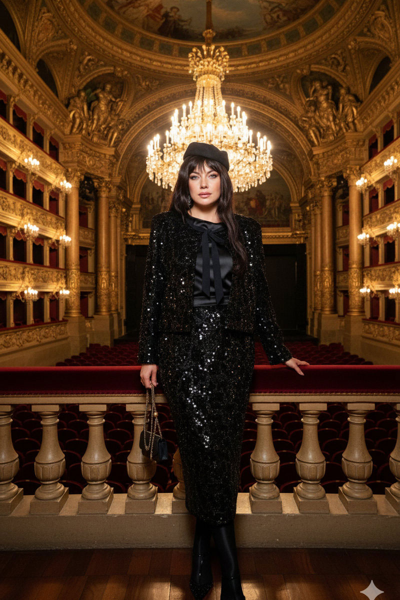 Общий образ — минимализм цвета и максимальная выразительность текстур. Материалы будто говорят на языке контраста: атласный блеск в блузе гармонично сочетается с зеркальной, перламутровой игрой пайетки. Этот комплект создает ощущение современной роскоши для вечерних выходов, деловых мероприятий и торжественных приемов, где ценят изящество без лишних деталей, спокойную уверенность и плавное движение света. Комплект женский, трёх-предметный, состоящий из жакета, блузы и юбки.