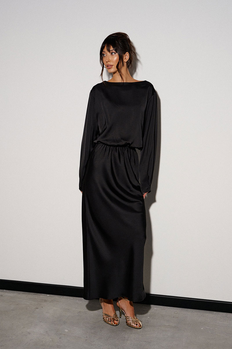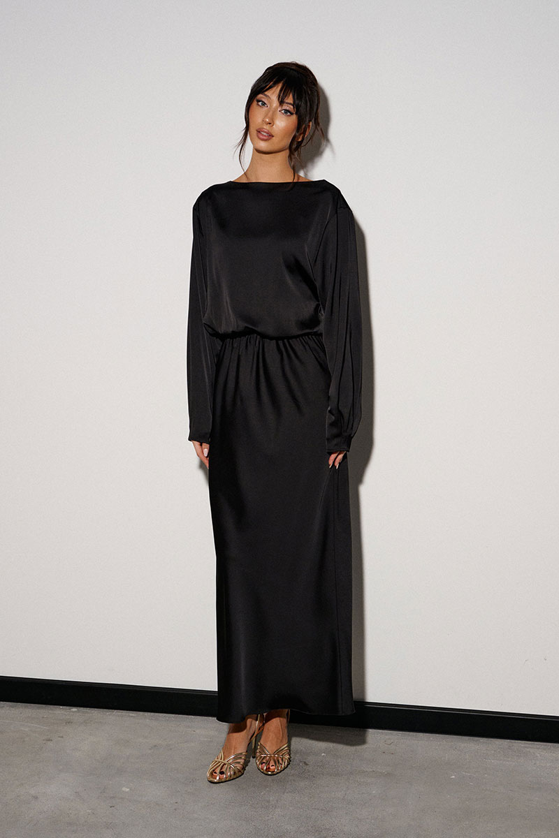 Платье-макси полуприлегающего силуэта. Выполнено из мягкой струящейся ткани чёрного цвета. Без подкладки. Горловина-лодочка. Отрез ниже талии на резинке. Рукав втачной, спущенный, заужен к низу.