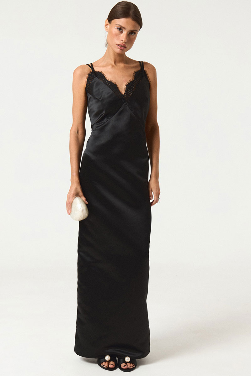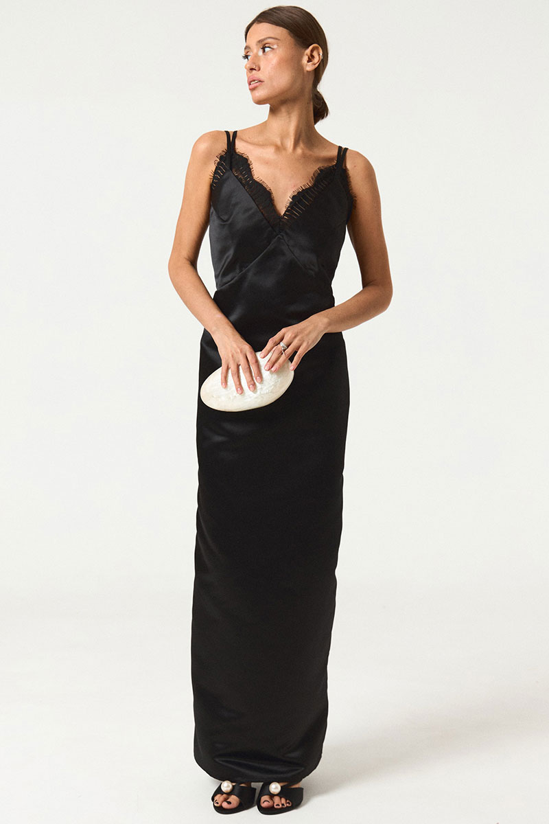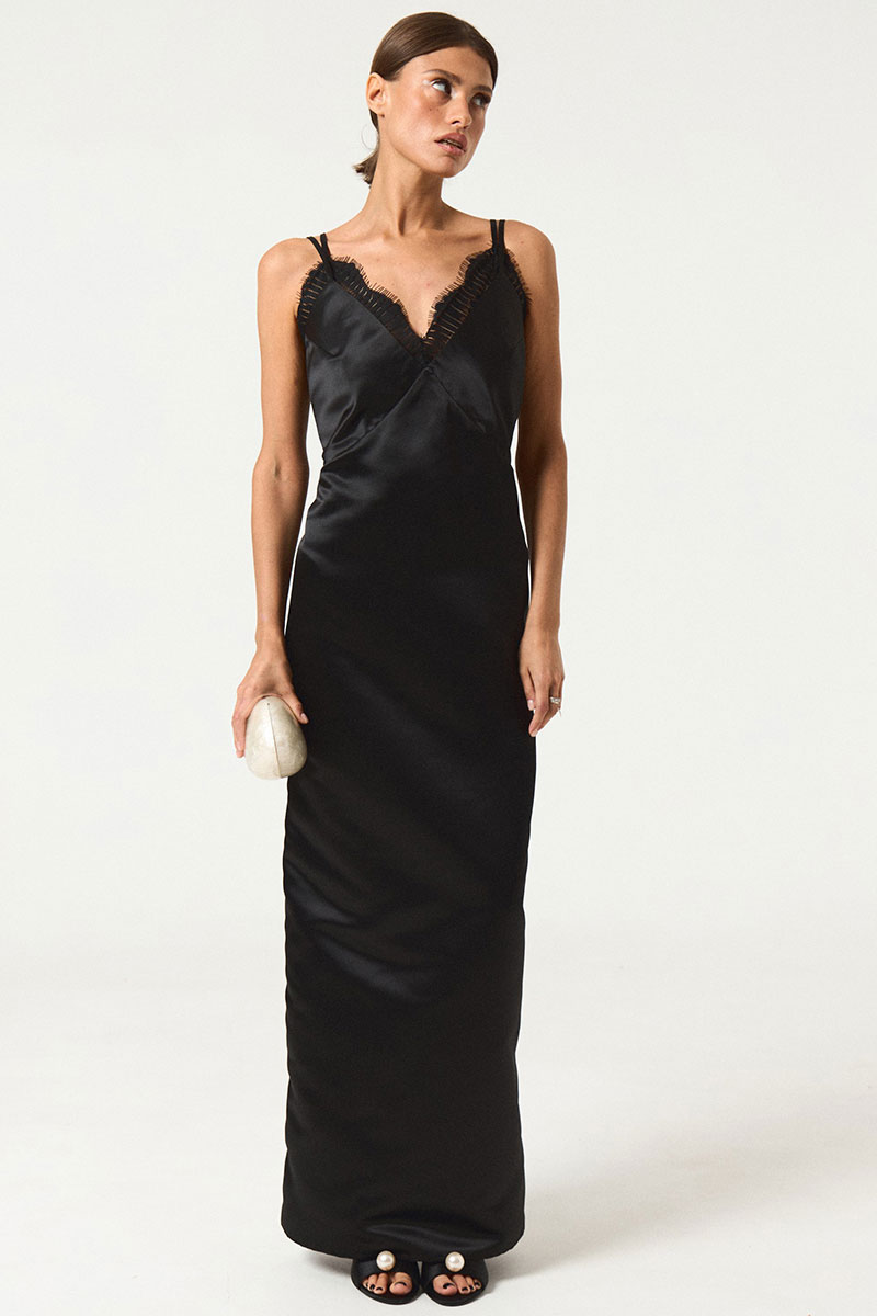 Платье-комбинация на бретельках с двойным лифом. Платье полуприлегающего силуэта. В заднем среднем шве разрез. Платье без подкладки.