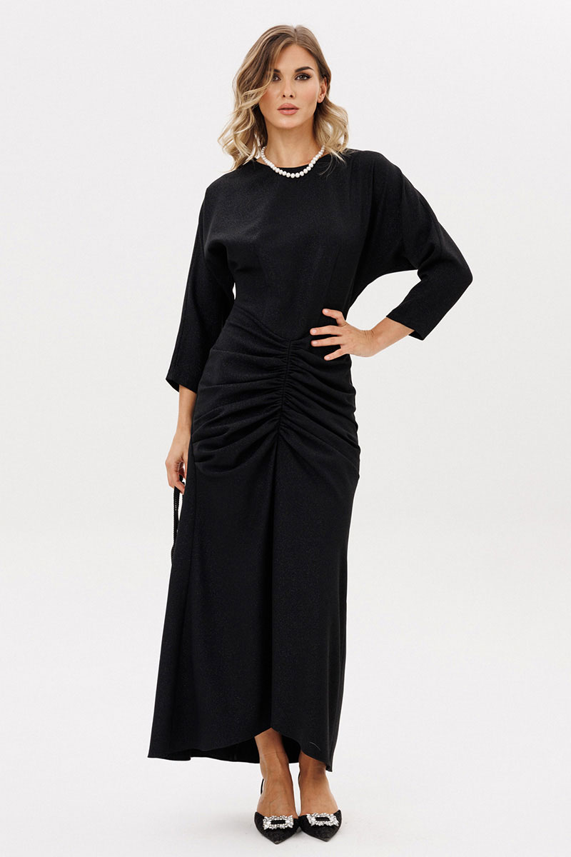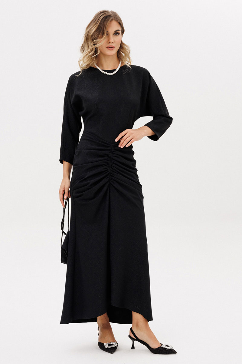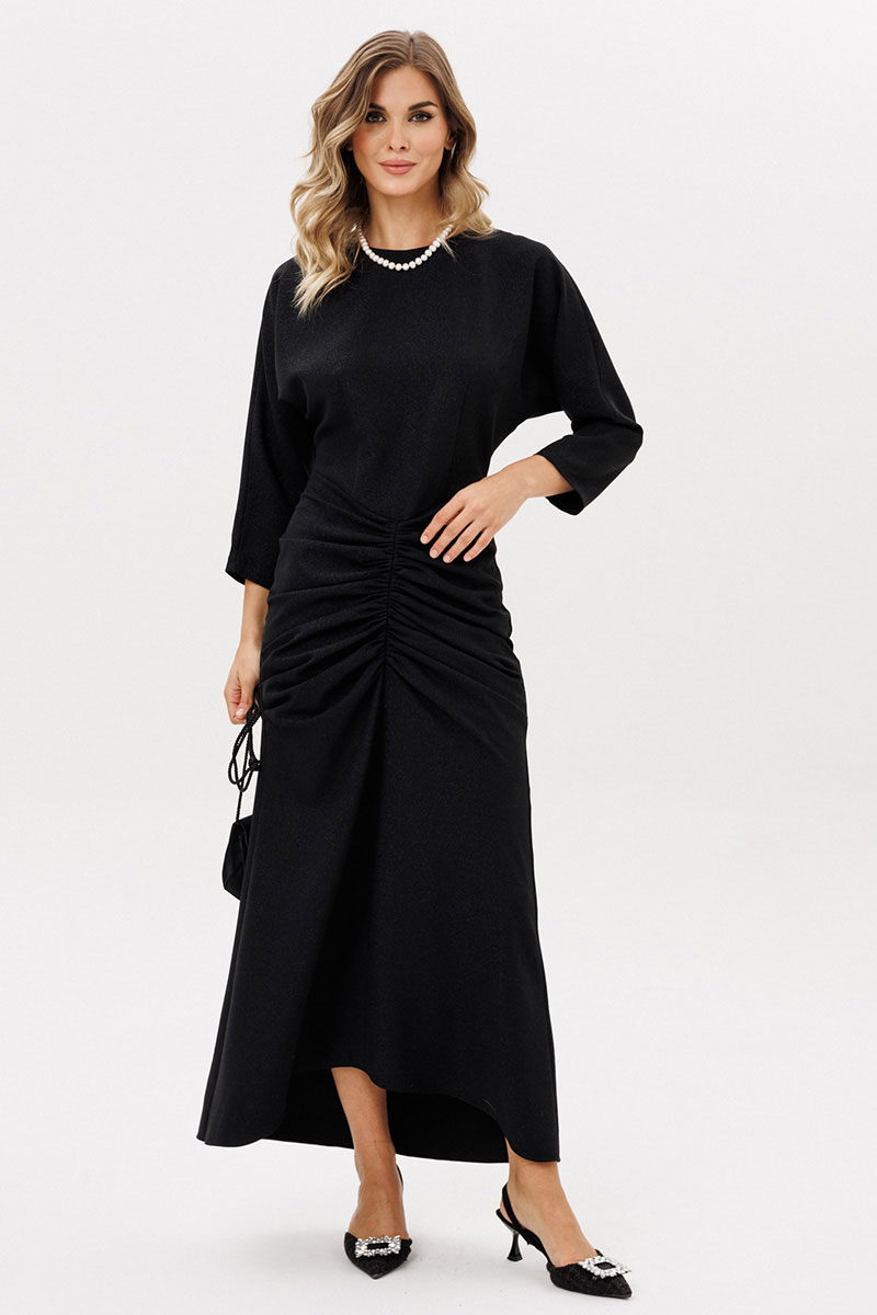 Платье выполнено из костюмно-плательной ткани с блеском. Платье Х-образного силуэта длиной миди. Спереди по нижней части средний шов и драпировка. Застежка на потайную молнию сзади в среднем шве спинки. Горловина округлой формы. Рукав цельнокроеный, покроя "кимоно", двухшовный, длиной 3/4. Низ платья фигурной формы, по спинке длинее переда.