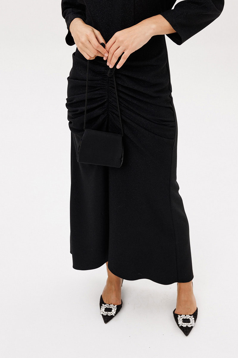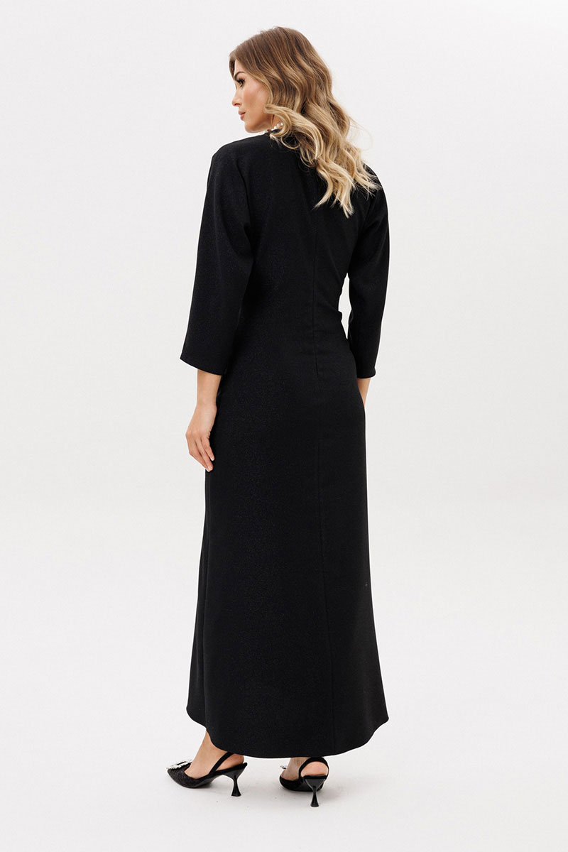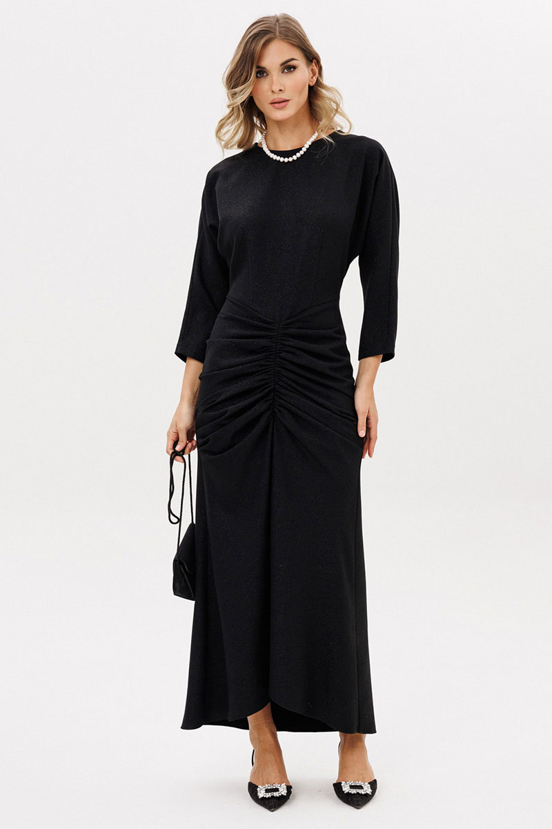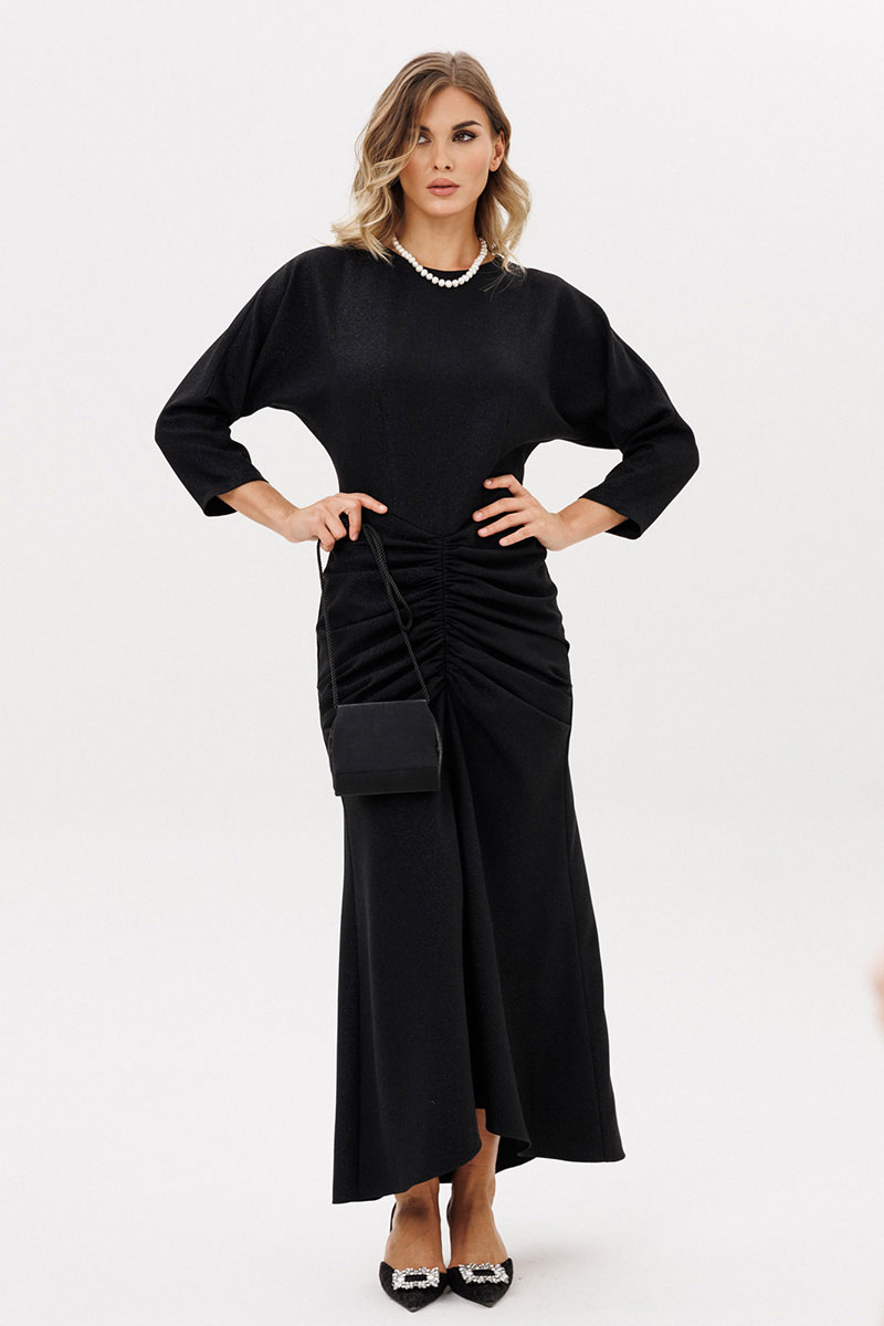 Платье выполнено из костюмно-плательной ткани с блеском. Платье Х-образного силуэта длиной миди. Спереди по нижней части средний шов и драпировка. Застежка на потайную молнию сзади в среднем шве спинки. Горловина округлой формы. Рукав цельнокроеный, покроя "кимоно", двухшовный, длиной 3/4. Низ платья фигурной формы, по спинке длинее переда.