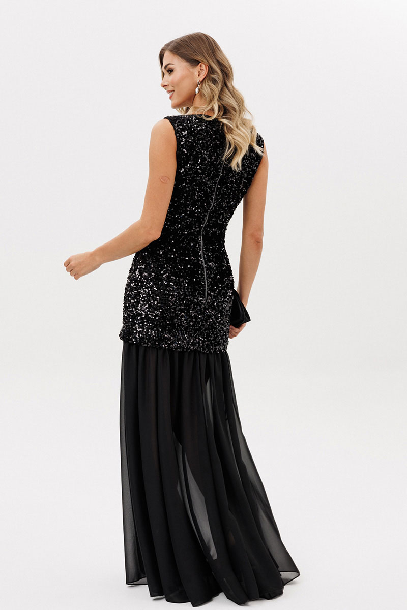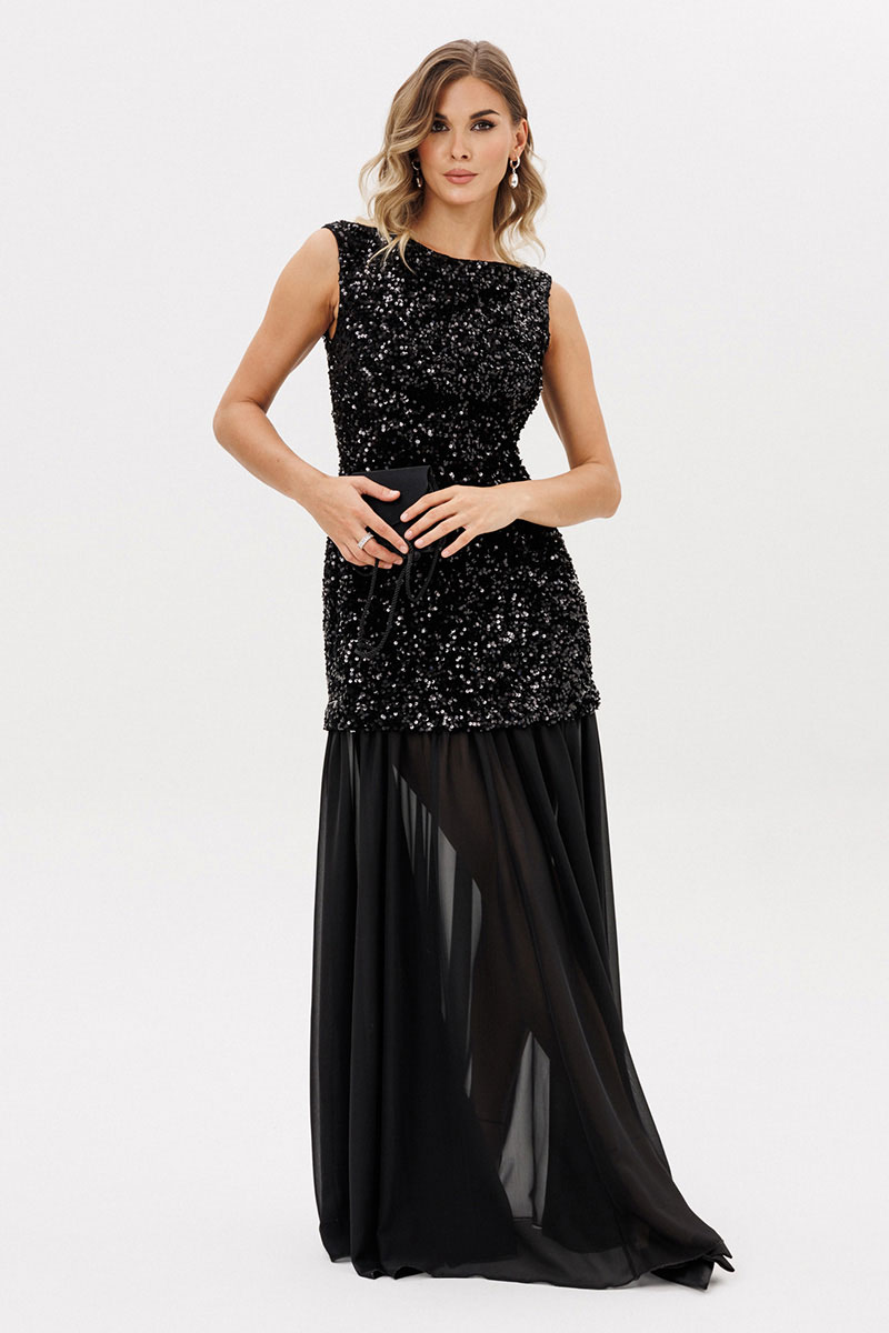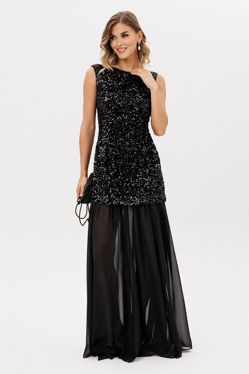 Платье выполнено из бархата с пайетками. Платье Х-образного силуэта, длиной в пол. Верх платья выполнен в виде приталенного платья длиной ниже линии бедер. Застежка на молнию с металлическими звеньями сзади в среднем шве спинки. Плечевой шов заужен. Горловина формы "лодочка". Нижняя часть платья выполнена из шифона и состоит из 8 клиньев. Верх платья на притачной по низу подкладке.
