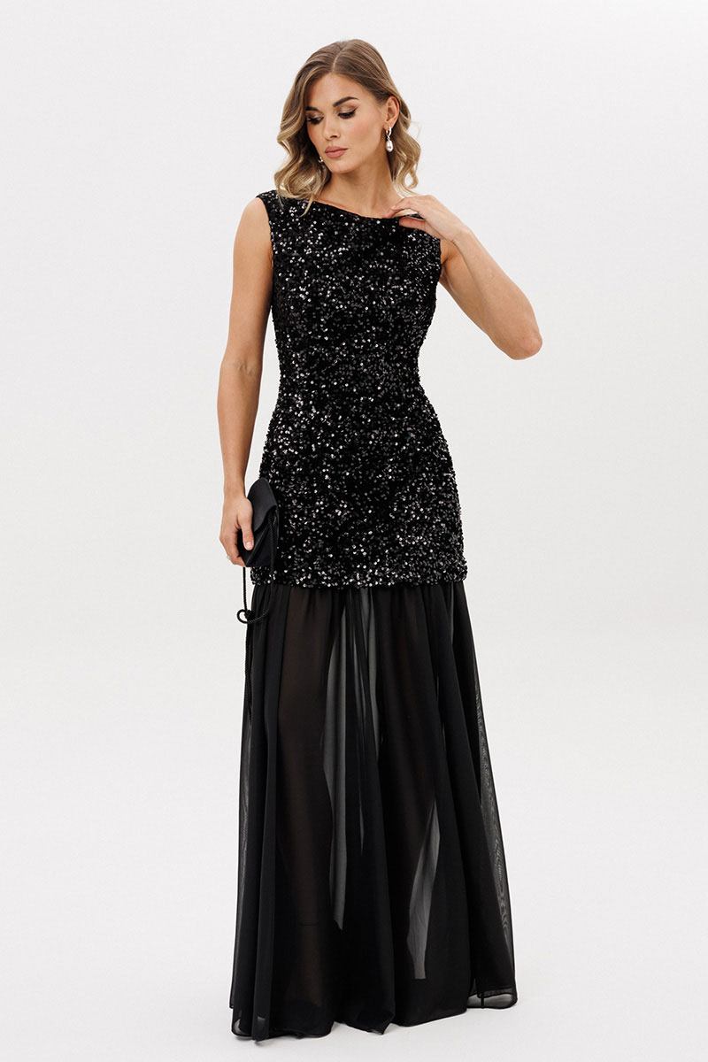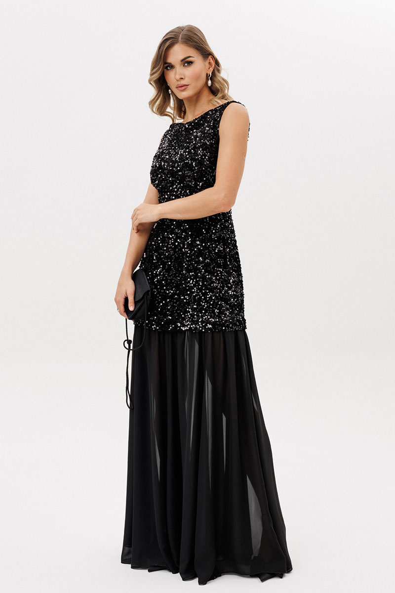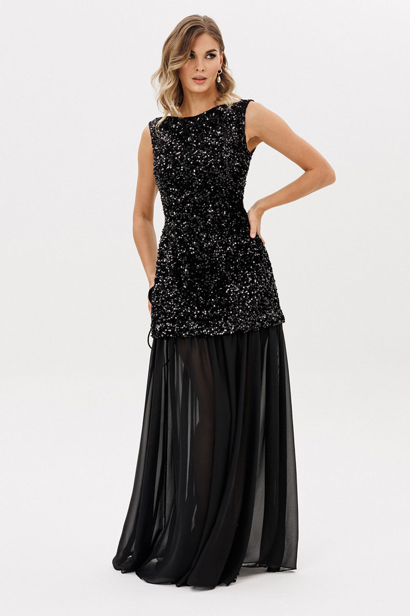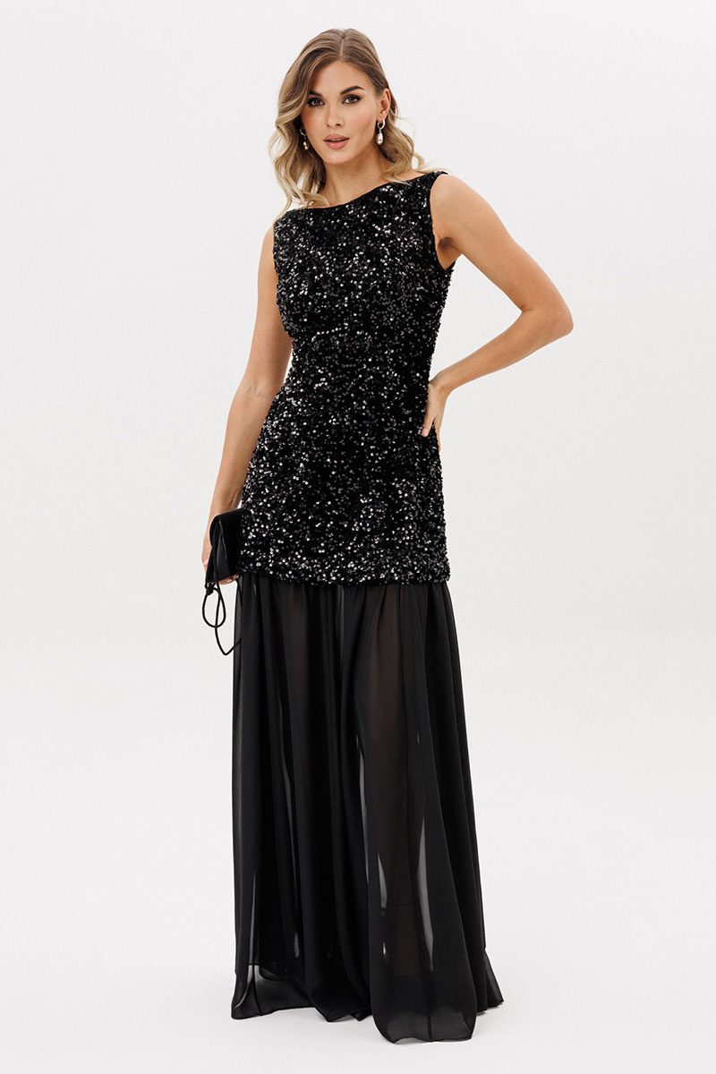 Платье выполнено из бархата с пайетками. Платье Х-образного силуэта, длиной в пол. Верх платья выполнен в виде приталенного платья длиной ниже линии бедер. Застежка на молнию с металлическими звеньями сзади в среднем шве спинки. Плечевой шов заужен. Горловина формы "лодочка". Нижняя часть платья выполнена из шифона и состоит из 8 клиньев. Верх платья на притачной по низу подкладке.