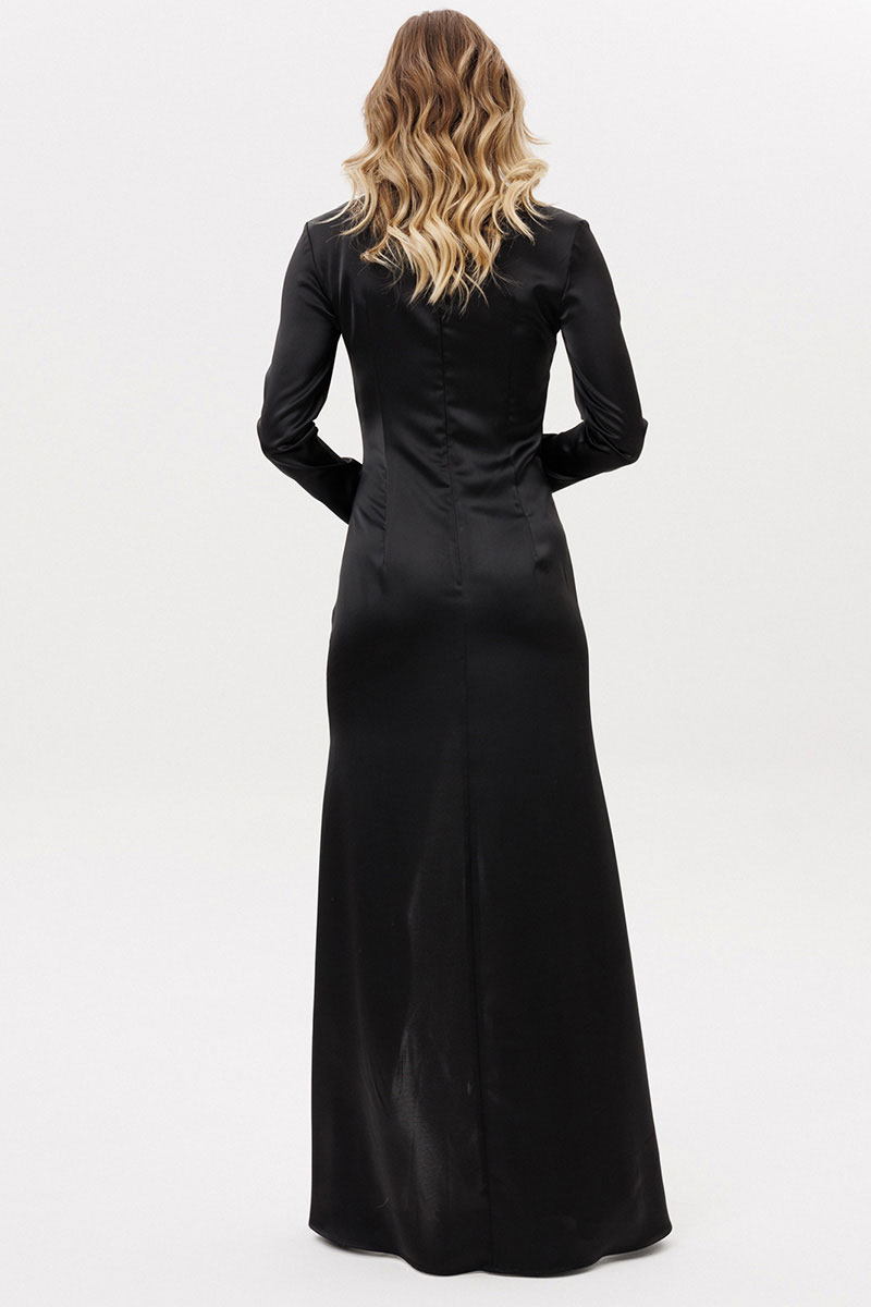 Платье выполнено из плотного атласа. Платье полуприлегающего силуэта длиной в пол. Застежка на потайную молнию сзади в среднем шве спинки, горловина округлой формы. Рукав втачного покроя, одношовный. Спереди разрез V-образной формы, декорированный пайетками.
