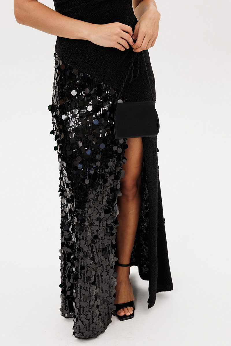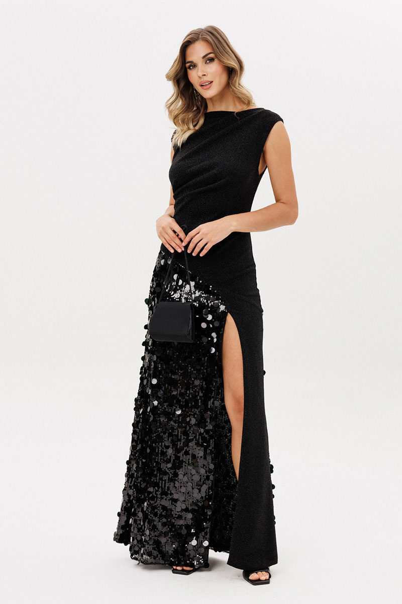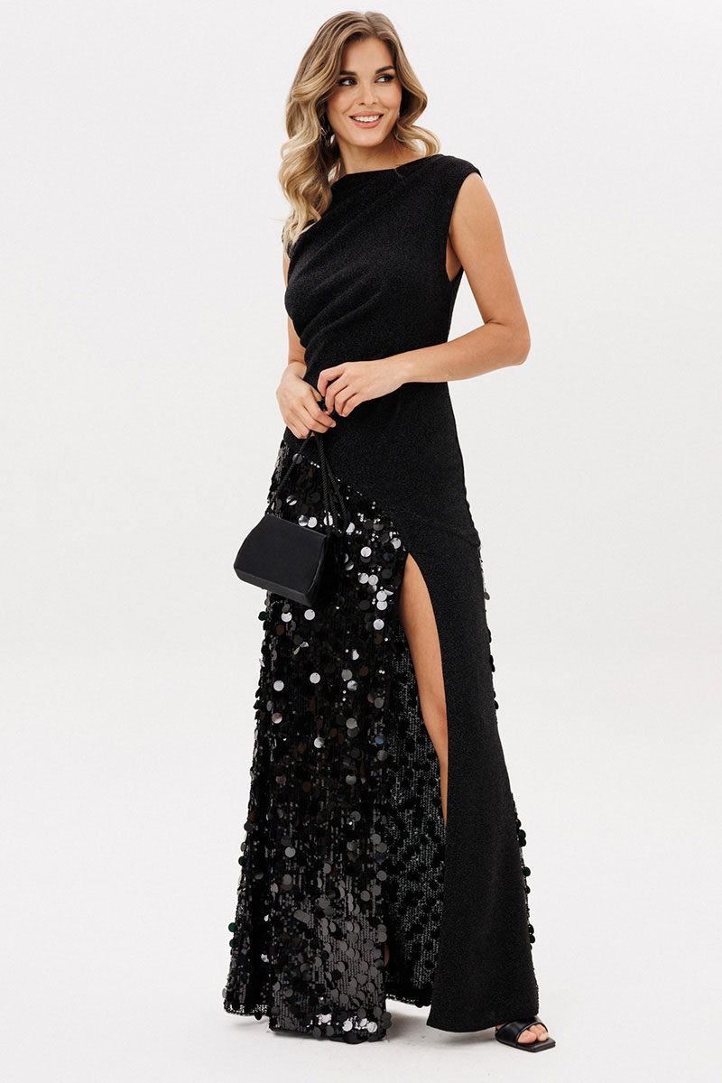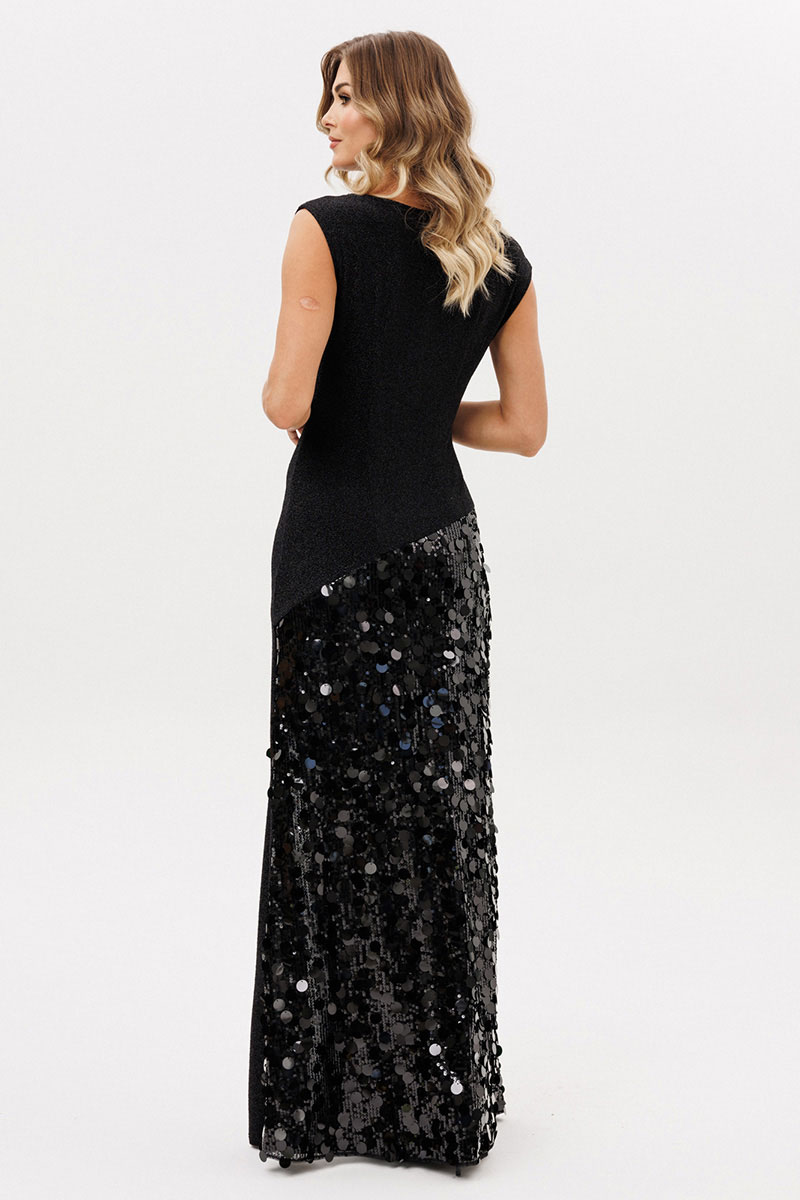 Платье выполнено из комбинации двух тканей: трикотажного полотна с блеском и крупных пайеток на сетке. Платье приталенного силуэта длиной в пол. Перед и спинка ассиметричные. Спереди драпировки от плеча и от линии талии. Горловина формы "лодочка". Правый плечевой шов удлинен. Нижняя часть платья на отлетной по низу подкладке.