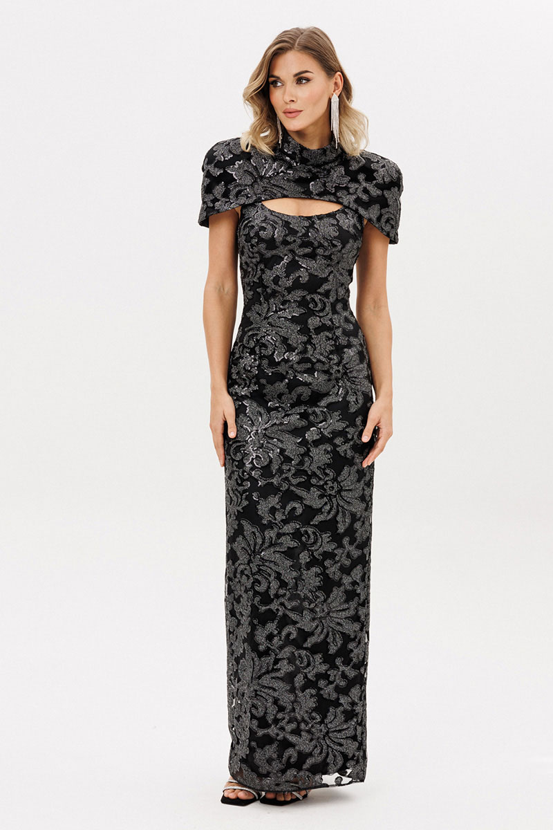 Платье выполнено из костюмно-плательной ткани вышивка на сетке с пайетками. Платье приталенного силуэта длиной миди. Застежка на потайную молнию сзади в среднем шве спинки. Горловина округлой формы, углубленная. Сзади в среднем шве разрез. Платье на отлетной по низу подкладке.