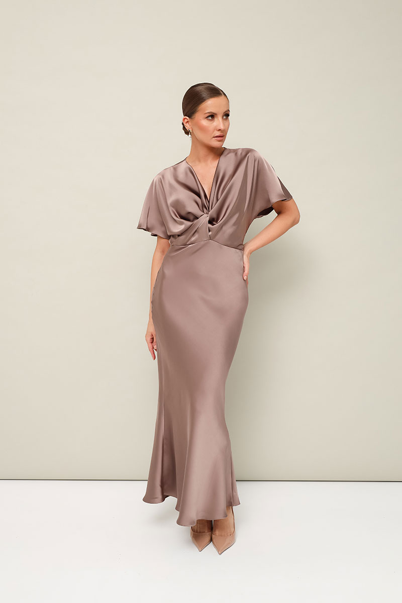 Платье полуприлегающего силуэта, отрезное по талии, выполнено из струящейся ткани с матовым блеском. V-образный вырез горловины. Спереди лифа обработан декоративный узел. Рукава короткие цельнокроеные. Спинка лифа со средним швом, по линии талии для комфорта обработана резинка. Крой юбки по косой.