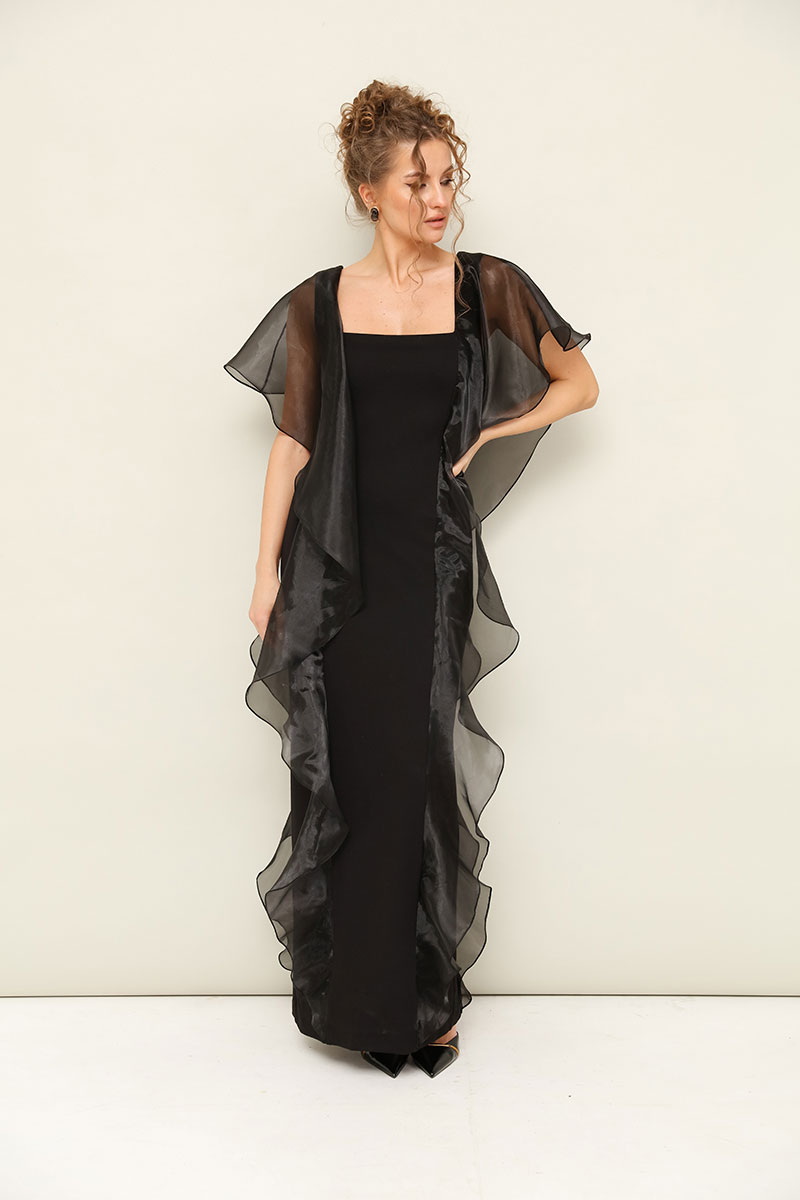 Вечернее платье в длине макси, прилегающего силуэта. Платье выполнено из трикотажного полотна и органзы. Горловина с вырезом «каре». Перед и спинка с рельефами, которые декорированы воланами из органзы. Застёжка на потайную молнию в среднем шве спинки, переходящая в шлицу.