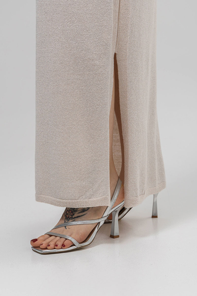 Платье полуприлегающего силуэта с вывязанной V-образной формой горловины переда и спинки. Без рукавов. Пройма вывязана по контуру. Перед и спинка выполнены переплетением кулирная гладь. Платье изготовлено из пряжи, в составе которой хлопок 50%, ПАН 50% в сочетании с метанитом.Металлизированная нить в тон пряжи вплетена таким образом, что видна и блестит с лицевой стороны изделия ,придавая ему нарядность.