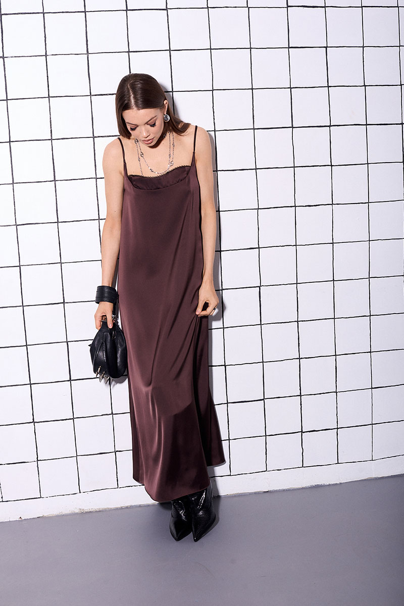 Платье прямого силуэта, длинное, на регулируемых бретелях. На переде платья расположен декоративный лиф с кружевом, на спинке вырез с фиксирующим шнурком.