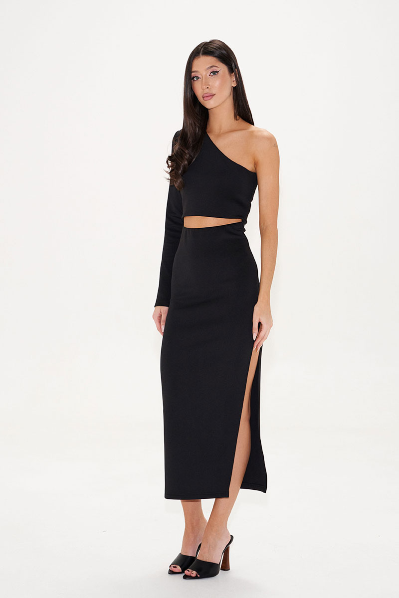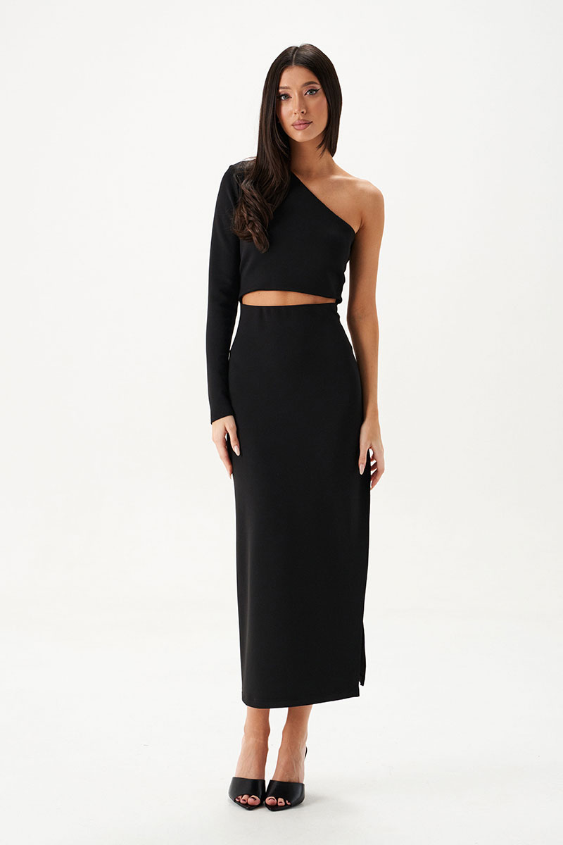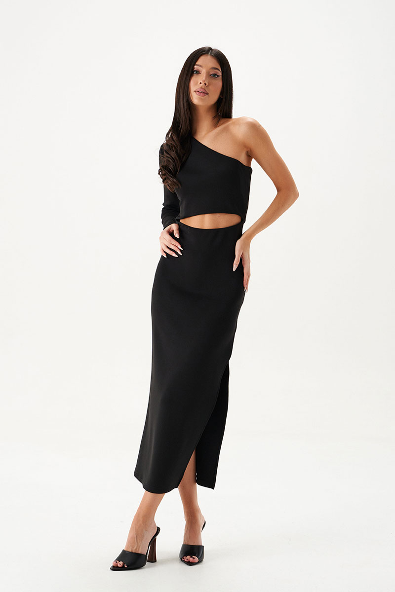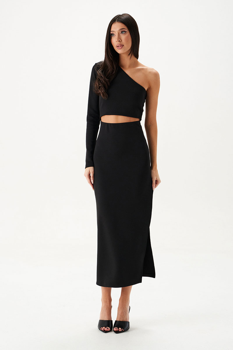 Платье на одно плечо выполнено из трикотажа черного цвета. Характеристка: платье на одно плечо с фигурным разрезом на талии по переду изделия, разрез по бокову шву - 63см.