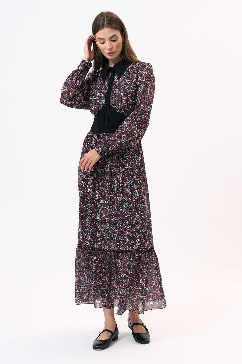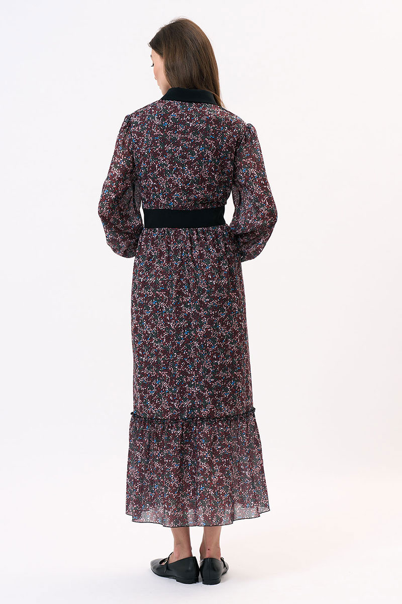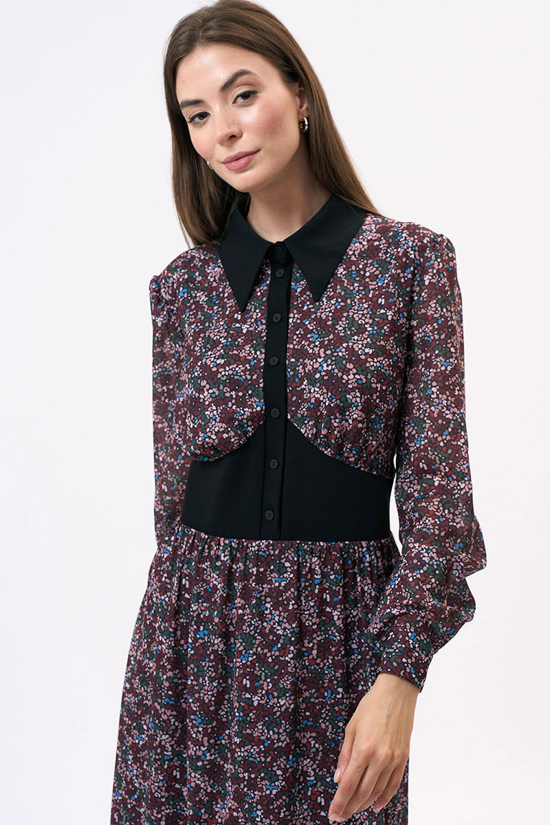 Плать полуприлегающего силуэта из шифона с дизайнерским принтом. Воротник рубашечного типа, застежка центральная на петли и пуговицы, в боковом шве обработана потайная молния. Рукав длинный, втачной с манжетой. Платье отрезное по линии талии, на эластичной тесьме. Изделие на подкладке. Возможно отличие фотографии по оттенку, связанное с разной цветопередачей монитора.
