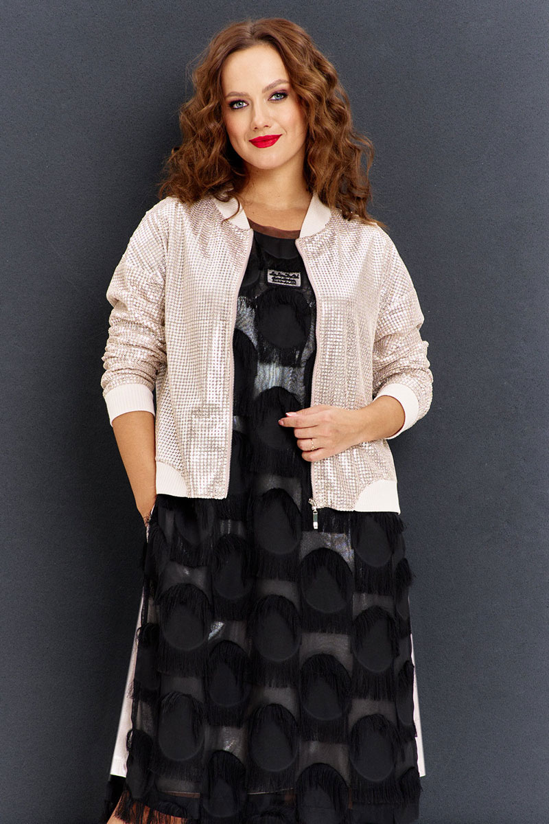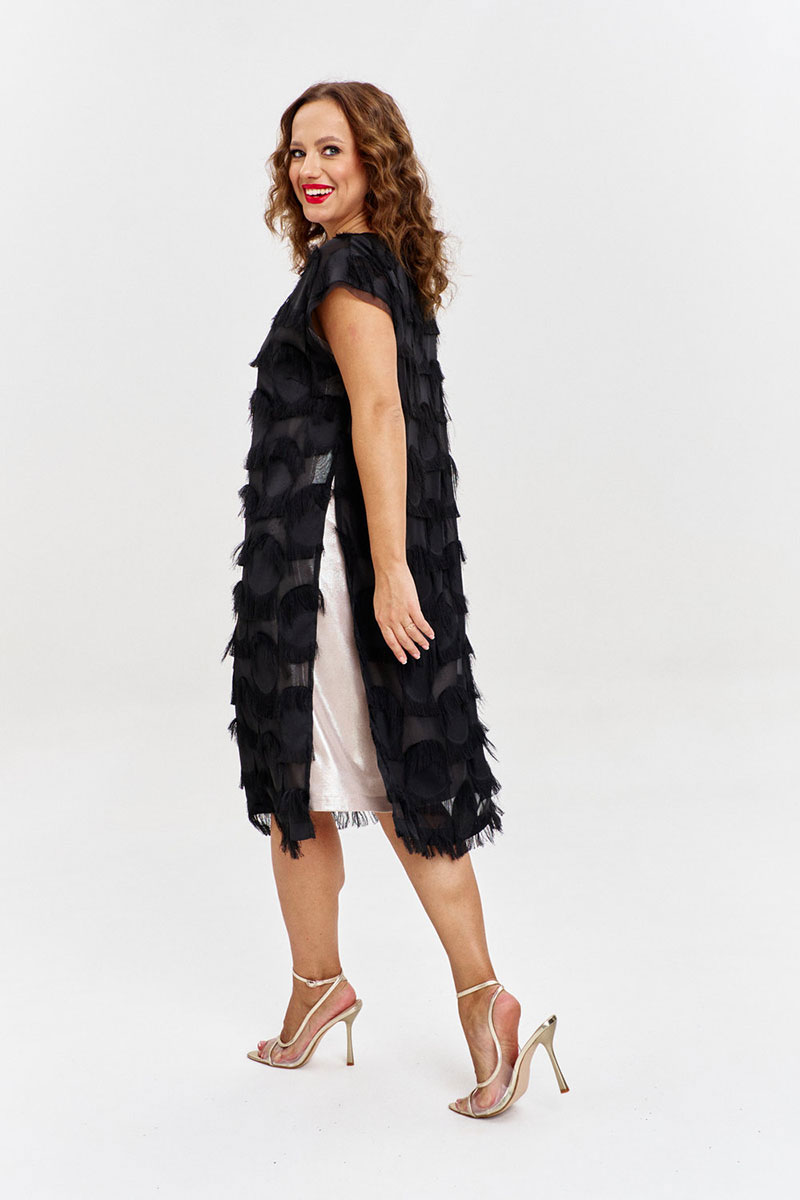 Двухслойное платье из жаккарда на шифоновой основе с бахромой, прямого силуэта, спущенным рукавом и круглой горловиной. По бокам высокие разрезы, на переде ажурная нашивка. Нижнее платье из золотистого трикотажа, без рукава, с карманами по бокам.